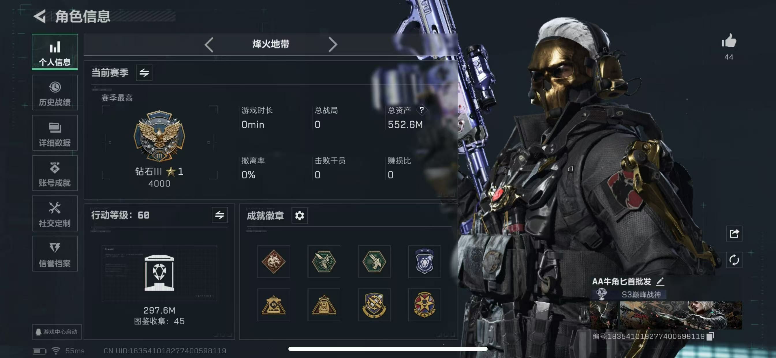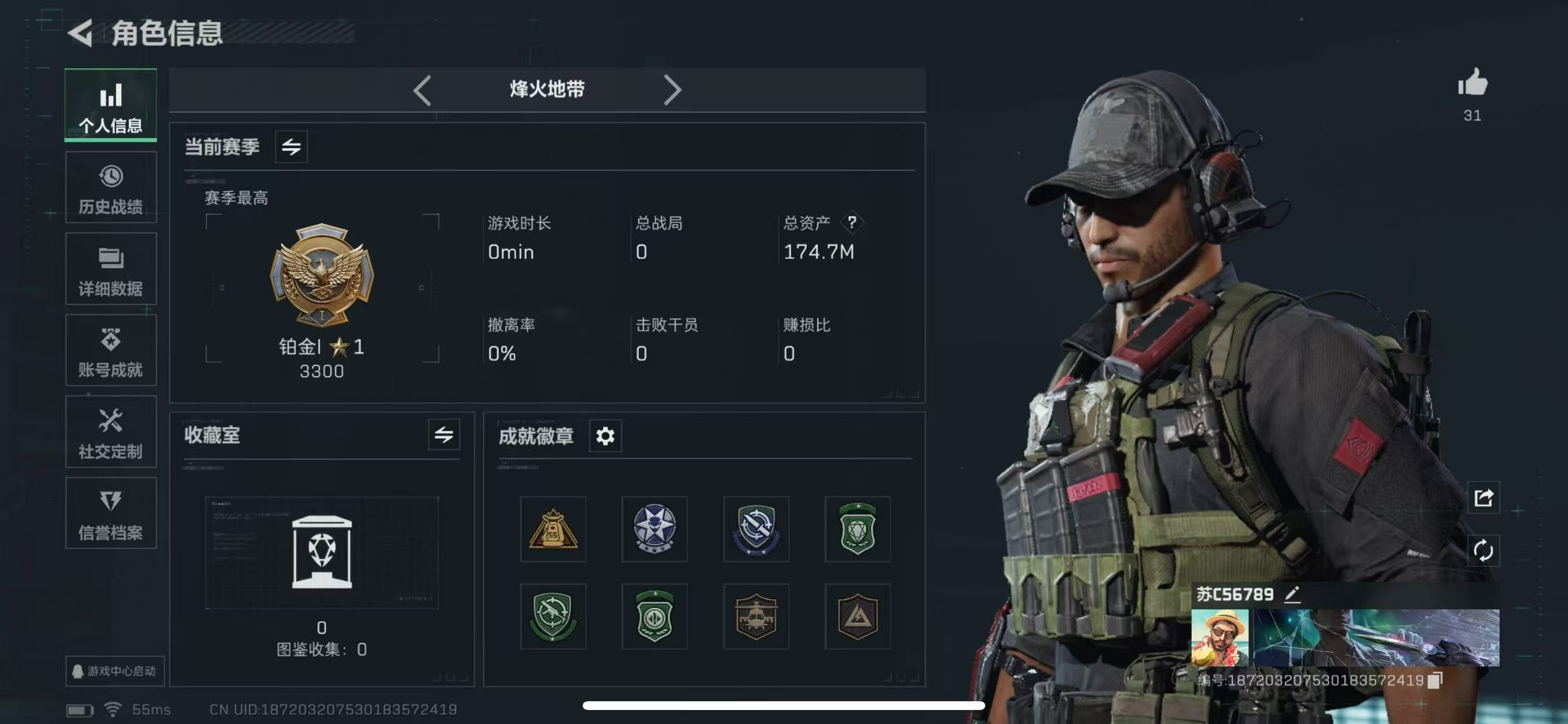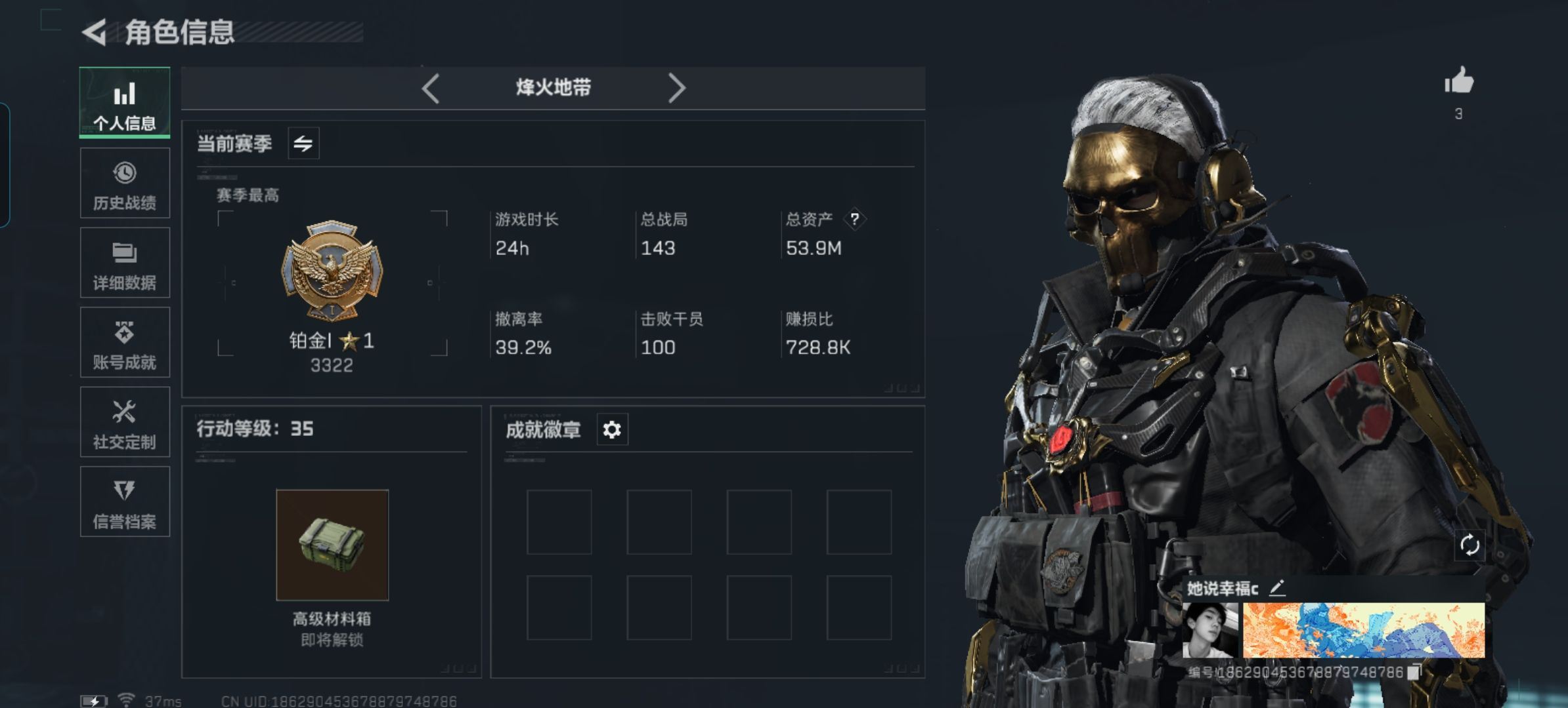 【云游堂】 汤35530总资产552M,哈夫币681k,近战-影锋/红狼-蚀金玫瑰/骇爪-水墨云图/露娜-黑天际线/威龙-壮志凌云/无名-夜鹰,仓库lv10,靶场lv7,训练中心lv7,详情看图;