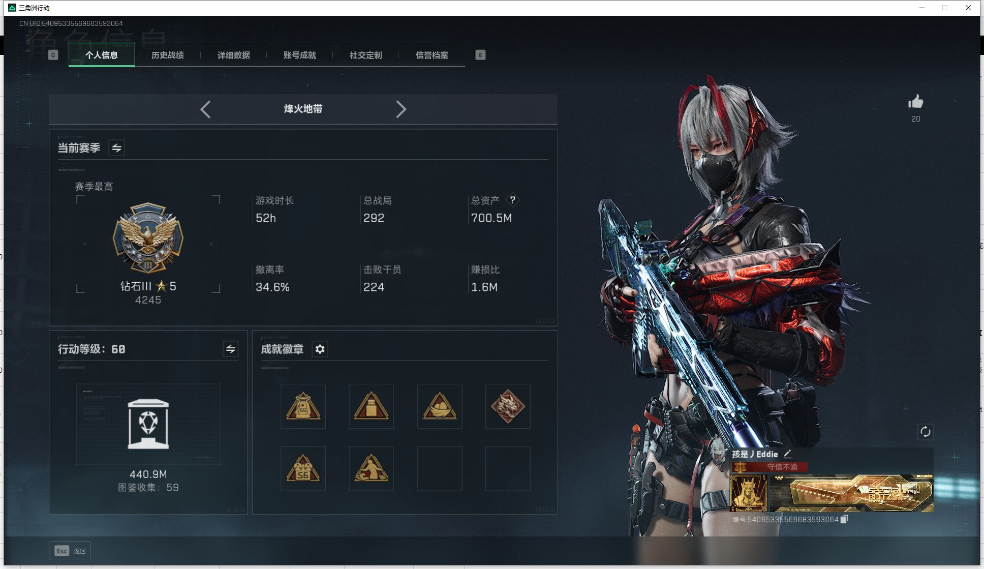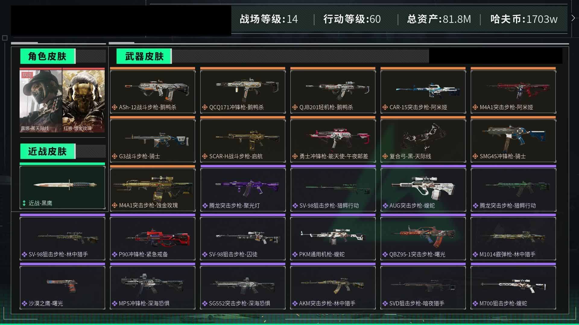 【云游堂】 【乐乐Z48】【资产700M】【现金14559K】【特勤处9566】【刀皮北极星】【电锯惊魂】【干员皮全红皮】【蚀金玫瑰】【能天使午夜邮差】【黑天际线】【水墨云图】【维什戴尔】【飞虎】【夜鹰】【送葬人】【典藏优品B K416突击步枪】【优品A AUG突击步枪-气象感应】【极品B M7战斗步枪】【极品B M7战斗步枪-棱镜攻势S2】【优品S M7战斗步枪-棱镜攻势S2】【优品C M7战斗步枪-棱镜攻势S2】【极品C SCAR-H战斗步枪-电玩高手】【优品A 腾龙突击步枪-气象感应】【极品S Vector冲锋枪-美杜莎】【优品A Vector冲锋枪-美杜莎】【仓库多六套】【AW子弹55发】【非洲之心】