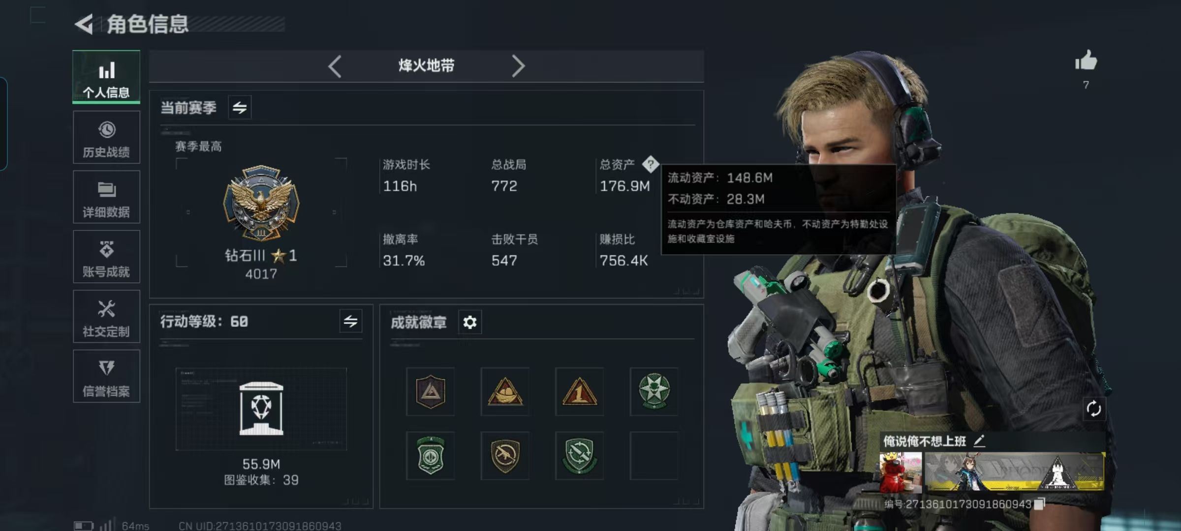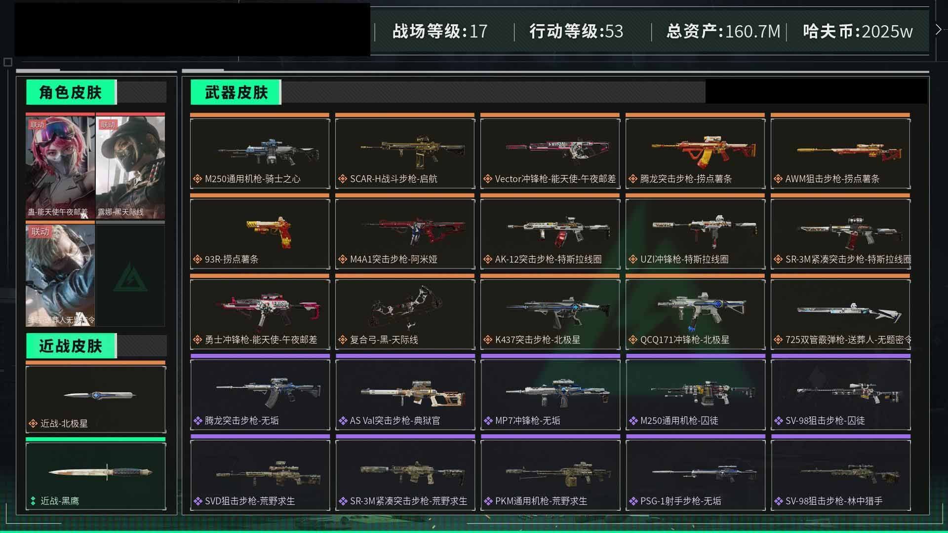 【云游堂】 惠1064467总资产160M,哈夫币2025w,枪皮数量69,战场等级:17 列兵,行动等级:53 黄金,角色皮肤数量3,蛊-能天使午夜邮差/露娜-黑天际线/蜂医-送葬人【个人信息】战场等级:17 列兵,行动等级:53 黄金【哈夫币】2025w【总资产】160M【货币】263三角币/22曼德尔币/360三角券【安全箱】基础安全箱2(1x2)/S6高级安全箱6(2x3)【通行证】烽火地带限定版【特勤处】制药台Lv.3/工作台Lv.3/仓库Lv.8/防具台Lv.1/训练中心Lv.4/靶场Lv.4/技术中心Lv.3/指挥中心Lv.3/潜水中心Lv.2/收藏室Lv.1【角色皮肤】蛊-能天使午夜邮差/露娜-黑天际线/蜂医-送葬人无题密令/【已拥有捆绑包】北极星捆绑包/捞点薯条捆绑包/特斯拉线圈捆绑包/【近战皮肤】近战-黑鹰/近战-北极星/【步枪皮肤】AKM突击步枪-林中猎手/K437突击步枪-北极星/AS Val突击步枪-典狱官/腾龙突击步枪-无垢/SR-3M紧凑突击步枪-荒野求生/M4A1突击步枪-阿米娅/腾龙突击步枪-捞点薯条/AK-12突击步枪-特斯拉线圈/SR-3M紧凑突击步枪-特斯拉线圈/SCAR-H战斗步枪-启航/【冲锋枪皮肤】UZI冲锋枪-特斯拉线圈/QCQ171冲锋枪-北极星/MP7冲锋枪-无垢/勇士冲锋枪-能天使-午夜邮差/Vector冲锋枪-能天使-午夜邮差/【霰弹枪皮肤】M1014霰弹枪-林中猎手/725双管霰弹枪-送葬人-无题密令/【轻机枪皮肤】PKM通用机枪-荒野求生/M250通用机枪-囚徒/M250通用机枪-骑士之心/【精准射手步枪皮肤】PSG-1射手步枪-无垢/【狙击步枪皮肤】SV-98狙击步枪-囚徒/SV-98狙击步枪-林中猎手/SVD狙击步枪-荒野求生/AWM狙击步枪-捞点薯条/【手枪皮肤】93R-捞点薯条/【特殊武器】复合弓-黑-天际线/【挂饰】挂饰-启程/挂饰-彩蛋/挂饰-北极星/阿萨拉霰弹兵/阿萨拉狙击兵/挂饰-晶石幻想/挂饰-阿米娅/挂饰-来点薯条/挂饰-能天使/挂饰-特斯拉线圈/阿萨拉徽章/【载具】M1A4坦克-丛林猎手/M1A4坦克-紫电/防空车-警戒线/轮式突击炮-紫电/突击直升机-紫电/侦察直升机-紫电/全地形车-警戒线/GTQ35坦克-紫电/(典藏皮肤颜色请以典藏展示为准,安全箱等时效性道具请以游戏内数据为准)