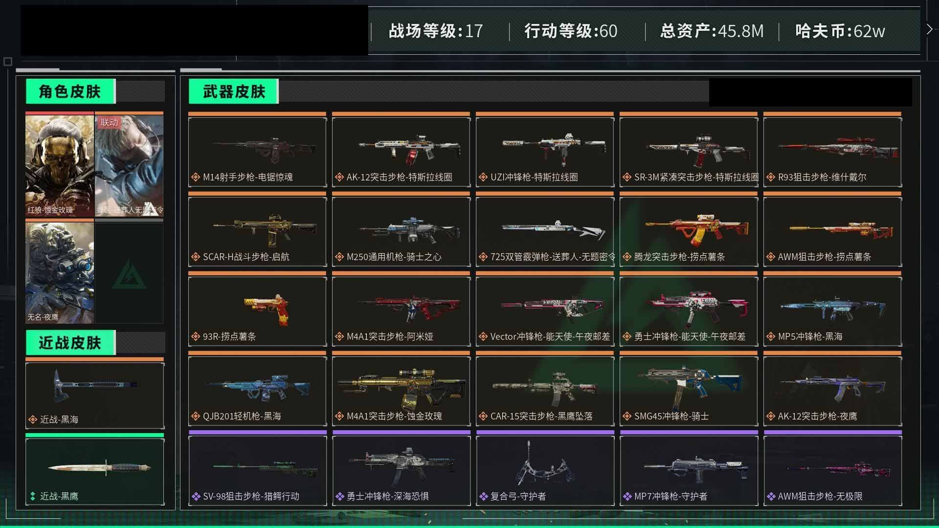 【云游堂】 惠1794083总资产45M,哈夫币62w,枪皮数量165,战场等级:17 列兵,行动等级:60 三角洲巅峰,角色皮肤数量3,红狼-蚀金玫瑰/蜂医-送葬人无题密令/无名-夜鹰【个人信息】战场等级:17 列兵,行动等级:60 三角洲巅峰【哈夫币】62w【总资产】45M【货币】21三角币/96曼德尔币/31三角券【安全箱】基础安全箱2(1x2)/S6高级安全箱6(2x3)/S6顶级安全箱9(3x3)【通行证】烽火地带限定版【特勤处】制药台Lv.3/工作台Lv.3/仓库Lv.8/防具台Lv.3/训练中心Lv.6/靶场Lv.5/技术中心Lv.3/指挥中心Lv.5/潜水中心Lv.0/收藏室Lv.0【角色皮肤】红狼-蚀金玫瑰/无名-夜鹰/蜂医-送葬人无题密令/【已拥有捆绑包】猎宝团捆绑包/黑海捆绑包/捞点薯条捆绑包/特斯拉线圈捆绑包/【近战皮肤】近战-黑鹰/近战-黑海/【步枪皮肤】M4A1突击步枪-蚀金玫瑰/CAR-15突击步枪-黑鹰坠落/AKM突击步枪-猎宝团/ASh-12战斗步枪-猎宝团/AK-12突击步枪-夜鹰/SG552突击步枪-尖端治疗/AS Val突击步枪-尖端治疗/ASh-12战斗步枪-守夜人/AKM突击步枪-林中猎手/PTR-32突击步枪-英雄/腾龙突击步枪-无垢/M16A4突击步枪-竞赛选手/SR-3M紧凑突击步枪-荒野求生/M4A1突击步枪-阿米娅/腾龙突击步枪-捞点薯条/AK-12突击步枪-特斯拉线圈/SR-3M紧凑突击步枪-特斯拉线圈/SCAR-H战斗步枪-启航/SR-3M紧凑突击步枪-战术竞备/【冲锋枪皮肤】UZI冲锋枪-特斯拉线圈/MP5冲锋枪-黑海/MP5冲锋枪-深海恐惧/勇士冲锋枪-深海恐惧/SMG45冲锋枪-骑士/MP7冲锋枪-无垢/勇士冲锋枪-能天使-午夜邮差/Vector冲锋枪-能天使-午夜邮差/P90冲锋枪-紧急戒备/MP7冲锋枪-守护者/勇士冲锋枪-工业狂潮/MP5冲锋枪-战术竞备/【霰弹枪皮肤】S12K霰弹枪-猎宝团/M1014霰弹枪-林中猎手/725双管霰弹枪-送葬人-无题密令/【轻机枪皮肤】QJB201轻机枪-黑海/PKM通用机枪-守夜人/PKM通用机枪-荒野求生/M250通用机枪-骑士之心/【精准射手步枪皮肤】M14射手步枪-黑鹰坠落/SR-25射手步枪-尖端治疗/PSG-1射手步枪-无垢/M14射手步枪-电锯惊魂/【狙击步枪皮肤】M700狙击步枪-竞技风/R93狙击步枪-维什戴尔/M700狙击步枪-蝮蛇/SVD狙击步枪-暗夜猎手/M700狙击步枪-守夜人/SV-98狙击步枪-林中猎手/SVD狙击步枪-荒野求生/AWM狙击步枪-捞点薯条/SV-98狙击步枪-猎鳄行动/【手枪皮肤】沙漠之鹰-曙光/.357左轮-幸运时刻/93R-捞点薯条/【特殊武器】复合弓-守护者/【挂饰】挂饰-骑士之心/挂饰-启程/挂饰-蚀金玫瑰/挂饰-黑海/演出导演/重装记者/挂饰-小羊/挂饰-彩蛋/乐队纪念/挂饰-晶石幻想/挂饰-阿米娅/挂饰-来点薯条/挂饰-能天使/挂饰-特斯拉线圈/(典藏皮肤颜色请以典藏展示为准,安全箱等时效性道具请以游戏内数据为准)