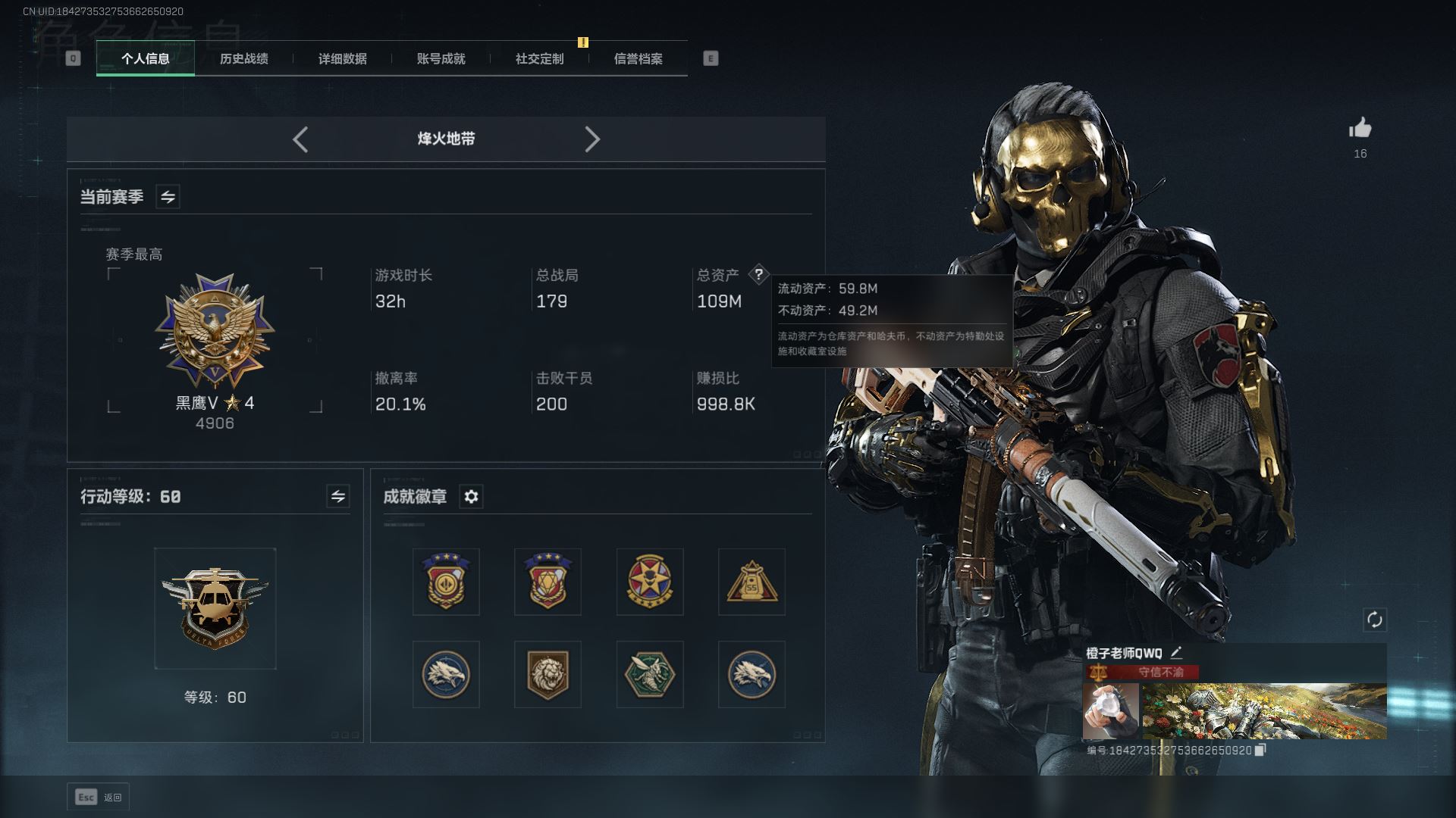 【云游堂】 汤33136总资产202M,哈夫币13402k,近战-北极星/影锋,骇爪-水墨云图/威龙-壮志凌云,仓库lv9,靶场lv6,训练中心lv7,详情看图;