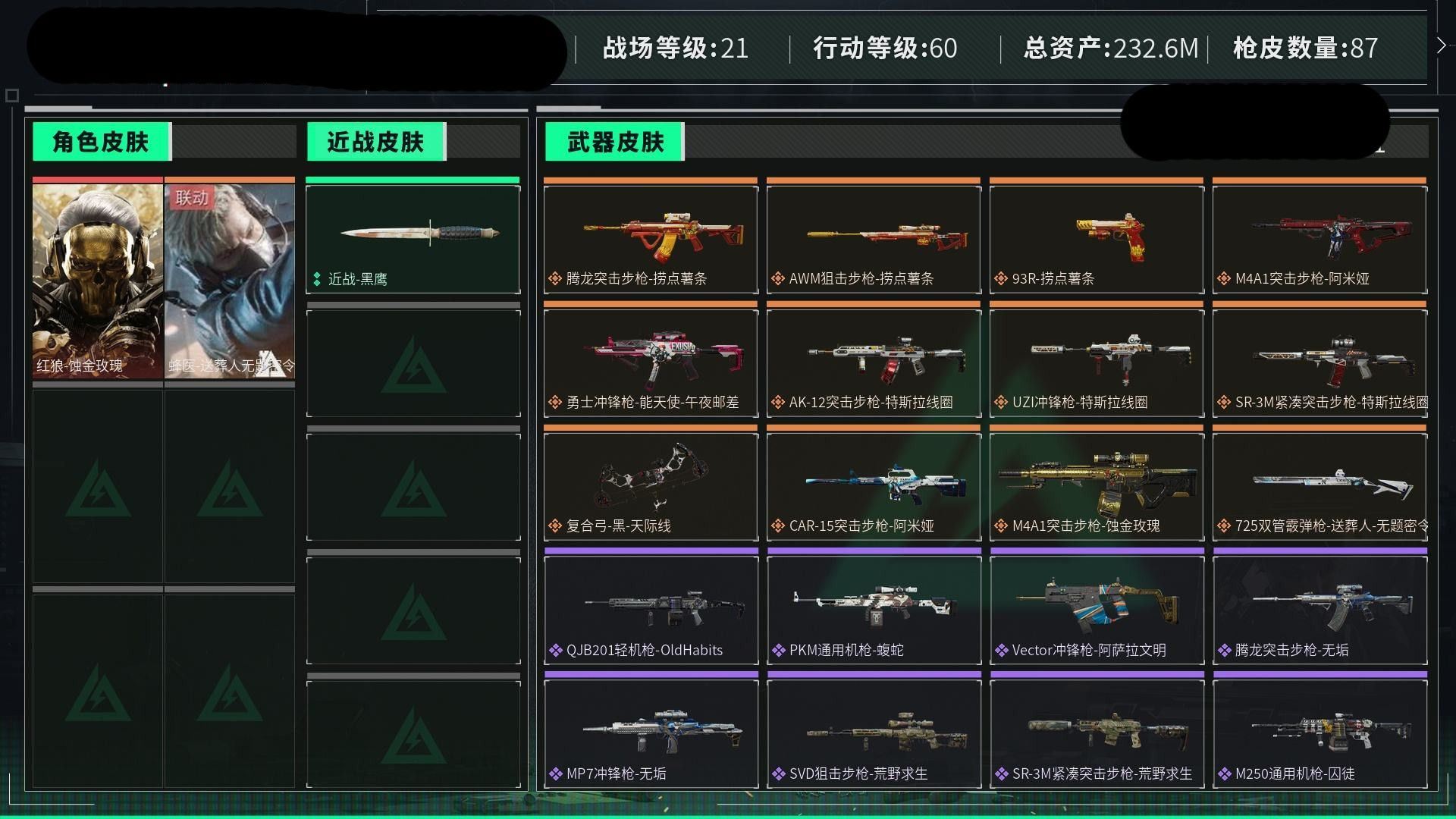 【云游堂】 汤15331 总资产232M,哈夫币6478w,红狼-蚀金玫瑰/蜂医-送葬人无题密令,枪皮数量87,战场等级:21 军士长,行动等级:60 青铜,近战-黑鹰,安全箱等时效性道具请以游戏内数据为准;详情请看图【个人信息】战场等级:21 军士长,行动等级:60 青铜【哈夫币】6478w【总资产】232M【烽火地带专区】总资产200M以上【货币】400三角币/0曼德尔币/295三角券【安全箱】基础安全箱2(1x2)【通行证】三角洲豪华版【特勤处】制药台Lv.3/工作台Lv.3/仓库Lv.7/防具台Lv.3/训练中心Lv.7/靶场Lv.7/技术中心Lv.3/指挥中心Lv.6/潜水中心Lv.2/收藏室Lv.2【角色皮肤】红狼-蚀金玫瑰/蜂医-送葬人无题密令/【已拥有捆绑包】捞点薯条捆绑包/特斯拉线圈捆绑包/【近战皮肤】近战-黑鹰/【步枪皮肤】M4A1突击步枪-蚀金玫瑰/QBZ95-1突击步枪-曙光/腾龙突击步枪-无垢/SCAR-H战斗步枪-囚徒/SR-3M紧凑突击步枪-荒野求生/CAR-15突击步枪-阿米娅/M4A1突击步枪-阿米娅/腾龙突击步枪-捞点薯条/AK-12突击步枪-特斯拉线圈/SR-3M紧凑突击步枪-特斯拉线圈/【冲锋枪皮肤】UZI冲锋枪-特斯拉线圈/Vector冲锋枪-阿萨拉文明/MP7冲锋枪-无垢/勇士冲锋枪-能天使-午夜邮差/P90冲锋枪-紧急戒备/【霰弹枪皮肤】S12K霰弹枪-曙光/725双管霰弹枪-送葬人-无题密令/【轻机枪皮肤】PKM通用机枪-蝮蛇/PKM通用机枪-荒野求生/M250通用机枪-囚徒/QJB201轻机枪-OldHabits/【精准射手步枪皮肤】PSG-1射手步枪-无垢/【狙击步枪皮肤】SV-98狙击步枪-囚徒/SV-98狙击步枪-林中猎手/SVD狙击步枪-荒野求生/AWM狙击步枪-捞点薯条/【手枪皮肤】93R-捞点薯条/【特殊武器】复合弓-黑-天际线/【挂饰】挂饰-枪匠/挂饰-蚀金玫瑰/阿萨拉霰弹兵/阿萨拉狙击兵/挂饰-晶石幻想/挂饰-阿米娅/挂饰-来点薯条/挂饰-特斯拉线圈/阿萨拉徽章/【载具】M1A4坦克-丛林猎手/M1A4坦克-紫电/防空车-警戒线/轮式突击炮-紫电/突击直升机-紫电/侦察直升机-紫电/全地形车-警戒线/GTQ35坦克-紫电/(典藏皮肤颜色请以典藏展示为准,安全箱等时效性道具请以游戏内数据为准)