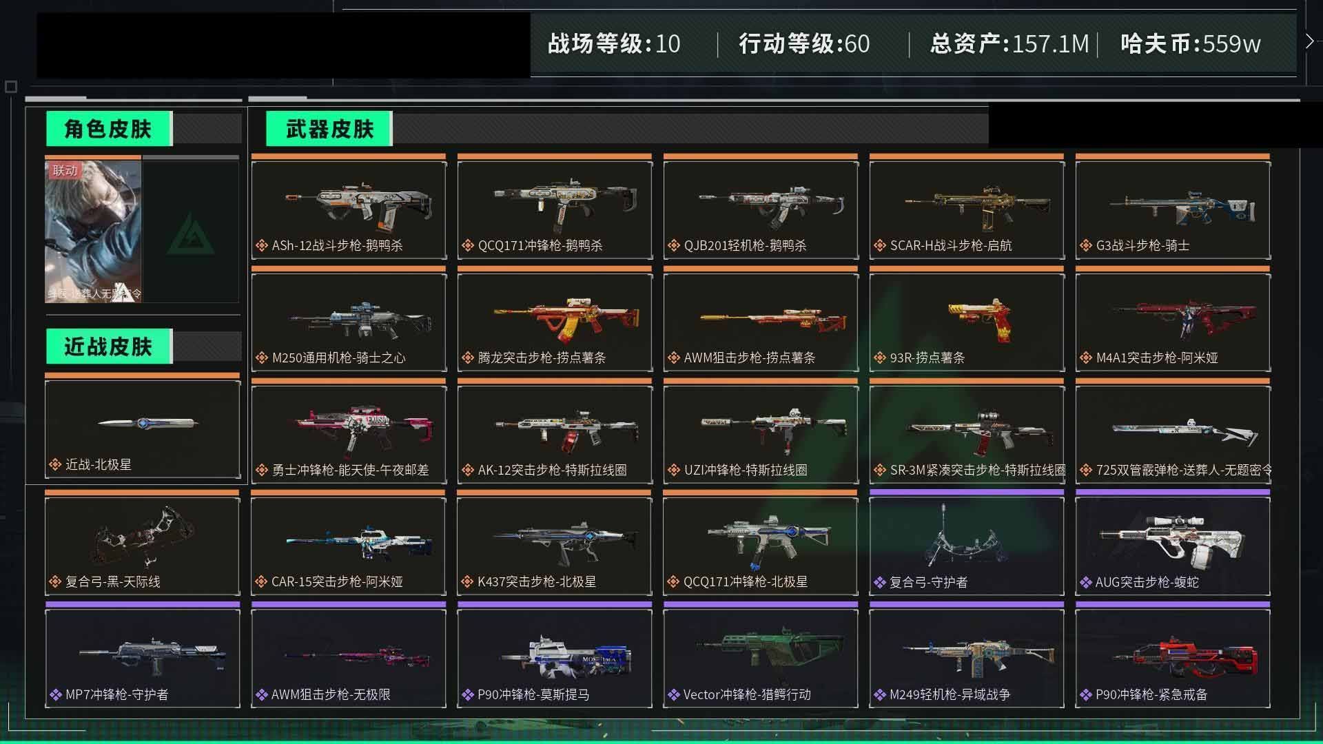 【云游堂】 惠3843734总资产157M,哈夫币559w,枪皮数量147,战场等级:10 列兵,行动等级:60 铂金,角色皮肤数量1,蜂医-送葬人无题密令,近战-北极星/近战-黑鹰【个人信息】战场等级:10 列兵,行动等级:60 铂金【哈夫币】559w【总资产】157M【货币】95三角币/4曼德尔币/260三角券【安全箱】基础安全箱2(1x2)/S6高级安全箱6(2x3)【通行证】烽火地带限定版【特勤处】制药台Lv.3/工作台Lv.3/仓库Lv.8/防具台Lv.3/训练中心Lv.6/靶场Lv.6/技术中心Lv.3/指挥中心Lv.5/潜水中心Lv.1/收藏室Lv.1【角色皮肤】蜂医-送葬人无题密令/【已拥有捆绑包】北极星捆绑包/捞点薯条捆绑包/特斯拉线圈捆绑包/【近战皮肤】近战-黑鹰/近战-北极星/【步枪皮肤】AUG突击步枪-蝮蛇/SG552突击步枪-深海恐惧/AKM突击步枪-林中猎手/PTR-32突击步枪-英雄/K437突击步枪-北极星/AS Val突击步枪-典狱官/腾龙突击步枪-无垢/SCAR-H战斗步枪-囚徒/M16A4突击步枪-竞赛选手/SR-3M紧凑突击步枪-荒野求生/CAR-15突击步枪-阿米娅/M4A1突击步枪-阿米娅/腾龙突击步枪-捞点薯条/AK-12突击步枪-特斯拉线圈/SR-3M紧凑突击步枪-特斯拉线圈/G3战斗步枪-骑士/ASh-12战斗步枪-鹅鸭杀/SCAR-H战斗步枪-启航/SR-3M紧凑突击步枪-战术竞备/【冲锋枪皮肤】UZI冲锋枪-特斯拉线圈/Vector冲锋枪-潜袭者/勇士冲锋枪-深海恐惧/QCQ171冲锋枪-北极星/MP7冲锋枪-无垢/勇士冲锋枪-能天使-午夜邮差/P90冲锋枪-紧急戒备/Vector冲锋枪-猎鳄行动/MP7冲锋枪-守护者/P90冲锋枪-莫斯提马/QCQ171冲锋枪-鹅鸭杀/【霰弹枪皮肤】S12K霰弹枪-曙光/M870霰弹枪-飓风行动/M1014霰弹枪-林中猎手/725双管霰弹枪-送葬人-无题密令/【轻机枪皮肤】PKM通用机枪-荒野求生/QJB201轻机枪-OldHabits/M249轻机枪-异域战争/M250通用机枪-骑士之心/QJB201轻机枪-鹅鸭杀/【精准射手步枪皮肤】PSG-1射手步枪-无垢/【狙击步枪皮肤】SV-98狙击步枪-囚徒/SV-98狙击步枪-林中猎手/SVD狙击步枪-荒野求生/AWM狙击步枪-捞点薯条/【手枪皮肤】93R-捞点薯条/【特殊武器】复合弓-黑-天际线/复合弓-守护者/【挂饰】诡影狙击兵/诡影喷火兵/挂饰-大白鹅/挂饰-启程/挂饰-彩蛋/挂饰-北极星/阿萨拉霰弹兵/挂饰-晶石幻想/挂饰-阿米娅/挂饰-来点薯条/挂饰-特斯拉线圈/阿萨拉徽章/紧急会议/(典藏皮肤颜色请以典藏展示为准,安全箱等时效性道具请以游戏内数据为准)