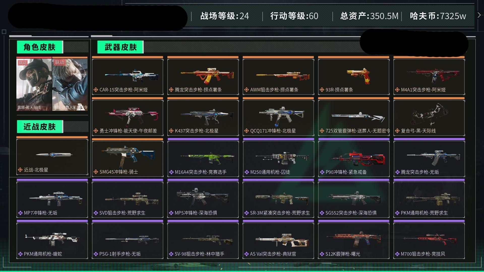 【云游堂】 汤38960总资产350M,哈夫币7325w,近战-北极星,露娜-黑天际线/蜂医-送葬人无题密令,枪皮数量106,战场等级:24 上等兵,行动等级:60 铂金,安全箱等时效性道具请以游戏内数据为准;详情请看图【个人信息】战场等级:24 上等兵,行动等级:60 铂金【哈夫币】7325w【总资产】350M【货币】24三角币/0曼德尔币/80三角券【安全箱】基础安全箱2(1x2)【通行证】通行证免费版【特勤处】制药台Lv.3/工作台Lv.3/仓库Lv.7/防具台Lv.3/训练中心Lv.7/靶场Lv.4/技术中心Lv.3/指挥中心Lv.4/潜水中心Lv.1/收藏室Lv.1【角色皮肤】露娜-黑天际线/蜂医-送葬人无题密令【已拥有捆绑包】北极星捆绑包/捞点薯条捆绑包/【近战皮肤】近战-黑鹰/近战-北极星/【步枪皮肤】SG552突击步枪-深海恐惧/K437突击步枪-北极星/AS Val突击步枪-典狱官/腾龙突击步枪-无垢/M16A4突击步枪-竞赛选手/SR-3M紧凑突击步枪-荒野求生/CAR-15突击步枪-阿米娅/M4A1突击步枪-阿米娅/腾龙突击步枪-捞点薯条/【冲锋枪皮肤】MP5冲锋枪-深海恐惧/SMG45冲锋枪-骑士/QCQ171冲锋枪-北极星/MP7冲锋枪-无垢/勇士冲锋枪-能天使-午夜邮差/P90冲锋枪-紧急戒备/【霰弹枪皮肤】S12K霰弹枪-曙光/725双管霰弹枪-送葬人-无题密令/【轻机枪皮肤】PKM通用机枪-蝮蛇/PKM通用机枪-英雄/PKM通用机枪-荒野求生/M250通用机枪-囚徒/【精准射手步枪皮肤】PSG-1射手步枪-无垢/【狙击步枪皮肤】SVD狙击步枪-阿萨拉工艺/M700狙击步枪-竞技风/SV-98狙击步枪-林中猎手/SVD狙击步枪-荒野求生/AWM狙击步枪-捞点薯条/【手枪皮肤】93R-捞点薯条/【特殊武器】复合弓-黑-天际线【挂饰】低音艺术家/阿萨拉机枪兵/挂饰-北极星/阿萨拉霰弹兵/阿萨拉狙击兵/挂饰-晶石幻想/挂饰-阿米娅/挂饰-来点薯条/阿萨拉徽章/【载具】M1A4坦克-丛林猎手/M1A4坦克-紫电/防空车-警戒线/轮式突击炮-紫电/突击直升机-紫电/侦察直升机-紫电/全地形车-警戒线/GTQ35坦克-紫电/(典藏皮肤颜色请以典藏展示为准,安全箱等时效性道具请以游戏内数据为准)