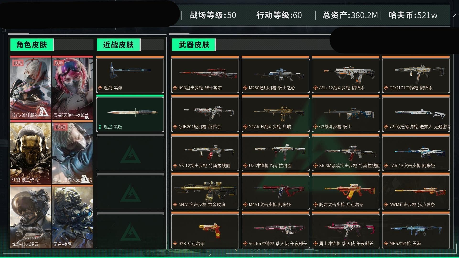 【云游堂】 汤34245总资产380M,哈夫币521w,82发awm子弹,近战-黑海,红狼-蚀金玫瑰/骇爪-维什戴尔/蛊-能天使午夜邮差/威龙-壮志凌云/无名-夜鹰/蜂医-送葬人无题密令/【个人信息】战场等级:50 军士长,行动等级:60 黄金【哈夫币】521w【总资产】380M【货币】125三角币/0曼德尔币/158三角券【安全箱】基础安全箱2(1x2)/S6顶级安全箱9(3x3)【通行证】烽火地带限定版【特勤处】制药台Lv.3/工作台Lv.3/仓库Lv.9/防具台Lv.3/训练中心Lv.7/靶场Lv.6/技术中心Lv.3/指挥中心Lv.6/潜水中心Lv.1/收藏室Lv.1【角色皮肤】骇爪-维什戴尔/蛊-能天使午夜邮差/红狼-蚀金玫瑰/威龙-壮志凌云/无名-夜鹰/蜂医-送葬人无题密令/【已拥有捆绑包】趣味贴纸捆绑包/黑海捆绑包/捞点薯条捆绑包/特斯拉线圈捆绑包/【近战皮肤】近战-黑鹰/近战-黑海/【步枪皮肤】M4A1突击步枪-蚀金玫瑰/QBZ95-1突击步枪-曙光/SCAR-H战斗步枪-铁艺苍穹/QBZ95-1突击步枪-ACE/K416突击步枪-潜袭者/AUG突击步枪-蝮蛇/AUG突击步枪-特勤执行/M4A1突击步枪-特勤执行/SCAR-H战斗步枪-趣味贴纸/M4A1突击步枪-趣味贴纸/PTR-32突击步枪-ACE/AK-12突击步枪-夜鹰/SG552突击步枪-深海恐惧/SG552突击步枪-尖端治疗/AS Val突击步枪-尖端治疗/ASh-12战斗步枪-守夜人/AKM突击步枪-林中猎手/PTR-32突击步枪-英雄/腾龙突击步枪-无垢/SR-3M紧凑突击步枪-荒野求生/CAR-15突击步枪-阿米娅/M4A1突击步枪-阿米娅/腾龙突击步枪-捞点薯条/AK-12突击步枪-特斯拉线圈/SR-3M紧凑突击步枪-特斯拉线圈/K437突击步枪-守护者/ASh-12战斗步枪-无极限/G3战斗步枪-骑士/ASh-12战斗步枪-鹅鸭杀/SCAR-H战斗步枪-启航/SR-3M紧凑突击步枪-战术竞备/【冲锋枪皮肤】UZI冲锋枪-特斯拉线圈/Vector冲锋枪-阿萨拉文明/Vector冲锋枪-红色彗星/MP5冲锋枪-趣味贴纸/MP5冲锋枪-黑海/MP5冲锋枪-深海恐惧/勇士冲锋枪-深海恐惧/SMG45冲锋枪-骑士/MP7冲锋枪-无垢/勇士冲锋枪-能天使-午夜邮差/Vector冲锋枪-能天使-午夜邮差/P90冲锋枪-暗影猎手/P90冲锋枪-紧急戒备/Vector冲锋枪-猎鳄行动/MP7冲锋枪-守护者/P90冲锋枪-莫斯提马/QCQ171冲锋枪-鹅鸭杀/MP5冲锋枪-战术竞备/【霰弹枪皮肤】S12K霰弹枪-曙光/M1014霰弹枪-潜袭者/M1014霰弹枪-林中猎手/725双管霰弹枪-送葬人-无题密令/【轻机枪皮肤】PKM通用机枪-蝮蛇/PKM通用机枪-英雄/QJB201轻机枪-黑海/PKM通用机枪-守夜人/PKM通用机枪-荒野求生/M250通用机枪-囚徒/QJB201轻机枪-OldHabits/M249轻机枪-异域战争/M250通用机枪-骑士之心/QJB201轻机枪-鹅鸭杀/【精准射手步枪皮肤】SKS射手步枪-ACE/SR-25射手步枪-战场英杰/M14射手步枪-黑鹰坠落/SR-25射手步枪-尖端治疗/PSG-1射手步枪-无垢/Mini-14射手步枪-守护者/【狙击步枪皮肤】SVD狙击步枪-阿萨拉工艺/M700狙击步枪-竞技风/SV-98狙击步枪-囚徒/R93狙击步枪-维什戴尔/M700狙击步枪-蝮蛇/M700狙击步枪-守夜人/SV-98狙击步枪-林中猎手/SVD狙击步枪-荒野求生/AWM狙击步枪-捞点薯条/【手枪皮肤】沙漠之鹰-曙光/93R-捞点薯条/【特殊武器】复合弓-守护者/【挂饰】骇客纪元(A)/挂饰-巡飞弹发射器/挂饰-磁吸炸弹/挂饰-三联装手炮/挂饰-复合弓/挂饰-枪匠/火箭玫瑰/诡影狙击兵/诡影喷火兵/挂饰-骑士之心/挂饰-维什戴尔/挂饰-大白鹅/挂饰-启程/挂饰-蚀金玫瑰/挂饰-王牌座驾/挂饰-黑海/挂饰-小羊/挂饰-彩蛋/乐队纪念/阿萨拉喷火兵/阿萨拉霰弹兵/挂饰-晶石幻想/挂饰-阿米娅/挂饰-来点薯条/挂饰-能天使/挂饰-特斯拉线圈/阿萨拉徽章/紧急会议/【载具】M1A4坦克-黑骑士/M1A4坦克-烈焰/步战车-无瑕/步战车-黑骑士/步战车-卦象/步战车-凝视/防空车-黑骑士/防空车-卦象/轮式突击炮-暗夜行动/轮式突击炮-凝视/突击直升机-飓风行动/突击直升机-狮王/突击直升机-黑骑士/突击直升机-暗夜行动/侦察直升机-卦象/侦察直升机-凝视/侦察直升机-烈焰/全地形车-纷争/(典藏皮肤颜色请以典藏展示为准,安全箱等时效性道具请以游戏内数据为准) 枪皮数量256,战场等级:50 军士长,行动等级:60 黄金,角色皮肤数量6,骇爪-维什戴尔/蛊-