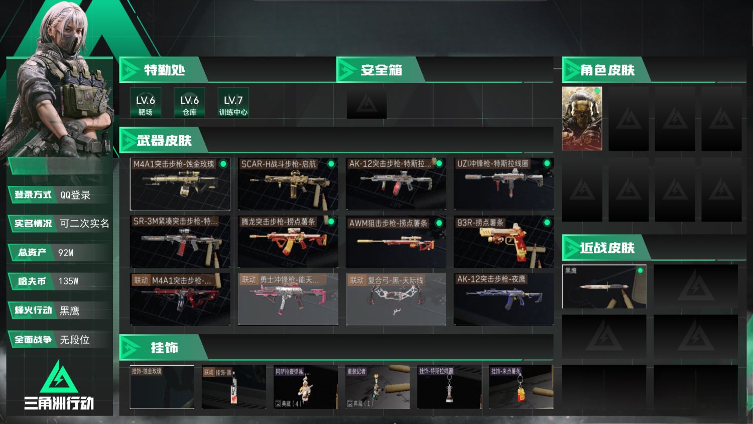 【云游堂】 V14347总资产:92M,哈夫币:135W,武器皮肤84,烽火60级:黑鹰,战场5级:无段位,通行证56级:通行证免费版 【安全箱】进阶安全箱;【特勤处等级】仓库LV.6,指挥中心LV.4,训练中心LV.7,靶场LV.6,潜水中心LV.0,收藏室LV.0;【干员皮肤1】:红狼蚀金玫瑰;【已有捆绑包3】:蚀金玫瑰捆绑包,捞点薯条捆绑包,特斯拉线圈捆绑包;【近战皮肤】:近战武器-黑鹰;【步枪皮肤】:M4A1突击步枪-蚀金玫瑰,SCAR-H战斗步枪-启航,AK-12突击步枪-特斯拉线圈,腾龙突击步枪-捞点薯条,M4A1突击步枪-阿米娅,AK-12突击步枪-夜鹰,M16A4突击步枪-竞赛选手,ASVal突击步枪-尖端治疗,AKM突击步枪-林中猎手,QBZ95-1突击步枪-公平竞技,SCAR-H战斗步枪-开心,G3战斗步枪-幻影结构,PTR-32突击步枪-天网,M16A4突击步枪-远航,SCAR-H战斗步枪-远航,SCAR-H战斗步枪-童趣,M16A4突击步枪-高雅黑,M4A1突击步枪-高雅黑,PTR-32突击步枪-黄蜂,SG552突击步枪-浅蓝涂装,M16A4突击步枪-山林猎人,AK-12突击步枪-落花,AUG突击步枪-落花,AK-12突击步枪-坚固材料,M4A1突击步枪-海色,PTR-32突击步枪-坚固材料,QBZ95-1突击步枪-海浪,AUG突击步枪-浅蓝涂装,腾龙突击步枪-三角洲力量,QBZ95-1突击步枪-海色;【冲锋枪皮肤】:UZI冲锋枪-特斯拉线圈,SR-3M紧凑突击步枪-特斯拉线圈,勇士冲锋枪-能天使-午夜邮差,SR-3M紧凑突击步枪-战,勇士冲锋枪-工业狂潮;【射手步枪皮肤】:SVD狙击步枪-暗夜猎手;【狙击步枪皮肤】:AWM狙击步枪-捞点薯条,SV-98狙击步枪-猎鳄行动,SV-98狙击步枪-林中猎手,M700狙击步枪-守夜人;【霰弹枪皮肤】:M1014霰弹枪-林中猎手;【轻机枪皮肤】:PKM通用机枪-守夜人;【手枪皮肤】:93R-捞点薯条,沙漠之鹰-曙光;【挂饰6】:挂饰-蚀金玫瑰,挂饰-黑,阿萨拉霰弹兵,重装记者,挂饰-特斯拉线圈,挂饰-来点薯条;【货币】37三角币,36曼德尔币,280三角券(典藏皮肤颜色请以典藏展示为准,安全箱等时效性道具请以游戏内数据为准)【QQ登录】【可二次实名】【官方截图】