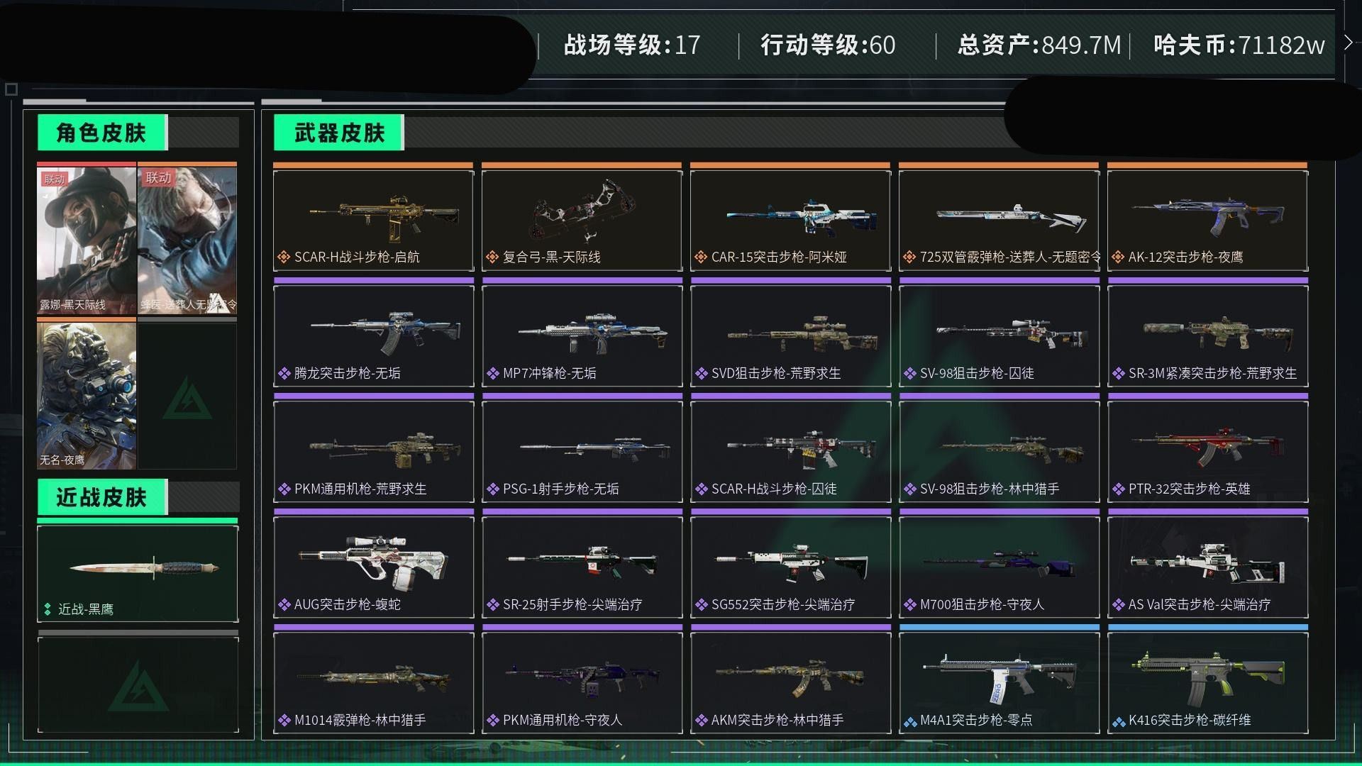 【云游堂】 汤39010总资产849M,哈夫币71182w,露娜-黑天际线/蜂医-送葬人无题密令/无名-夜鹰,枪皮数量104,战场等级:17 无军衔,行动等级:60 青铜,近战-黑鹰,安全箱等时效性道具请以游戏内数据为准;详情请看图【个人信息】战场等级:17 无军衔,行动等级:60 青铜【哈夫币】71182w【总资产】849M【货币】60三角币/0曼德尔币/214三角券【安全箱】基础安全箱2(1x2)/进阶安全箱4(2x2)【通行证】通行证免费版【特勤处】制药台Lv.3/工作台Lv.3/仓库Lv.7/防具台Lv.3/训练中心Lv.6/靶场Lv.4/技术中心Lv.3/指挥中心Lv.3/潜水中心Lv.1/收藏室Lv.0【仓库】非洲之心/【角色皮肤】露娜-黑天际线/无名-夜鹰/蜂医-送葬人无题密令/【近战皮肤】近战-黑鹰/【步枪皮肤】SR-3M紧凑突击步枪-英雄/AUG突击步枪-蝮蛇/AK-12突击步枪-夜鹰/SG552突击步枪-尖端治疗/AS Val突击步枪-尖端治疗/ASh-12战斗步枪-守夜人/AKM突击步枪-林中猎手/PTR-32突击步枪-英雄/腾龙突击步枪-无垢/SCAR-H战斗步枪-囚徒/SR-3M紧凑突击步枪-荒野求生/CAR-15突击步枪-阿米娅/SCAR-H战斗步枪-启航/【冲锋枪皮肤】MP7冲锋枪-无垢/MP5冲锋枪-战术竞备/【霰弹枪皮肤】M1014霰弹枪-林中猎手/725双管霰弹枪-送葬人-无题密令/【轻机枪皮肤】PKM通用机枪-守夜人/PKM通用机枪-荒野求生/【精准射手步枪皮肤】SR-25射手步枪-尖端治疗/PSG-1射手步枪-无垢/【狙击步枪皮肤】SV-98狙击步枪-囚徒/M700狙击步枪-守夜人/SV-98狙击步枪-林中猎手/SVD狙击步枪-荒野求生/【特殊武器】复合弓-黑-天际线/【挂饰】挂饰-启程/挂饰-小羊/挂饰-彩蛋/乐队纪念/阿萨拉狙击兵/挂饰-晶石幻想/阿萨拉徽章/【载具】M1A4坦克-丛林猎手/M1A4坦克-紫电/步战车-无瑕/步战车-凝视/防空车-警戒线/轮式突击炮-暗夜行动/轮式突击炮-凝视/轮式突击炮-紫电/突击直升机-飓风行动/突击直升机-暗夜行动/突击直升机-紫电/侦察直升机-凝视/侦察直升机-紫电/全地形车-警戒线/GTQ35坦克-紫电/(典藏皮肤颜色请以典藏展示为准,安全箱等时效性道具请以游戏内数据为准)