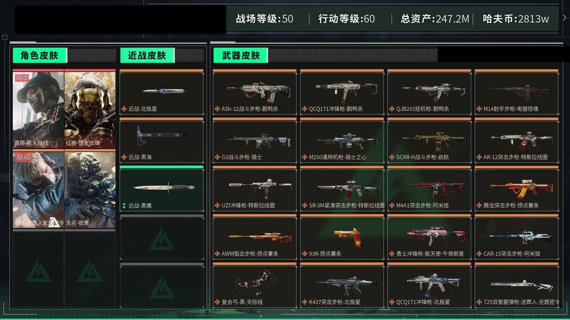 【云游堂】 惠1219922总资产247M,哈夫币2813w,枪皮数量243,战场等级:50 军士长,行动等级:60 三角洲巅峰,角色皮肤数量4,露娜-黑天际线/红狼-蚀金玫瑰/蜂医【个人信息】战场等级:50 军士长,行动等级:60 三角洲巅峰【哈夫币】2813w【总资产】247M【货币】134三角币/9曼德尔币/90三角券【安全箱】基础安全箱2(1x2)/S6高级安全箱6(2x3)【通行证】烽火地带限定版【特勤处】制药台Lv.3/工作台Lv.3/仓库Lv.9/防具台Lv.3/训练中心Lv.7/靶场Lv.7/技术中心Lv.3/指挥中心Lv.6/潜水中心Lv.1/收藏室Lv.1【仓库】非洲之心/【角色皮肤】露娜-黑天际线/红狼-蚀金玫瑰/无名-夜鹰/蜂医-送葬人无题密令/【已拥有捆绑包】黑海捆绑包/北极星捆绑包/捞点薯条捆绑包/特斯拉线圈捆绑包/【近战皮肤】近战-黑鹰/近战-黑海/近战-北极星/【步枪皮肤】M4A1突击步枪-蚀金玫瑰/SCAR-H战斗步枪-国风/G3战斗步枪-阿萨拉工艺/M4A1突击步枪-竞技风/QBZ95-1突击步枪-曙光/AUG突击步枪-蝮蛇/SCAR-H战斗步枪-猎鳄行动/AK-12突击步枪-夜鹰/SG552突击步枪-深海恐惧/SG552突击步枪-尖端治疗/AS Val突击步枪-尖端治疗/ASh-12战斗步枪-守夜人/AKM突击步枪-林中猎手/PTR-32突击步枪-英雄/K437突击步枪-北极星/AS Val突击步枪-典狱官/腾龙突击步枪-无垢/SCAR-H战斗步枪-囚徒/M16A4突击步枪-竞赛选手/SR-3M紧凑突击步枪-荒野求生/CAR-15突击步枪-阿米娅/M4A1突击步枪-阿米娅/腾龙突击步枪-捞点薯条/AK-12突击步枪-特斯拉线圈/SR-3M紧凑突击步枪-特斯拉线圈/G3战斗步枪-骑士/ASh-12战斗步枪-鹅鸭杀/SCAR-H战斗步枪-启航/SR-3M紧凑突击步枪-战术竞备/【冲锋枪皮肤】UZI冲锋枪-特斯拉线圈/Vector冲锋枪-阿萨拉文明/MP5冲锋枪-黑海/MP5冲锋枪-深海恐惧/勇士冲锋枪-深海恐惧/SMG45冲锋枪-骑士/QCQ171冲锋枪-北极星/MP7冲锋枪-无垢/勇士冲锋枪-能天使-午夜邮差/P90冲锋枪-紧急戒备/MP7冲锋枪-守护者/勇士冲锋枪-工业狂潮/QCQ171冲锋枪-鹅鸭杀/【霰弹枪皮肤】M1014霰弹枪-林中猎手/725双管霰弹枪-送葬人-无题密令/【轻机枪皮肤】PKM通用机枪-蝮蛇/PKM通用机枪-英雄/QJB201轻机枪-黑海/PKM通用机枪-守夜人/PKM通用机枪-荒野求生/M250通用机枪-囚徒/QJB201轻机枪-OldHabits/M249轻机枪-异域战争/M250通用机枪-骑士之心/QJB201轻机枪-鹅鸭杀/【精准射手步枪皮肤】SR-25射手步枪-水墨云图/SR-25射手步枪-战场英杰/SR-25射手步枪-尖端治疗/PSG-1射手步枪-无垢/M14射手步枪-电锯惊魂/【狙击步枪皮肤】SVD狙击步枪-阿萨拉工艺/M700狙击步枪-竞技风/SV-98狙击步枪-囚徒/M700狙击步枪-蝮蛇/SVD狙击步枪-暗夜猎手/M700狙击步枪-守夜人/SV-98狙击步枪-林中猎手/SVD狙击步枪-荒野求生/AWM狙击步枪-捞点薯条/【手枪皮肤】QSZ92G-风林火山/93R-捞点薯条/【特殊武器】复合弓-黑-天际线/【挂饰】挂饰-三联装手炮/挂饰-枪匠/诡影狙击兵/诡影喷火兵/挂饰-大白鹅/挂饰-启程/挂饰-水墨云图/挂饰-蚀金玫瑰/挂饰-保持专注/挂饰-黑海/爆裂鼓声/灵魂摇滚/挂饰-小羊/阿萨拉喷火兵/挂饰-北极星/阿萨拉霰弹兵/阿萨拉狙击兵/挂饰-晶石幻想/挂饰-阿米娅/挂饰-来点薯条/挂饰-特斯拉线圈/阿萨拉徽章/紧急会议/【载具】M1A4坦克-纷争/步战车-无瑕/步战车-凝视/突击车-纷争/轮式突击炮-暗夜行动/轮式突击炮-凝视/突击直升机-纷争/突击直升机-飓风行动/突击直升机-狮王/突击直升机-暗夜行动/侦察直升机-凝视/全地形车-纷争/(典藏皮肤颜色请以典藏展示为准,安全箱等时效性道具请以游戏内数据为准)
