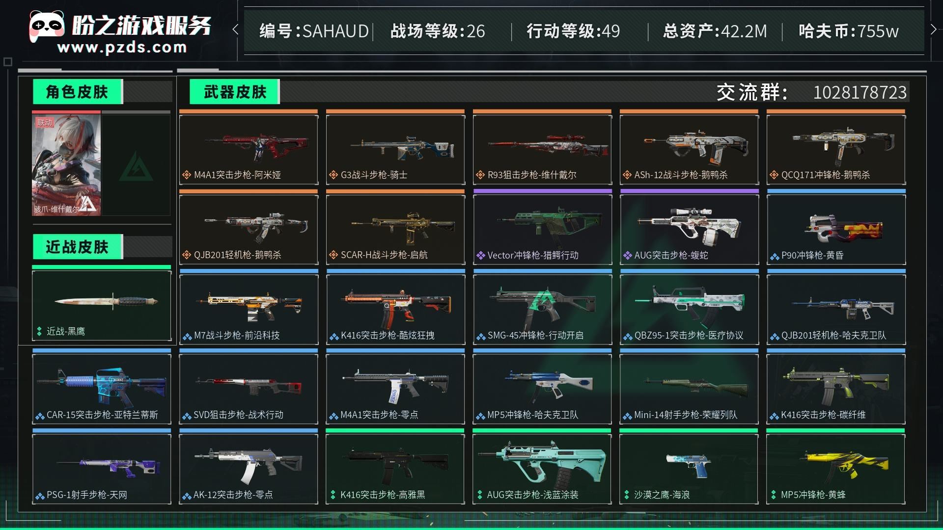【云游堂】 惠3972753总资产42M,哈夫币755w,枪皮数量52,战场等级:26 军士长,行动等级:49 黄金,角色皮肤数量1,骇爪-维什戴尔,近战-黑鹰,安全箱等【个人信息】战场等级:26 军士长,行动等级:49 黄金【哈夫币】755w【总资产】42M【货币】0三角币/0曼德尔币/812三角券【安全箱】基础安全箱2(1x2)/进阶安全箱4(2x2)【通行证】通行证免费版【特勤处】制药台Lv.2/工作台Lv.3/仓库Lv.5/防具台Lv.3/训练中心Lv.3/靶场Lv.3/技术中心Lv.2/指挥中心Lv.3/潜水中心Lv.0/收藏室Lv.0【角色皮肤】骇爪-维什戴尔/【近战皮肤】近战-黑鹰/【步枪皮肤】AUG突击步枪-蝮蛇/M4A1突击步枪-阿米娅/G3战斗步枪-骑士/ASh-12战斗步枪-鹅鸭杀/SCAR-H战斗步枪-启航/SR-3M紧凑突击步枪-战术竞备/【冲锋枪皮肤】Vector冲锋枪-猎鳄行动/QCQ171冲锋枪-鹅鸭杀/MP5冲锋枪-战术竞备/【轻机枪皮肤】QJB201轻机枪-鹅鸭杀/【狙击步枪皮肤】R93狙击步枪-维什戴尔/【挂饰】统统拿走(A)/挂饰-枪匠/挂饰-维什戴尔/挂饰-大白鹅/挂饰-启程/紧急会议/(典藏皮肤颜色请以典藏展示为准,安全箱等时效性道具请以游戏内数据为准)