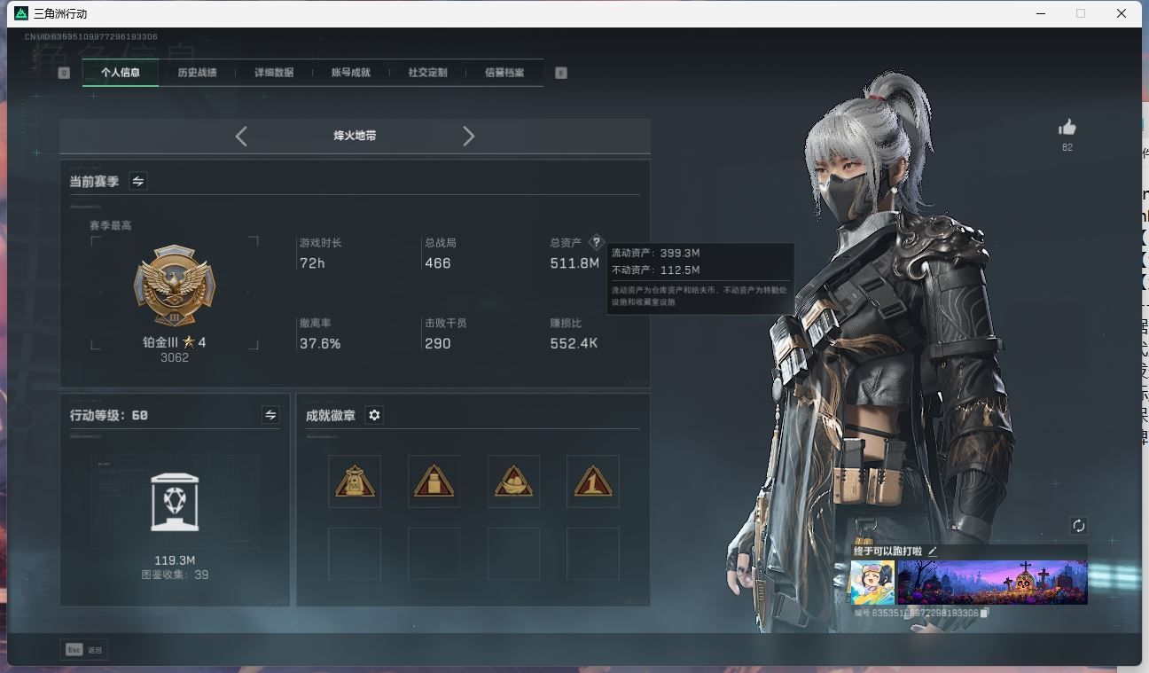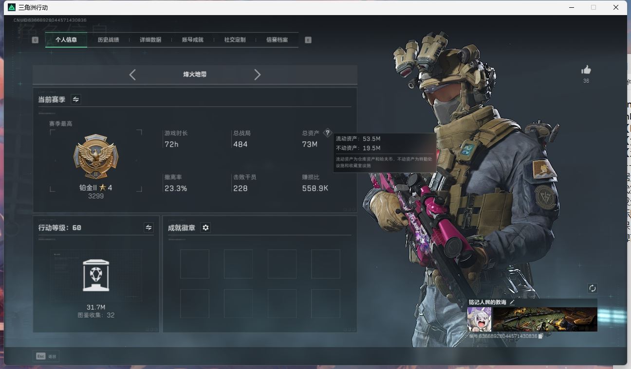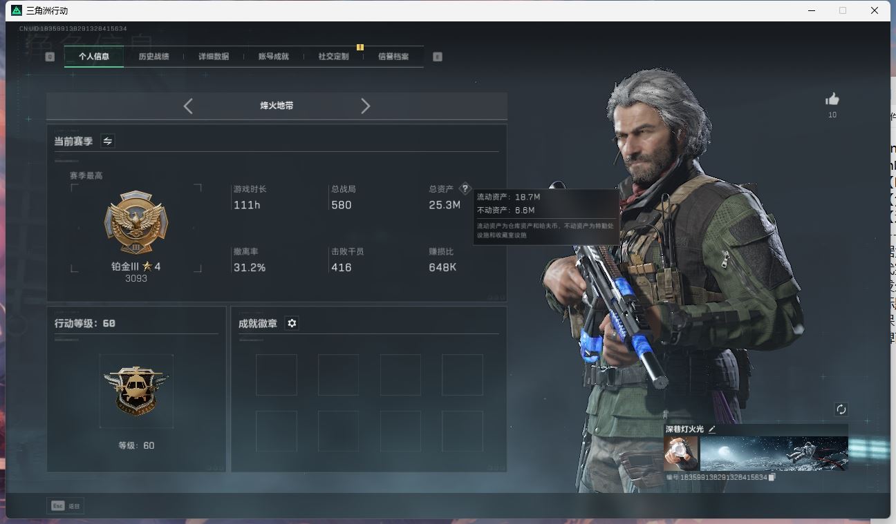 【云游堂】 hmc AK025331 行动等级:60铂金,总资产73m哈夫币 【呛皮:M4A1突击步枪-蚀金玫理 联动 M4A1突击步枪-阿米娅 M16A4突击步枪-狩猎时刻 SCAR-H战斗步枪-启航 G3战斗步枪-狩猎时刻 腾龙突击步枪-捞点警条 K437突击步枪-北极星 联动 Vector冲锋枪-能天使 联动 勇士冲锋枪-能天使-午夜邮差 0C0171冲锋枪-北极星 M250通用机枪-骑士之心 AWM狙击步枪-捞点薯条】【角色皮肤:红狼-蚀金玫瑰 蛊-午夜邮差 露娜-黑天际线 】【近战:近战-北极星 黑鹰 】----安全箱等时效性道具请以游戏内数据为准:详情请看图----截图展示段位不代实际段位,赛季更新等不可抗拒因素发生变化、时限道具不保证所剩时间、标题未写送三角币默认不送】【主播担保+安全至上+性价比 买号卖号只选金牌商家一左友】