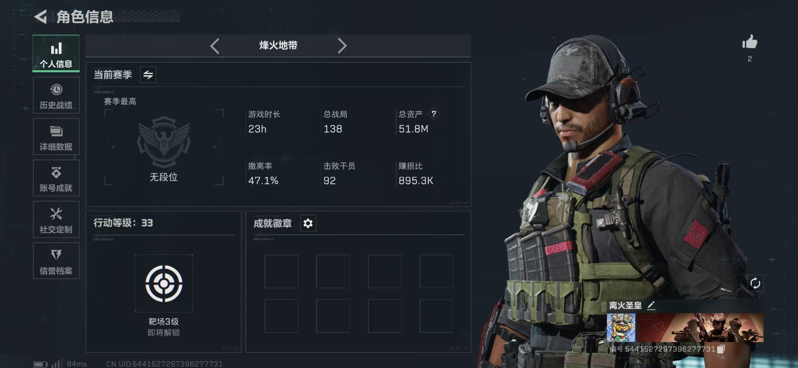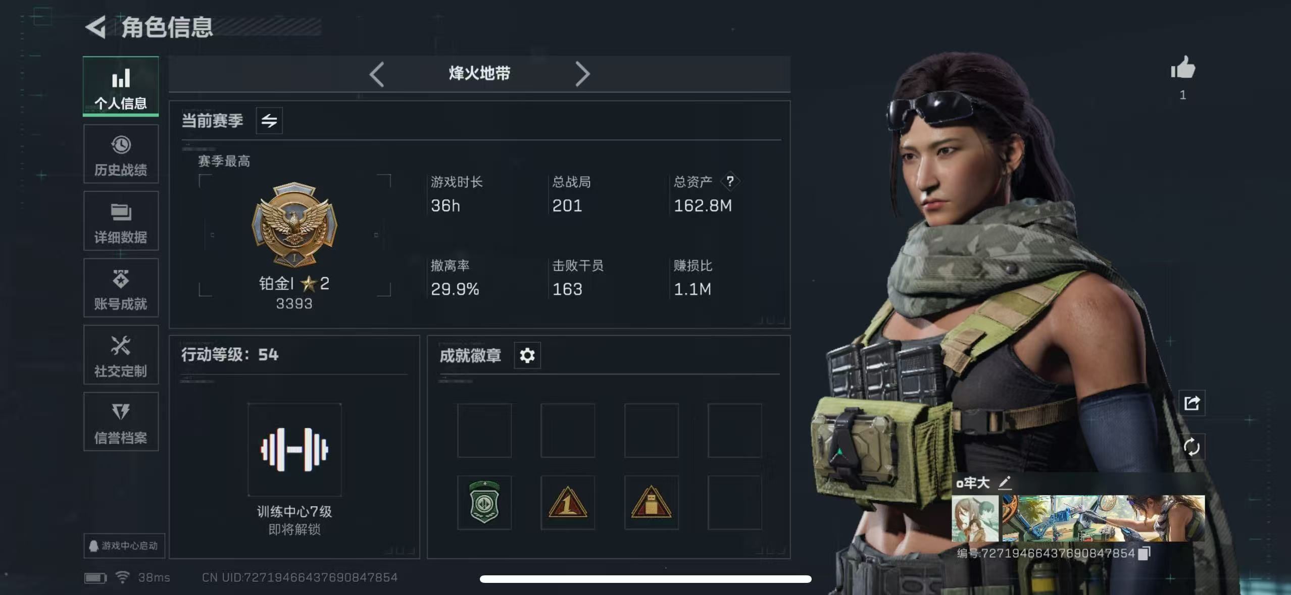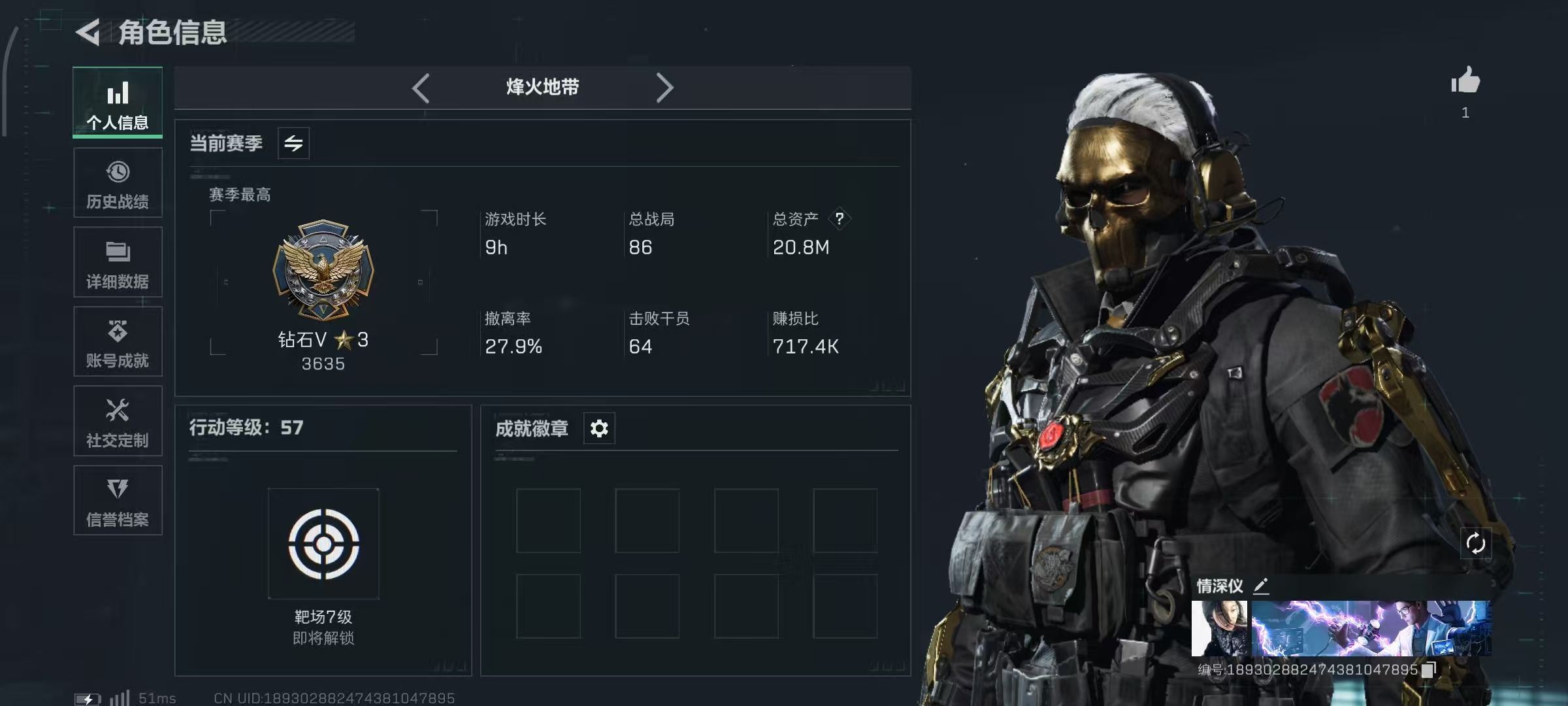 【云游堂】 SA052总资产:162.8M,哈夫币:4399W,武器皮肤:11,烽火54级:铂金,战场18级:上等兵,【安全箱】高级安全箱;【特勤处等级】仓库LV.8,靶场LV.3,训练中心LV.4;【近战武器】近战武器-黑鹰,近战武器-电锯惊魂