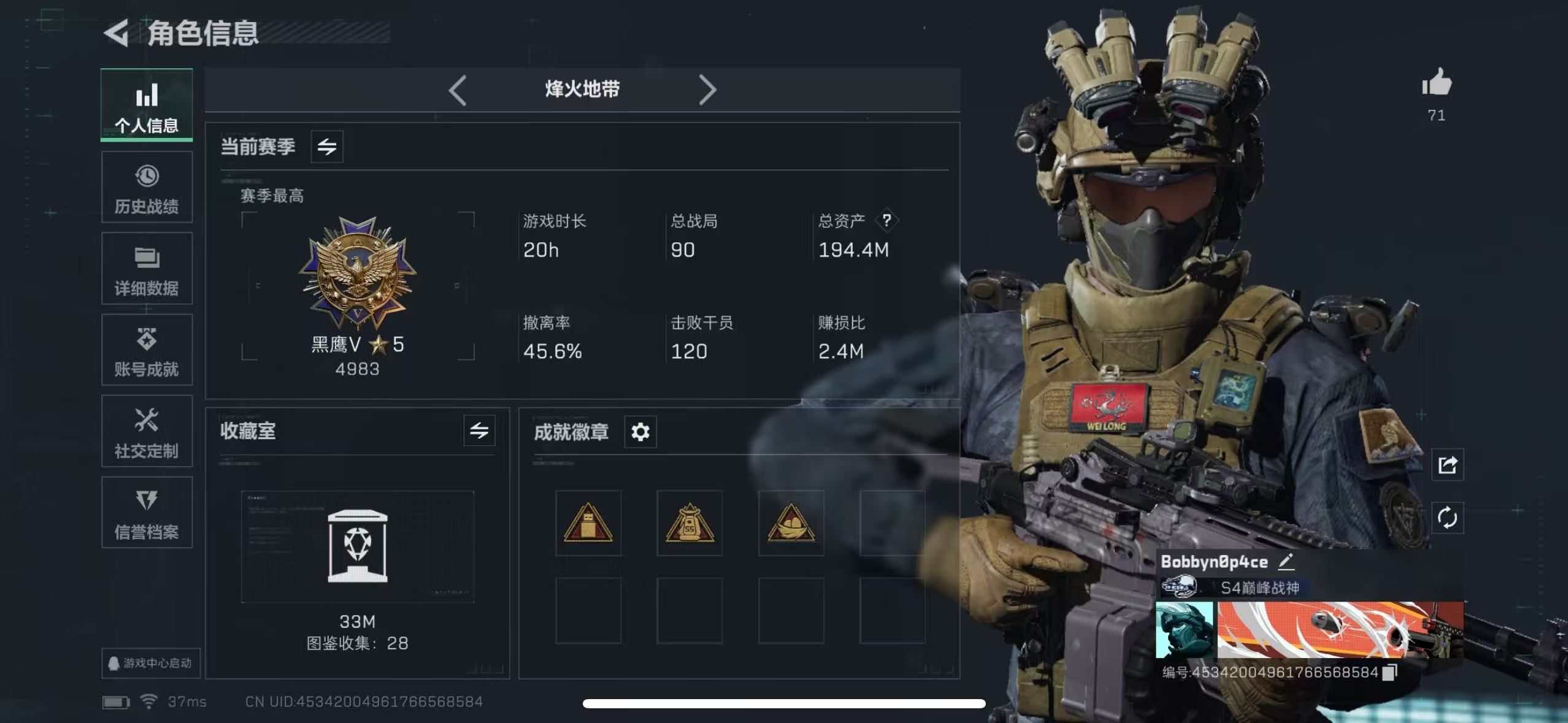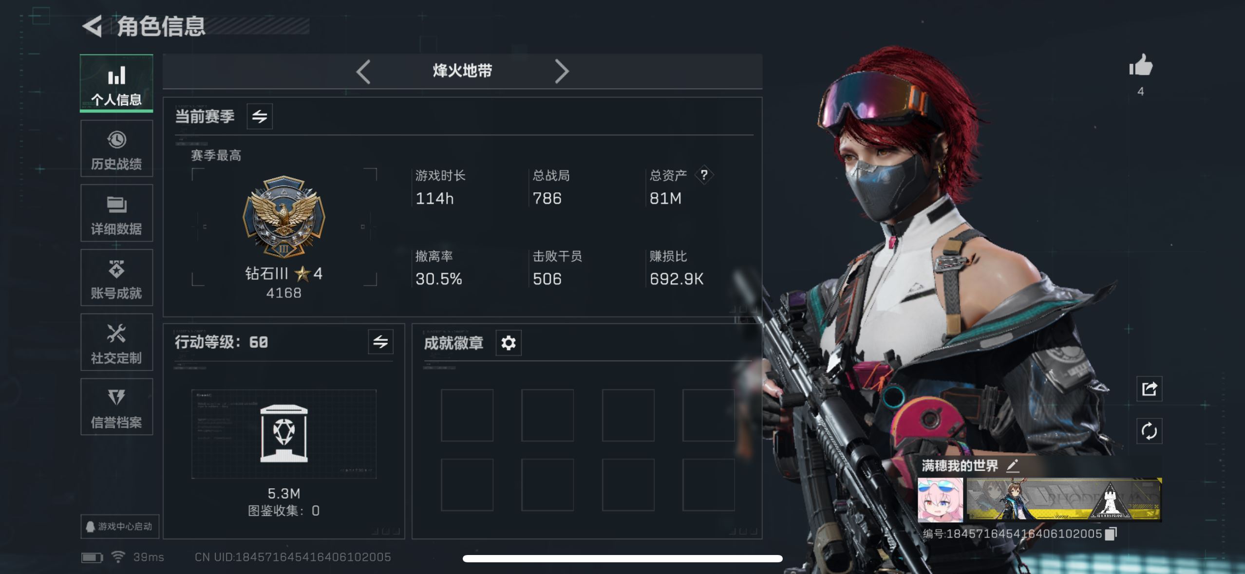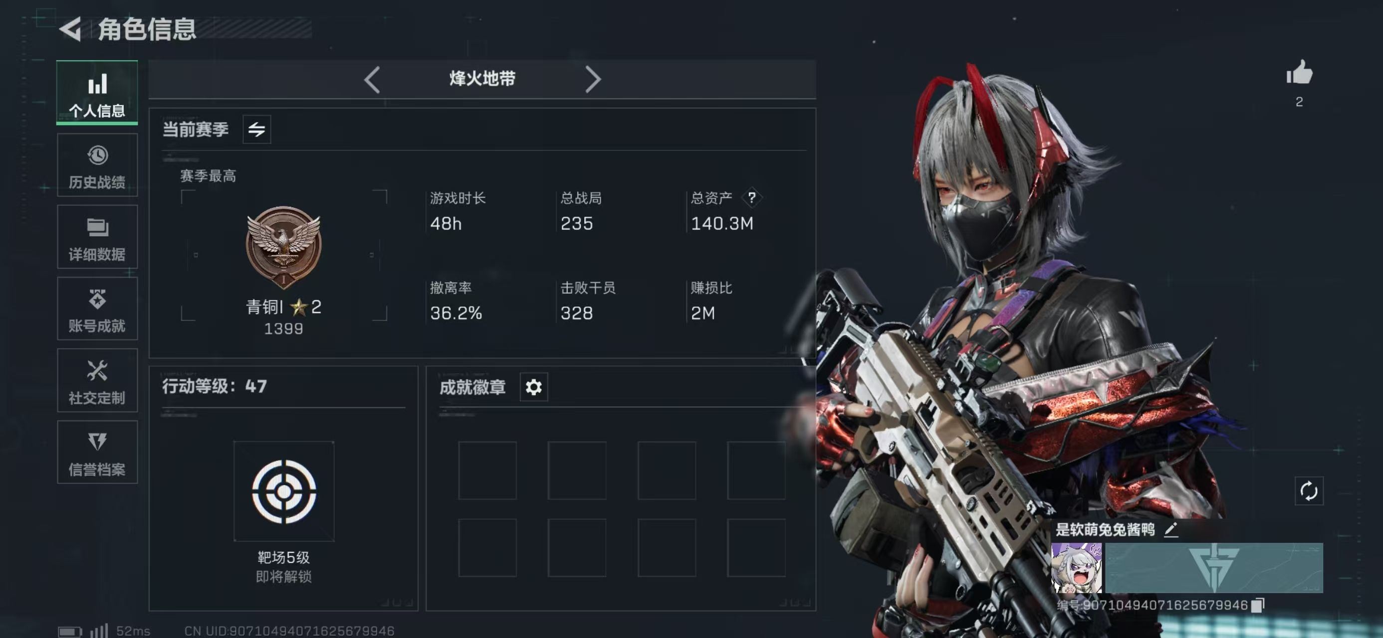 【云游堂】 SA052总资产:162.8M,哈夫币:4399W,武器皮肤:11,烽火54级:铂金,战场18级:上等兵,【安全箱】高级安全箱;【特勤处等级】仓库LV.8,靶场LV.3,训练中心LV.4;【近战武器】近战武器-黑鹰,近战武器-电锯惊魂