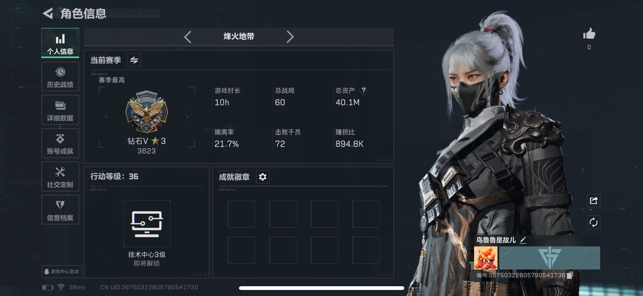 【云游堂】 SA055总资产:40.1M,哈夫币:660W,武器皮肤:8,烽火36级:钻石,战场3级:【安全箱】基础安全箱;【特勤处等级】仓库LV.5,靶场LV.3,训练中心LV.3;【干员皮肤】骇爪水墨云图;【近战武器】近战武器-黑鹰
