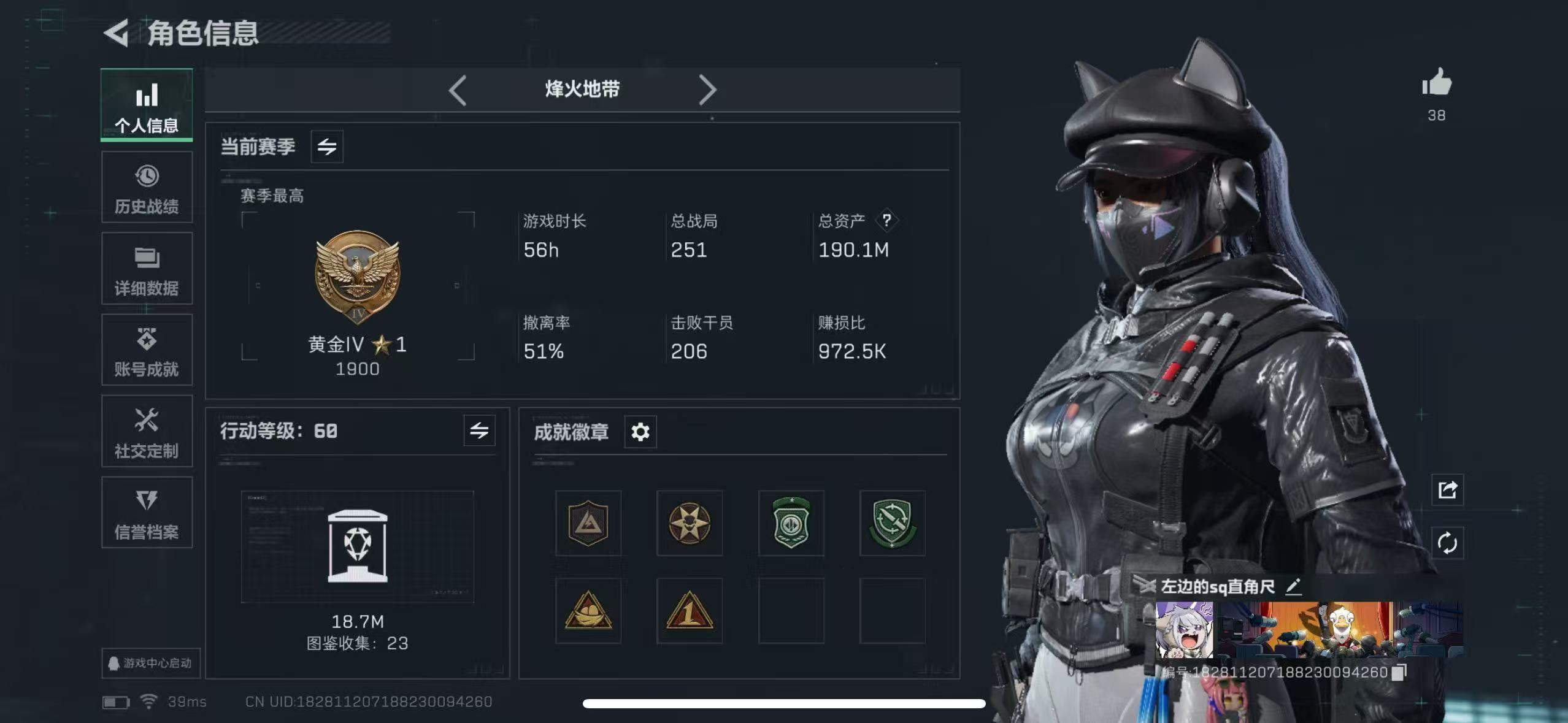 【云游堂】 SA049总资产:196M,哈夫币:1256W,武器皮肤:11,烽火60级:黑鹰_,战场32级:上等兵,【安全箱】高级安全箱;【特勤处等级】仓库LV.9,靶场LV.7,训练中心LV.7;【干员皮肤】无名夜鹰,蜂医送葬人无题密令,露娜黑天际线;【近战武器】近战武器-黑海,近战武器-黑鹰
