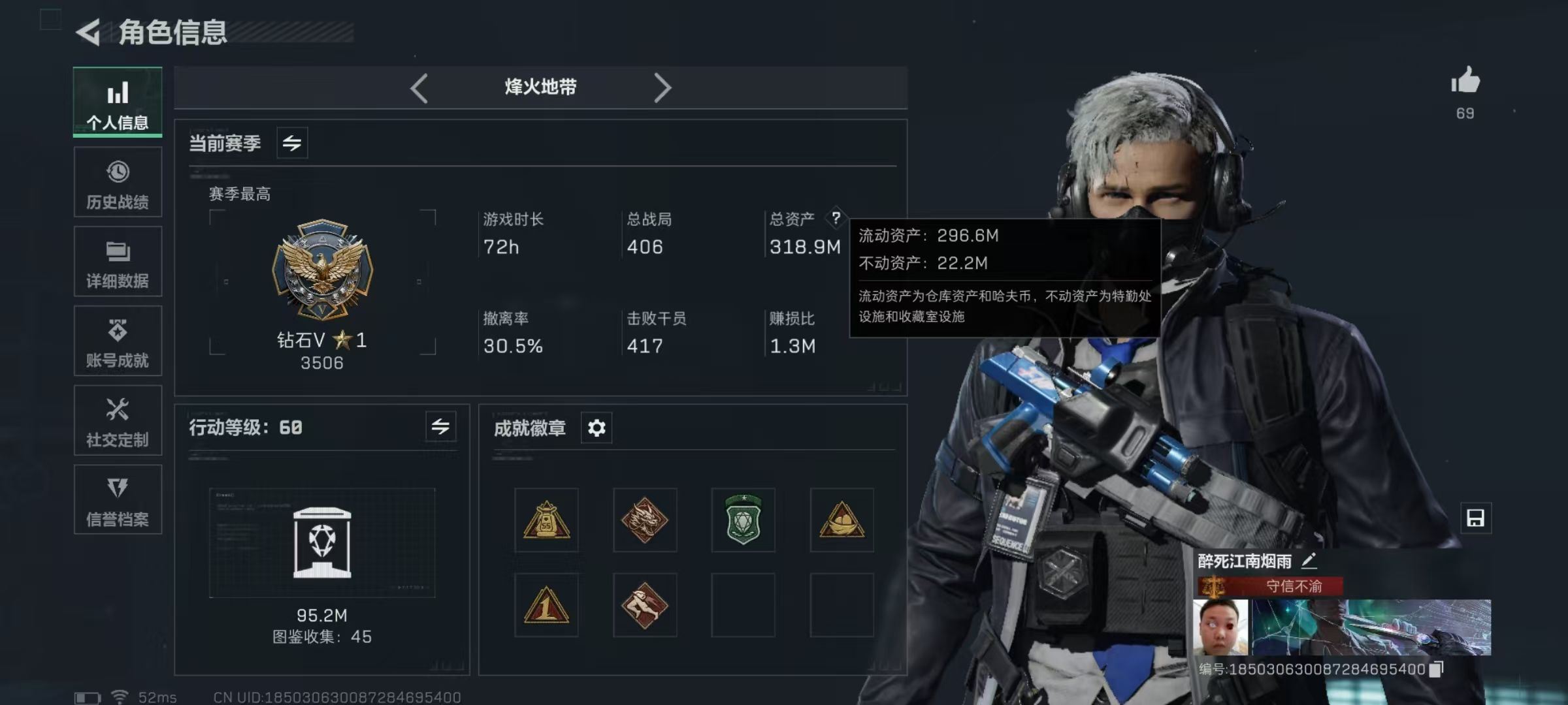 【云游堂】 逍35564总资产318M,哈弗币1500万,枪皮数量125,行动等级60,战场等级13,干员皮肤:峰医-无题密令,近战:北极星/黑鹰,M4突击步枪阿米娅/ASH-12鹅鸭杀AK-12特斯拉线圈/等皮肤详情请看图安全箱等时效型道具请以游戏内数据为准;详情请看图