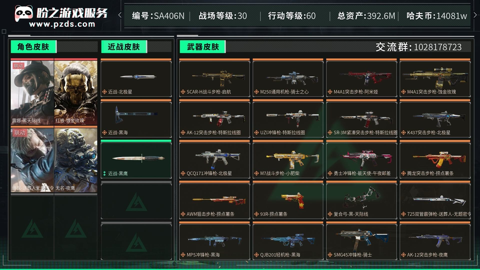 【云游堂】 惠3825834总资产392M,哈夫币14081w,枪皮数量164,战场等级:30 上等兵,行动等级:60 钻石,角色皮肤数量4,露娜-黑天际线/红狼-蚀金玫瑰/蜂医-送葬人【个人信息】战场等级:30 上等兵,行动等级:60 钻石【哈夫币】14081w【总资产】392M【货币】36三角币/13曼德尔币/151三角券【安全箱】基础安全箱2(1x2)/S6高级安全箱6(2x3)【通行证】三角洲全模式版【特勤处】制药台Lv.3/工作台Lv.3/仓库Lv.9/防具台Lv.3/训练中心Lv.7/靶场Lv.7/技术中心Lv.3/指挥中心Lv.6/潜水中心Lv.1/收藏室Lv.0【仓库】非洲之心/【角色皮肤】露娜-黑天际线/红狼-蚀金玫瑰/无名-夜鹰/蜂医-送葬人无题密令/【已拥有捆绑包】黑海捆绑包/北极星捆绑包/捞点薯条捆绑包/特斯拉线圈捆绑包/【近战皮肤】近战-黑鹰/近战-黑海/近战-北极星/【步枪皮肤】M4A1突击步枪-蚀金玫瑰/AUG突击步枪-蝮蛇/CAR-15突击步枪-黑鹰坠落/AK-12突击步枪-夜鹰/SG552突击步枪-深海恐惧/SG552突击步枪-尖端治疗/AS Val突击步枪-尖端治疗/ASh-12战斗步枪-守夜人/AKM突击步枪-林中猎手/PTR-32突击步枪-英雄/K437突击步枪-北极星/腾龙突击步枪-无垢/SCAR-H战斗步枪-囚徒/M16A4突击步枪-竞赛选手/SR-3M紧凑突击步枪-荒野求生/M4A1突击步枪-阿米娅/M7战斗步枪-小肥柴/腾龙突击步枪-捞点薯条/AK-12突击步枪-特斯拉线圈/SR-3M紧凑突击步枪-特斯拉线圈/SCAR-H战斗步枪-启航/SR-3M紧凑突击步枪-战术竞备/【冲锋枪皮肤】UZI冲锋枪-特斯拉线圈/Vector冲锋枪-阿萨拉文明/MP5冲锋枪-黑海/MP5冲锋枪-深海恐惧/勇士冲锋枪-深海恐惧/SMG45冲锋枪-骑士/QCQ171冲锋枪-北极星/MP7冲锋枪-无垢/勇士冲锋枪-能天使-午夜邮差/P90冲锋枪-紧急戒备/【霰弹枪皮肤】S12K霰弹枪-曙光/M1014霰弹枪-林中猎手/725双管霰弹枪-送葬人-无题密令/【轻机枪皮肤】PKM通用机枪-蝮蛇/QJB201轻机枪-黑海/PKM通用机枪-守夜人/PKM通用机枪-荒野求生/M250通用机枪-囚徒/QJB201轻机枪-OldHabits/M250通用机枪-骑士之心/【精准射手步枪皮肤】SR-25射手步枪-尖端治疗/PSG-1射手步枪-无垢/【狙击步枪皮肤】SVD狙击步枪-阿萨拉工艺/M700狙击步枪-竞技风/SV-98狙击步枪-囚徒/SVD狙击步枪-暗夜猎手/M700狙击步枪-守夜人/SV-98狙击步枪-林中猎手/SVD狙击步枪-荒野求生/AWM狙击步枪-捞点薯条/【手枪皮肤】93R-捞点薯条/【特殊武器】复合弓-黑-天际线/【挂饰】挂饰-枪匠/挂饰-维什戴尔/挂饰-启程/挂饰-蚀金玫瑰/挂饰-黑海/演出导演/重装记者/挂饰-小羊/挂饰-彩蛋/乐队纪念/挂饰-北极星/阿萨拉霰弹兵/阿萨拉狙击兵/挂饰-晶石幻想/挂饰-阿米娅/挂饰-来点薯条/挂饰-特斯拉线圈/阿萨拉徽章/【载具】M1A4坦克-丛林猎手/轮式突击炮-移动堡垒/防空车-移动堡垒/M1A4坦克-紫电/防空车-警戒线/轮式突击炮-紫电/突击直升机-紫电/侦察直升机-紫电/全地形车-警戒线/GTQ35坦克-紫电/(典藏皮肤颜色请以典藏展示为准,安全箱等时效性道具请以游戏内数据为准)