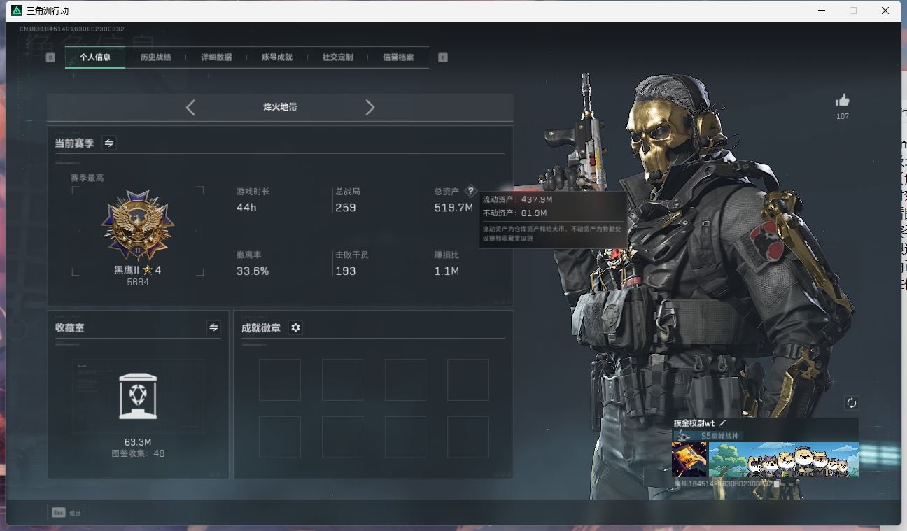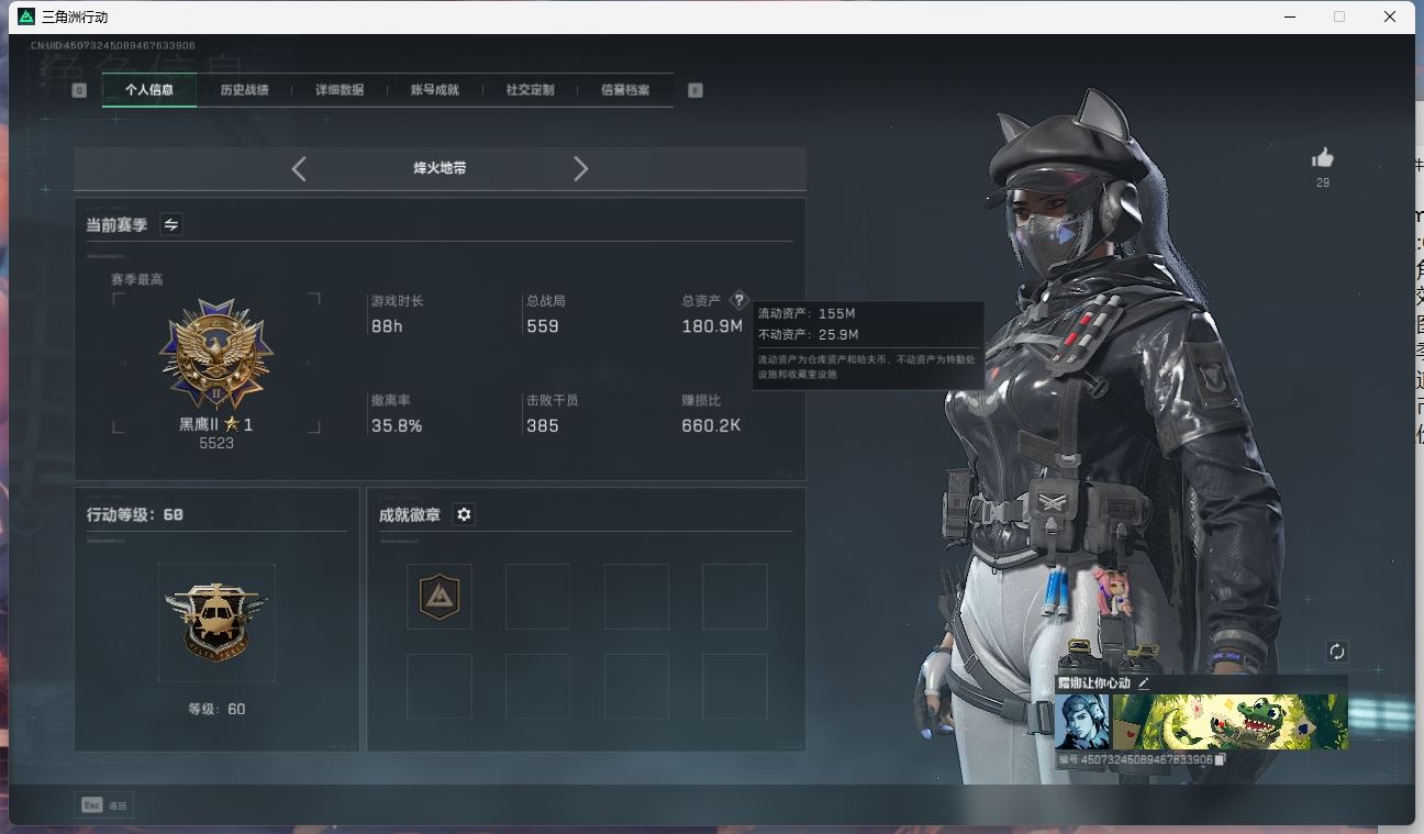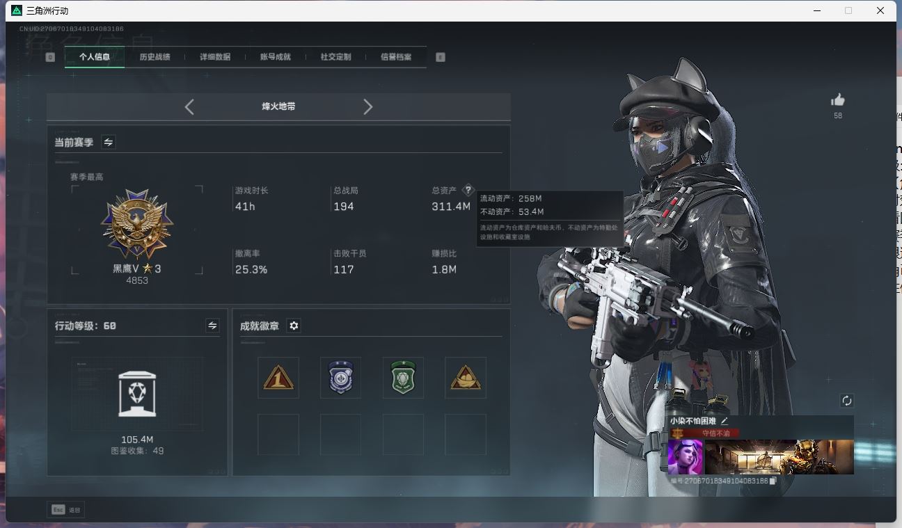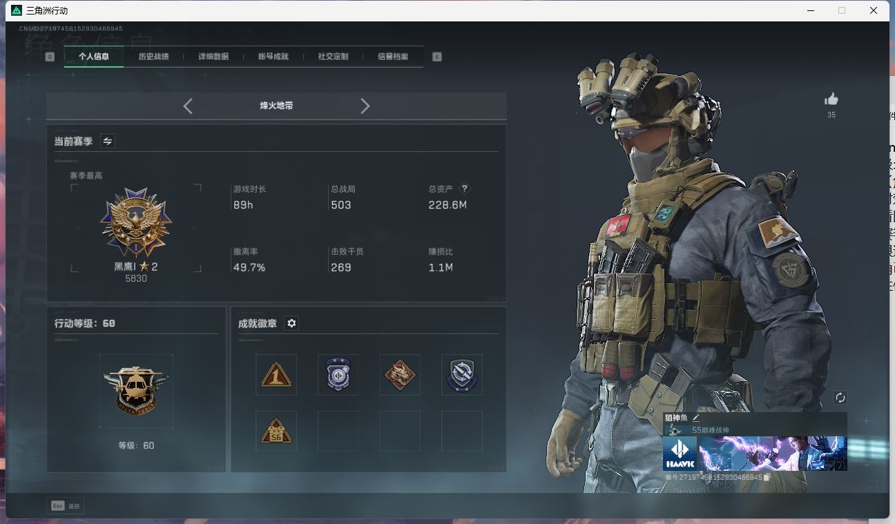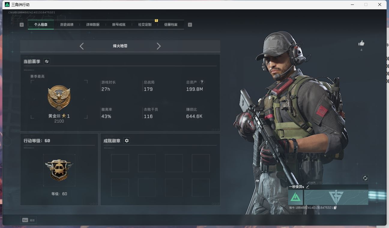 【云游堂】 hmcAK024890【包人脸】行动等级:60黄金,总资产199.8m哈夫币 【呛皮:联动 勇士冲锋枪-能天使-午夜邮差】 【近战:黑鹰】,安全箱等时效性道具请以游戏内数据为准:详情请看图----截图展示段位不代实际段位,赛季更新等不可抗拒因素发生变化、时限道具不保证所剩时间、标题未写送三角币默认不送】【主播担保+安全至上+性价比 买号卖号只选金牌商家一左友】