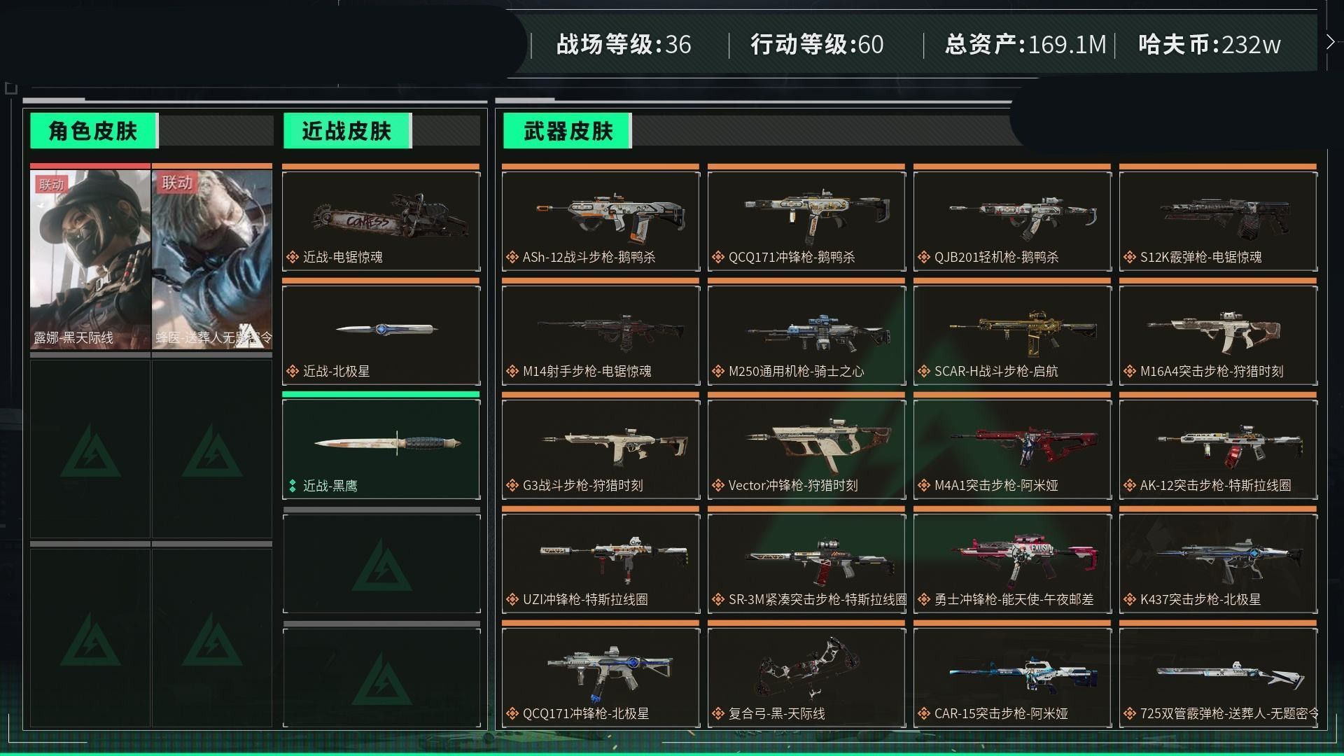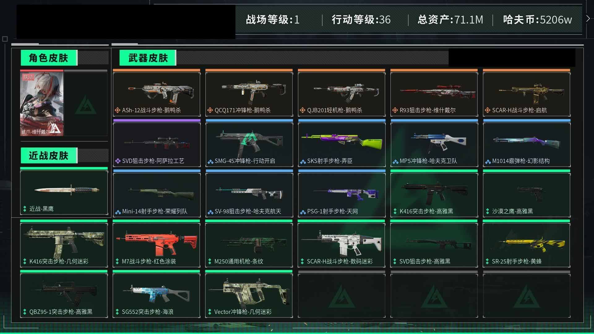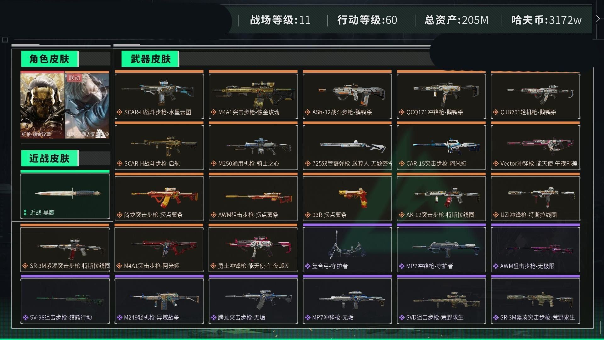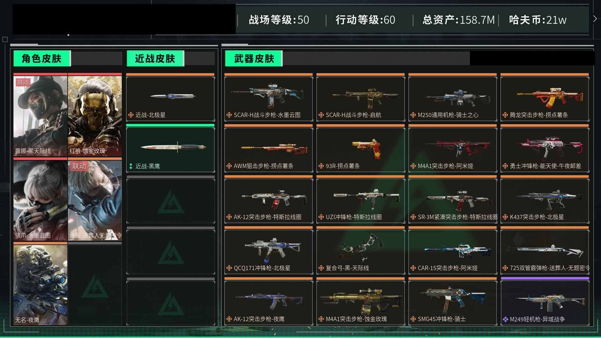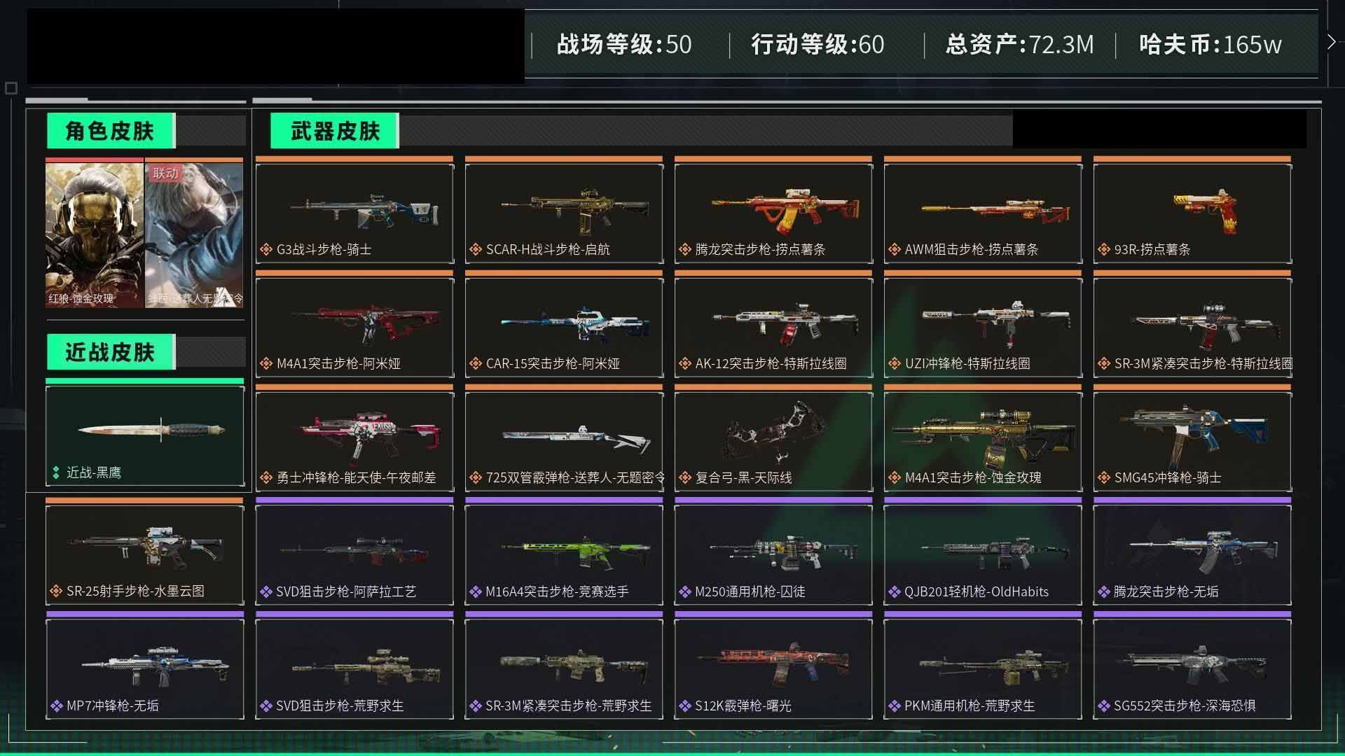 【云游堂】 惠2228415总资产72M,哈夫币165w,枪皮数量154,战场等级:50 尉官,行动等级:60 铂金,角色皮肤数量2,红狼-蚀金玫瑰/蜂医-送葬人无题密令,近战-黑鹰【个人信息】战场等级:50 尉官,行动等级:60 铂金【哈夫币】165w【总资产】72M【货币】63三角币/0曼德尔币/205三角券【安全箱】基础安全箱2(1x2)【通行证】通行证免费版【特勤处】制药台Lv.3/工作台Lv.3/仓库Lv.6/防具台Lv.3/训练中心Lv.7/靶场Lv.6/技术中心Lv.3/指挥中心Lv.5/潜水中心Lv.0/收藏室Lv.0【角色皮肤】红狼-蚀金玫瑰/蜂医-送葬人无题密令/【已拥有捆绑包】捞点薯条捆绑包/特斯拉线圈捆绑包/【近战皮肤】近战-黑鹰/【步枪皮肤】M4A1突击步枪-蚀金玫瑰/M4A1突击步枪-竞技风/SG552突击步枪-深海恐惧/AKM突击步枪-林中猎手/AS Val突击步枪-典狱官/腾龙突击步枪-无垢/M16A4突击步枪-竞赛选手/SR-3M紧凑突击步枪-荒野求生/CAR-15突击步枪-阿米娅/M4A1突击步枪-阿米娅/腾龙突击步枪-捞点薯条/AK-12突击步枪-特斯拉线圈/SR-3M紧凑突击步枪-特斯拉线圈/G3战斗步枪-骑士/SCAR-H战斗步枪-启航/【冲锋枪皮肤】UZI冲锋枪-特斯拉线圈/Vector冲锋枪-阿萨拉文明/SMG45冲锋枪-骑士/MP7冲锋枪-无垢/勇士冲锋枪-能天使-午夜邮差/P90冲锋枪-暗影猎手/勇士冲锋枪-工业狂潮/【霰弹枪皮肤】S12K霰弹枪-曙光/M1014霰弹枪-林中猎手/725双管霰弹枪-送葬人-无题密令/【轻机枪皮肤】PKM通用机枪-英雄/PKM通用机枪-荒野求生/M250通用机枪-囚徒/QJB201轻机枪-OldHabits/【精准射手步枪皮肤】SR-25射手步枪-水墨云图/PSG-1射手步枪-无垢/【狙击步枪皮肤】SVD狙击步枪-阿萨拉工艺/SV-98狙击步枪-囚徒/M700狙击步枪-蝮蛇/SV-98狙击步枪-林中猎手/SVD狙击步枪-荒野求生/AWM狙击步枪-捞点薯条/【手枪皮肤】沙漠之鹰-曙光/93R-捞点薯条/【特殊武器】复合弓-黑-天际线/【挂饰】挂饰-磁吸炸弹/挂饰-三联装手炮/挂饰-枪匠/诡影狙击兵/诡影喷火兵/挂饰-启程/挂饰-蚀金玫瑰/阿萨拉霰弹兵/阿萨拉狙击兵/挂饰-晶石幻想/挂饰-阿米娅/挂饰-来点薯条/挂饰-特斯拉线圈/阿萨拉徽章/紧急会议/【载具】突击车-纷争/侦察直升机-烈焰/全地形车-纷争/(典藏皮肤颜色请以典藏展示为准,安全箱等时效性道具请以游戏内数据为准)