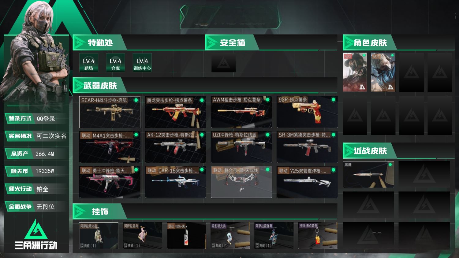 【云游堂】 v39063总资产:266.4M,哈夫币:19335W,武器皮肤82,烽火60级:铂金,战场1级:无段位,通行证11级:通行证免费版 【安全箱】基础安全箱;【特勤处等级】仓库LV.4,指挥中心LV.2,训练中心LV.4,靶场LV.4,潜水中心LV.0,收藏室LV.0;【干员皮肤2】:露娜黑天际线,蜂医送葬人无题密令;【已有捆绑包3】:捞点薯条捆绑包,特斯拉线圈捆绑包,黑天际线捆绑包;【近战皮肤】:近战武器-黑鹰;【步枪皮肤】:SCAR-H战斗步枪-启航,腾龙突击步枪-捞点薯条,M4A1突击步枪-阿米娅,AK-12突击步枪-特斯拉线圈,CAR-15突击步枪-阿米娅,M16A4突击步枪-竞赛选手,腾龙突击步枪-无垢,K416突击步枪-虎啸,腾龙突击步枪-雪崩,SCAR-H战斗步枪-荣耀列队,PTR-32突击步枪-天网,K437突击步枪-轻奢武装,M4A1突击步枪-海色,G3战斗步枪-高雅黑,QBZ95-1突击步枪-三角洲力量,SG552突击步枪-海浪,M4A1突击步枪-高雅黑,G3战斗步枪-山林猎人,腾龙突击步枪-三角洲力量,K416突击步枪-几何解构,SCAR-H战斗步枪-数码,PTR-32突击步枪-黄蜂,QBZ95-1突击步枪-海色,腾龙突击步枪-彩墨喷涂,SG552突击步枪-浅蓝涂装,AUG突击步枪-浅蓝涂装,M16A4突击步枪-山林猎人,SG552突击步枪-彩墨喷涂,M7战斗步枪-红色彗星,QBZ95-1突击步枪-海浪,M4A1突击步枪-粉色涂装,AKM突击步枪-彩墨喷涂;【冲锋枪皮肤】:UZI冲锋枪-特斯拉线圈,SR-3M紧凑突击步枪-特斯拉线圈,勇士冲锋枪-能天使-午夜邮差,P90冲锋枪-紧急戒备,勇士冲锋枪-深海恐惧,MP7冲锋枪-无垢,SR-3M紧凑突击步枪-荒野求生;【射手步枪皮肤】:SVD狙击步枪-荒野求生,PSG-1射手步枪-无垢;【狙击步枪皮肤】:AWM狙击步枪-捞点薯条,M700狙击步枪-蝮蛇,SV-98狙击步枪-林中猎手;【霰弹枪皮肤】:725双管霰弹枪-送葬人-无题密令;【轻机枪皮肤】:QJB201轻机枪-Old Habits,PKM通用机枪-荒野求生;【手枪皮肤】:93R-捞点薯条,沙漠之鹰-曙光;【挂饰8】:阿萨拉喷火兵,阿萨拉盾兵,挂饰-黑,诡影喷火兵,阿萨拉霰弹兵,挂饰-来点薯条,挂饰-阿米娅,挂饰-特斯拉线圈;【载具3】:M1A4坦克-哈夫克重工,M1A4坦克-护林人,轮式突击炮-护林人;【货币】230三角币,0曼德尔币,903三角券(典藏皮肤颜色请以典藏展示为准,安全箱等时效性道具请以游戏内数据为准)【QQ登录】【可二次实名】【官方截图】