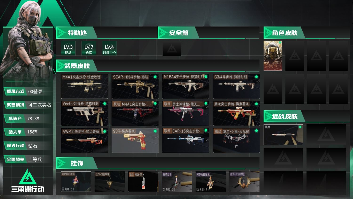 【云游堂】 v26931总资产:78.3M,哈夫币:156W,武器皮肤90,烽火60级:钻石,战场20级:上等兵,通行证29级:通行证免费版 【安全箱】基础安全箱;【特勤处等级】仓库LV.7,指挥中心LV.3,训练中心LV.4,靶场LV.3,潜水中心LV.0,收藏室LV.1;【干员皮肤1】:红狼蚀金玫瑰;【已有捆绑包3】:蚀金玫瑰捆绑包,捞点薯条捆绑包,狩猎时刻捆绑包;【近战皮肤】:近战武器-黑鹰;【步枪皮肤】:M4A1突击步枪-蚀金玫瑰,SCAR-H战斗步枪-启航,M16A4突击步枪-狩猎时刻,G3战斗步枪-狩猎时刻,M4A1突击步枪-阿米娅,腾龙突击步枪-捞点薯条,CAR-15突击步枪-阿米娅,AUG突击步枪-蛇,M16A4突击步枪-竞赛选手,PTR-32突击步枪-英雄,QBZ95-1突击步枪-曙光,AKM突击步枪-林中猎手,QBZ95-1突击步枪-公平竞技,SCAR-H战斗步枪-荣耀列队,PTR-32突击步枪-天网,G3战斗步枪-幻影结构,SCAR-H战斗步枪-童趣,M16A4突击步枪-高雅黑,SCAR-H战斗步枪-数码,K437突击步枪-轻奢武装,QBZ95-1突击步枪-高雅黑,AUG突击步枪-浅蓝涂装,PTR-32突击步枪-黄蜂,M16A4突击步枪-山林猎人,QBZ95-1突击步枪-海浪,K416突击步枪-高雅黑,M4A1突击步枪-海色,SG552突击步枪-浅蓝涂装,AK-12突击步枪-落花,QBZ95-1突击步枪-海色,M4A1突击步枪-高雅黑,腾龙突击步枪-三角洲力量,M4A1突击步枪-粉色涂装,K416突击步枪-几何解构,M7战斗步枪-红色彗星,SG552突击步枪-海浪;【冲锋枪皮肤】:Vector冲锋枪-狩猎时刻,勇士冲锋枪-能天使-午夜邮差,SR-3M紧凑突击步枪-战,勇士冲锋枪-工业狂潮,P90冲锋枪-紧急戒备;【射手步枪皮肤】:SVD狙击步枪-暗夜猎手;【狙击步枪皮肤】:AWM狙击步枪-捞点薯条,SV-98狙击步枪-囚徒,SV-98狙击步枪-林中猎手,M700狙击步枪-竞技风;【霰弹枪皮肤】:M1014霰弹枪-林中猎手;【轻机枪皮肤】:QJB201轻机枪-Old Habits,M250通用机枪-囚徒;【手枪皮肤】:93R-捞点薯条;【挂饰8】:阿萨拉机枪兵,挂饰-蚀金玫瑰,挂饰-黑,重装记者,阿萨拉霰弹兵,挂饰-狩猎时刻,挂饰-阿米娅,挂饰-来点薯条;【货币】0三角币,0曼德尔币,240三角券(典藏皮肤颜色请以典藏展示为准,安全箱等时效性道具请以游戏内数据为准)【QQ登录】【可二次实名】【官方截图】