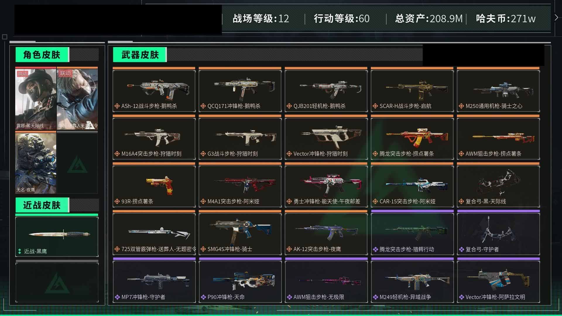 【云游堂】 惠3270321总资产208M,哈夫币271w,枪皮数量191,战场等级:12 列兵,行动等级:60 黑鹰,角色皮肤数量3,露娜-黑天际线/蜂医-送葬人无题密令【个人信息】战场等级:12 列兵,行动等级:60 _黑鹰【哈夫币】271w【总资产】208M【货币】46三角币/31曼德尔币/80三角券【安全箱】基础安全箱2(1x2)/S6高级安全箱6(2x3)【通行证】烽火地带限定版【特勤处】制药台Lv.3/工作台Lv.3/仓库Lv.7/防具台Lv.3/训练中心Lv.5/靶场Lv.2/技术中心Lv.3/指挥中心Lv.3/潜水中心Lv.1/收藏室Lv.1【角色皮肤】露娜-黑天际线/无名-夜鹰/蜂医-送葬人无题密令/【已拥有捆绑包】狩猎时刻捆绑包/捞点薯条捆绑包/【近战皮肤】近战-黑鹰/【步枪皮肤】K416突击步枪-暗鸦/AUG突击步枪-蝮蛇/G3战斗步枪-战场英杰/AK-12突击步枪-夜鹰/SG552突击步枪-深海恐惧/SG552突击步枪-尖端治疗/AS Val突击步枪-尖端治疗/ASh-12战斗步枪-守夜人/AKM突击步枪-林中猎手/PTR-32突击步枪-英雄/AS Val突击步枪-典狱官/腾龙突击步枪-无垢/SCAR-H战斗步枪-囚徒/M16A4突击步枪-竞赛选手/SR-3M紧凑突击步枪-荒野求生/CAR-15突击步枪-阿米娅/M4A1突击步枪-阿米娅/G3战斗步枪-狩猎时刻/M16A4突击步枪-狩猎时刻/腾龙突击步枪-捞点薯条/PTR-32突击步枪-OldHabits/腾龙突击步枪-猎鳄行动/ASh-12战斗步枪-鹅鸭杀/SCAR-H战斗步枪-启航/SR-3M紧凑突击步枪-战术竞备/【冲锋枪皮肤】Vector冲锋枪-狩猎时刻/Vector冲锋枪-阿萨拉文明/MP5冲锋枪-深海恐惧/SMG45冲锋枪-骑士/MP7冲锋枪-无垢/勇士冲锋枪-能天使-午夜邮差/P90冲锋枪-紧急戒备/P90冲锋枪-天命/MP7冲锋枪-守护者/勇士冲锋枪-工业狂潮/QCQ171冲锋枪-鹅鸭杀/【霰弹枪皮肤】M1014霰弹枪-林中猎手/725双管霰弹枪-送葬人-无题密令/【轻机枪皮肤】PKM通用机枪-蝮蛇/PKM通用机枪-英雄/PKM通用机枪-守夜人/PKM通用机枪-荒野求生/M250通用机枪-囚徒/QJB201轻机枪-OldHabits/M249轻机枪-异域战争/M250通用机枪-骑士之心/QJB201轻机枪-鹅鸭杀/【精准射手步枪皮肤】SR-25射手步枪-尖端治疗/PSG-1射手步枪-无垢/【狙击步枪皮肤】SVD狙击步枪-阿萨拉工艺/M700狙击步枪-竞技风/SV-98狙击步枪-囚徒/M700狙击步枪-蝮蛇/SVD狙击步枪-暗夜猎手/M700狙击步枪-守夜人/SV-98狙击步枪-林中猎手/SVD狙击步枪-荒野求生/AWM狙击步枪-捞点薯条/【手枪皮肤】沙漠之鹰-曙光/93R-捞点薯条/【特殊武器】复合弓-黑-天际线/复合弓-守护者/【挂饰】麦小鼠/诡影狙击兵/诡影喷火兵/挂饰-骑士之心/挂饰-维什戴尔/挂饰-大白鹅/挂饰-启程/演出导演/挂饰-小羊/挂饰-彩蛋/阿萨拉盾兵/阿萨拉霰弹兵/阿萨拉狙击兵/挂饰-晶石幻想/挂饰-阿米娅/挂饰-来点薯条/挂饰-狩猎时刻/阿萨拉徽章/紧急会议/【载具】M1A4坦克-烈焰/(典藏皮肤颜色请以典藏展示为准,安全箱等时效性道具请以游戏内数据为准)