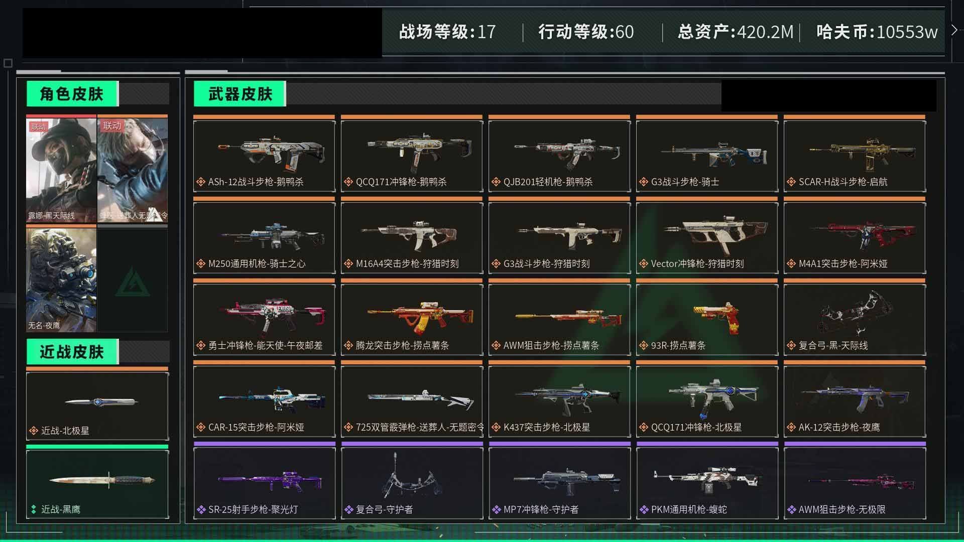【云游堂】 惠1160606总资产420M,哈夫币10553w,枪皮数量168,战场等级:17 列兵,行动等级:60 钻石,角色皮肤数量3,露娜-黑天际线/蜂医-送葬人无题密令【个人信息】战场等级:17 列兵,行动等级:60 钻石【哈夫币】10553w【总资产】420M【货币】0三角币/0曼德尔币/0三角券【安全箱】基础安全箱2(1x2)/S6高级安全箱6(2x3)【通行证】烽火地带限定版【特勤处】制药台Lv.3/工作台Lv.3/仓库Lv.8/防具台Lv.3/训练中心Lv.7/靶场Lv.4/技术中心Lv.3/指挥中心Lv.3/潜水中心Lv.1/收藏室Lv.1【仓库】非洲之心/海洋之泪/【角色皮肤】露娜-黑天际线/无名-夜鹰/蜂医-送葬人无题密令/【已拥有捆绑包】北极星捆绑包/狩猎时刻捆绑包/捞点薯条捆绑包/【近战皮肤】近战-黑鹰/近战-北极星/【步枪皮肤】AK-12突击步枪-夜鹰/SG552突击步枪-深海恐惧/SG552突击步枪-尖端治疗/AS Val突击步枪-尖端治疗/ASh-12战斗步枪-守夜人/AKM突击步枪-林中猎手/PTR-32突击步枪-英雄/K437突击步枪-北极星/AS Val突击步枪-典狱官/腾龙突击步枪-无垢/SCAR-H战斗步枪-囚徒/SR-3M紧凑突击步枪-荒野求生/CAR-15突击步枪-阿米娅/M4A1突击步枪-阿米娅/G3战斗步枪-狩猎时刻/M16A4突击步枪-狩猎时刻/腾龙突击步枪-捞点薯条/G3战斗步枪-骑士/SR-25射手步枪-聚光灯/ASh-12战斗步枪-鹅鸭杀/SCAR-H战斗步枪-启航/SR-3M紧凑突击步枪-战术竞备/【冲锋枪皮肤】Vector冲锋枪-狩猎时刻/Vector冲锋枪-阿萨拉文明/MP5冲锋枪-深海恐惧/勇士冲锋枪-深海恐惧/QCQ171冲锋枪-北极星/MP7冲锋枪-无垢/勇士冲锋枪-能天使-午夜邮差/P90冲锋枪-紧急戒备/MP7冲锋枪-守护者/勇士冲锋枪-工业狂潮/QCQ171冲锋枪-鹅鸭杀/MP5冲锋枪-战术竞备/【霰弹枪皮肤】S12K霰弹枪-曙光/M1014霰弹枪-林中猎手/725双管霰弹枪-送葬人-无题密令/【轻机枪皮肤】PKM通用机枪-蝮蛇/PKM通用机枪-守夜人/PKM通用机枪-荒野求生/QJB201轻机枪-OldHabits/M250通用机枪-骑士之心/QJB201轻机枪-鹅鸭杀/【精准射手步枪皮肤】SR-25射手步枪-尖端治疗/PSG-1射手步枪-无垢/【狙击步枪皮肤】M700狙击步枪-守夜人/SV-98狙击步枪-林中猎手/SVD狙击步枪-荒野求生/AWM狙击步枪-捞点薯条/【手枪皮肤】沙漠之鹰-曙光/93R-捞点薯条/【特殊武器】复合弓-黑-天际线/复合弓-守护者/【挂饰】麦小鼠/诡影狙击兵/诡影喷火兵/挂饰-骑士之心/挂饰-大白鹅/挂饰-启程/挂饰-水墨云图/灵魂摇滚/挂饰-小羊/挂饰-彩蛋/挂饰-旋刃飞行器/阿萨拉喷火兵/挂饰-北极星/挂饰-晶石幻想/挂饰-阿米娅/挂饰-来点薯条/挂饰-狩猎时刻/紧急会议/【载具】M1A4坦克-烈焰/(典藏皮肤颜色请以典藏展示为准,安全箱等时效性道具请以游戏内数据为准) 商品详情