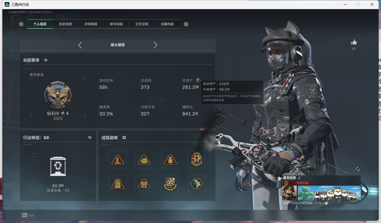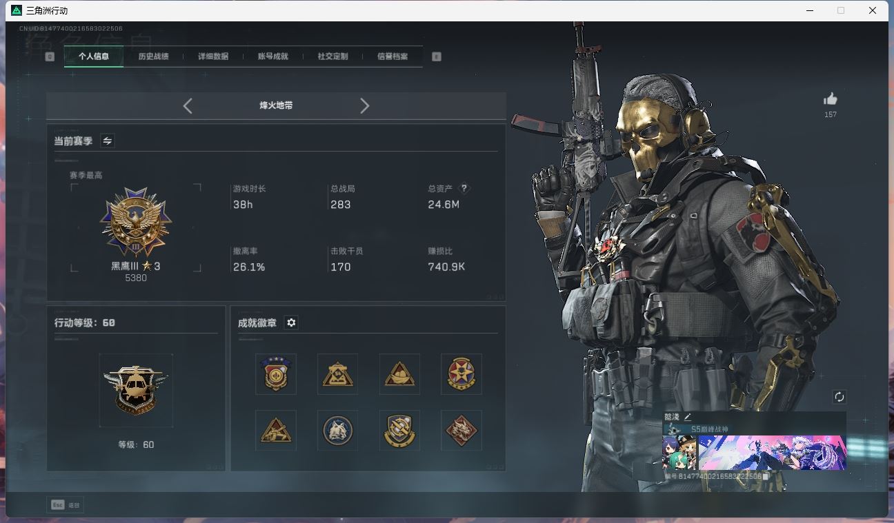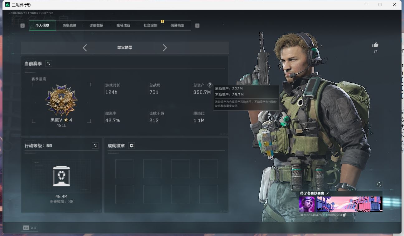 【云游堂】 hmc AK025209【亮点解析 s6赛季3*3】行动等级:60黑鹰,总资产350.7m哈夫币 【呛皮:联动 M4A1突击步枪-阿米娅 ASh-12战斗步枪-鹅鸭杀 联动 CAR-15突击步枪-阿米娅 UZ1冲锋枪-特斯拉线园 SR-3M紧凑突击步枪-特斯拉线围 联动 勇士冲锋枪-能天使-午夜邮差 0C0171冲锋枪-鹅鸭杀】【角色皮肤:蛊-午夜邮差】【近战:黑鹰】----安全箱等时效性道具请以游戏内数据为准:详情请看图----截图展示段位不代实际段位,赛季更新等不可抗拒因素发生变化、时限道具不保证所剩时间、标题未写送三角币默认不送】【主播担保+安全至上+性价比 买号卖号只选金牌商家一左友】