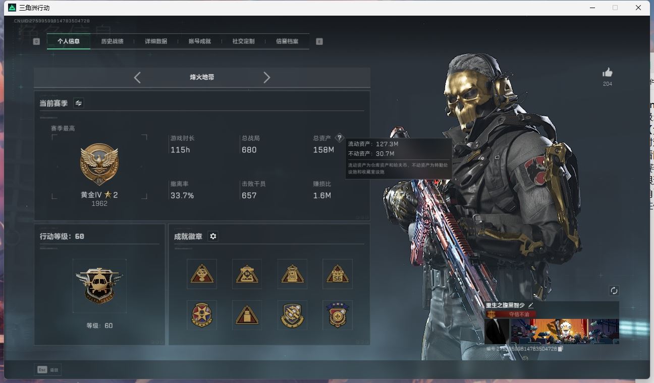 【云游堂】 hmcAK025157【可二次】【亮点解析 s6赛季3*3 m7高达模版 3红皮 北极星 】行动等级:60黄金,总资产158m哈夫币 【M7战斗步枪-棱镜攻势S2(极品c)】【呛皮:联动 M4A1突击步枪-阿米娅M4A1突击步枪-蚀金玫璃 0B295-1突击步枪-破军 ASh-12战斗步枪-鹅鸭杀 SCAR-H战斗步枪-水墨云图 AK-12突击步枪-特斯拉线圈 CAR-15突击步枪-阿米娅 AS Val突击步枪-蛇年祥瑞 K437突击步枪-北极星 UZ1冲锋枪-特斯拉线圈 SR-3M紧凑突击步枪-待斯拉线圈 联动 勇士冲锋枪-能天使-午夜邮差 0C0171冲锋枪-北极星 联动 725双管殿弹枪-送葬人-无题密令 SR-25射手步枪-水墨云图】 【角色皮肤:红狼-蚀金玫瑰 威龙-铁面判官 牧羊人-街头之王 露娜-黑天际线 骇爪-水墨云图 】【近战:北极星 黑鹰 】,安全箱等时效性道具请以游戏内数据为准:详情请看图----截图展示段位不代实际段位,赛季更新等不可抗拒因素发生变化、时限道具不保证所剩时间、标题未写送三角币默认不送】【主播担保+安全至上+性价比 买号卖号只选金牌商家一左友】