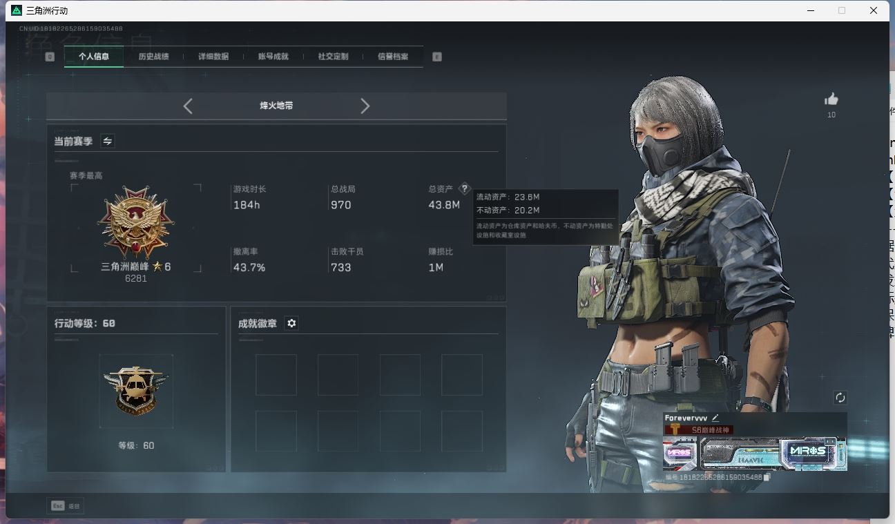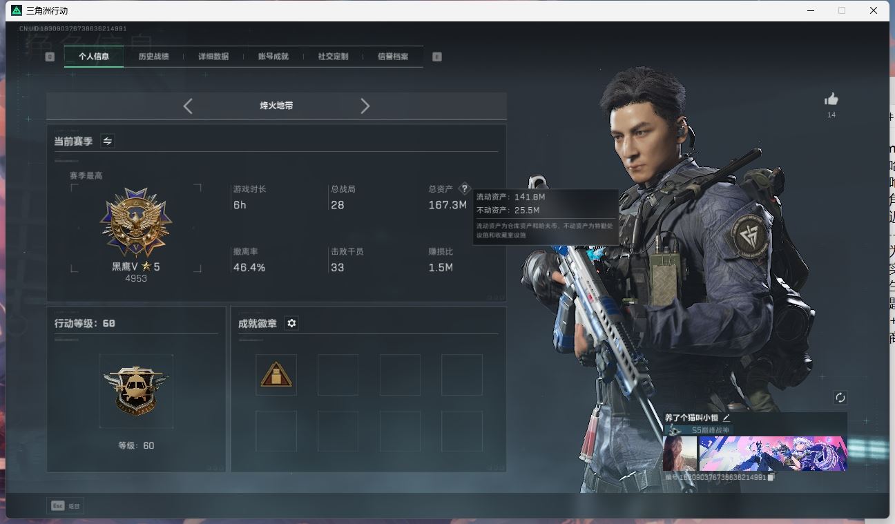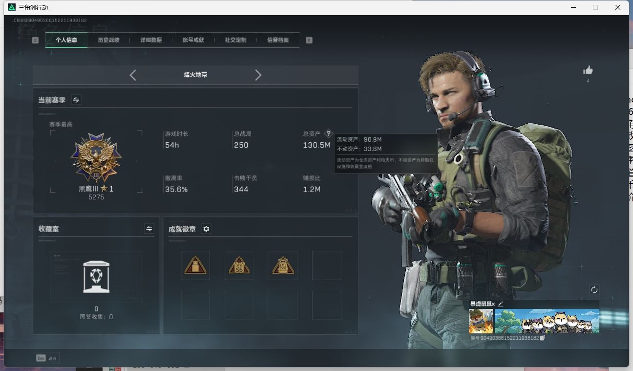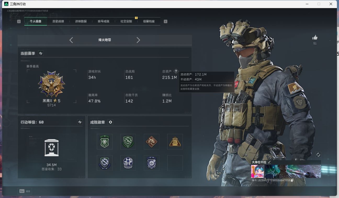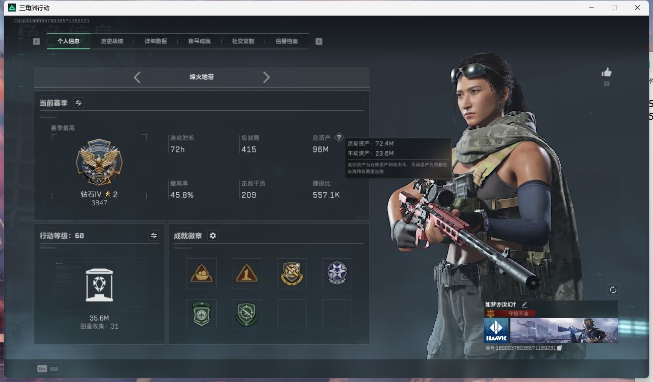 【云游堂】 hmc AK025479 行动等级:60三角洲巅峰,总资产43.8m哈夫币 【腾龙突击步枪-气象感应(极品a 冰)】【呛皮:联动 M4A1突击步枪-阿米娅 ASh-12战斗步枪-鹅鸭杀 M16A4突击步枪-狩猎时刻 SCAR-H战斗步枪-启航 G3战斗步枪-狩猎时刻 联动 Vector冲锋枪-能天使Vector冲锋枪-狩猎时刻 联动 CAR-15突击步枪-阿米娅 联动 725双管假弹枪-送葬人-无题密令】【角色皮肤:蜂医-送葬人无题密令】【近战:黑鹰】----安全箱等时效性道具请以游戏内数据为准:详情请看图----截图展示段位不代实际段位,赛季更新等不可抗拒因素发生变化、时限道具不保证所剩时间、标题未写送三角币默认不送】【主播担保+安全至上+性价比 买号卖号只选金牌商家一左友】