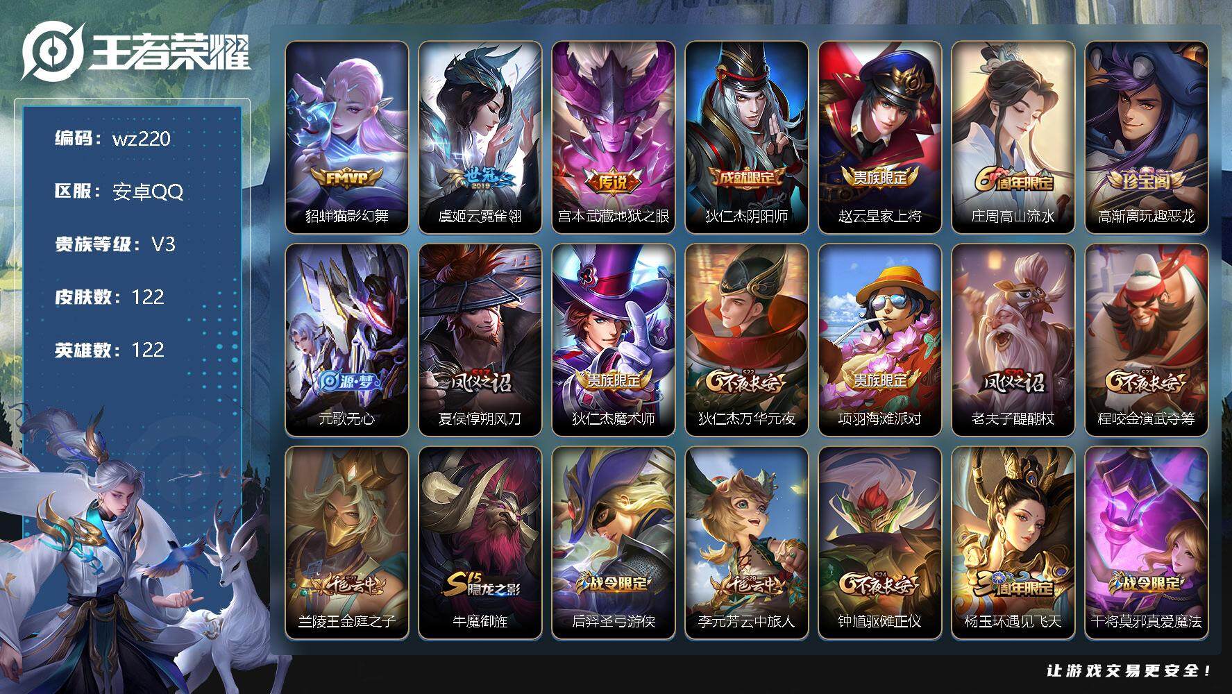 【云游堂】 【可二次实名】【wz220】【商品标题】:安卓Q-V3-最强王者段位-122英雄-122皮肤-0典藏-0珍品无双-0无双-0珍品传说-3传说-35史诗 【传说皮肤】:貂蝉猫影幻舞,虞姬云霓雀翎,宫本武藏地狱之眼 【限定皮肤】:狄仁杰阴阳师,赵云皇家上将,庄周高山流水,高渐离玩趣恶龙,元歌无心,夏侯惇朔风刀,狄仁杰魔术师,狄仁杰万华元夜,项羽海滩派对,老夫子醍醐杖,程咬金演武夺筹,兰陵王金庭之子,牛魔御旌,后羿圣弓游侠,李元芳云中旅人,钟馗驱傩正仪,杨玉环遇见飞天,干将莫邪真爱魔法,蔡文姬繁星吟游,鬼谷子原初探秘者,鬼谷子五谷丰年,苏烈千军破阵,百里守约朱雀志,弈星混沌棋,沈梦溪大漠名商,明世隐疑决卦,裴擒虎李小龙,裴擒虎擒涛扼浪,云中君纤云弄巧,盾山御銮,嫦娥拒霜思,鲁班大师探海日志,桑启海盐诗旅,张良古海寻踪 【年限皮肤】:百里守约朱雀志 【赛季限定】:夏侯惇朔风刀,狄仁杰万华元夜,老夫子醍醐杖,程咬金演武夺筹,兰陵王金庭之子,张良古海寻踪,牛魔御旌,李元芳云中旅人,钟馗驱傩正仪,鬼谷子原初探秘者,苏烈千军破阵,弈星混沌棋,沈梦溪大漠名商,明世隐疑决卦,裴擒虎擒涛扼浪,盾山御銮,鲁班大师探海日志,桑启海盐诗旅 【战令限定】:后羿圣弓游侠,干将莫邪真爱魔法 【史诗皮肤】:露娜紫霞仙子,赵云皇家上将,甄姬冰雪圆舞曲,狄仁杰魔术师,廉颇地狱岩魂,孙尚香水果甜心,妲己魅力维加斯,妲己女仆咖啡,墨子龙骑士,墨子金属风暴,吕布圣诞狂欢,吕布末日机甲,张飞乱世虎臣,花木兰水晶猎龙者,夏侯惇乘风破浪,兰陵王暗隐猎兽者,诸葛亮黄金分割率,雅典娜冰冠公主,李元芳逐浪之夏,程咬金功夫厨神,阿轲节奏热浪,杨玉环遇见飞天,孙策猫狗日记,百里守约朱雀志,狄仁杰鹰眼统帅,蔡文姬繁星吟游,橘右京修罗,裴擒虎李小龙,云中君纤云弄巧,杨戬天秀启明,干将莫邪真爱魔法,庄周高山流水,嫦娥拒霜思,鬼谷子五谷丰年,元歌无心 【其他皮肤】:项羽海滩派对,韩信教廷特使,韩信街头霸王,露娜哥特玫瑰,达摩大发明家,赵云白执事,赵云忍炎影,程咬金星际陆战队,白起白色死神,扁鹊化身博士,扁鹊救世之瞳,孙膑天使之翼,姜子牙时尚教父,典韦黄金武士,亚瑟死亡骑士,花木兰兔女郎,甄姬花好人间,狄仁杰阴阳师,关羽龙腾万里,钟无艳海滩丽影,宫本武藏霸王丸,老夫子功夫老勺,诸葛亮掌控之力,李白敏锐之力,苏烈坚韧之力,庄周奇妙博物学,牛魔御旌,小乔丁香结,吕布野性能量,盾山御銮,高渐离玩趣恶龙,沈梦溪鲨炮海盗猫,姜子牙炽热元素使,夏侯惇朔风刀,弈星混沌棋,明世隐疑决卦,老夫子醍醐杖,狂铁特工战影,鬼谷子原初探秘者,狄仁杰万华元夜,刘禅秘密基地,程咬金演武夺筹,张良缤纷绘卷,钟馗驱傩正仪,鲁班大师乓乓大师,苏烈千军破阵,后羿圣弓游侠,兰陵王金庭之子,沈梦溪大漠名商,蒙恬蔚蓝守将,李元芳云中旅人,桑启海盐诗旅,猪八戒潮玩探月行,裴擒虎擒涛扼浪,太乙真人劲辣红锅,鲁班大师探海日志,张良古海寻踪,姜子牙星梦巡礼,钟馗虚灵犬护,露娜命运加冕,项羽帝国元帅,钟无艳生化警戒,老夫子潮流仙人,曹操超能战警,刘禅英喵野望,李元芳特种部队,蔡文姬蔷薇王座,马可波罗激情绿茵,苍维京掠夺者,哪吒三太子,诸葛亮星航指挥官,大乔伊势巫女,干将莫邪第七人偶,百里守约绝影神枪,百里玄策威尼斯狂欢,梦奇美梦成真,公孙离花间舞,杨玉环霓裳曲,上官婉儿修竹墨客,嫦娥露花倒影,猪八戒年年有余,马超幸存者,阿古朵熊喵少女,云缨赤焰之缨 【内测皮肤】:高渐离玩趣恶龙,狂铁特工战影 【营地ID】:1736050966