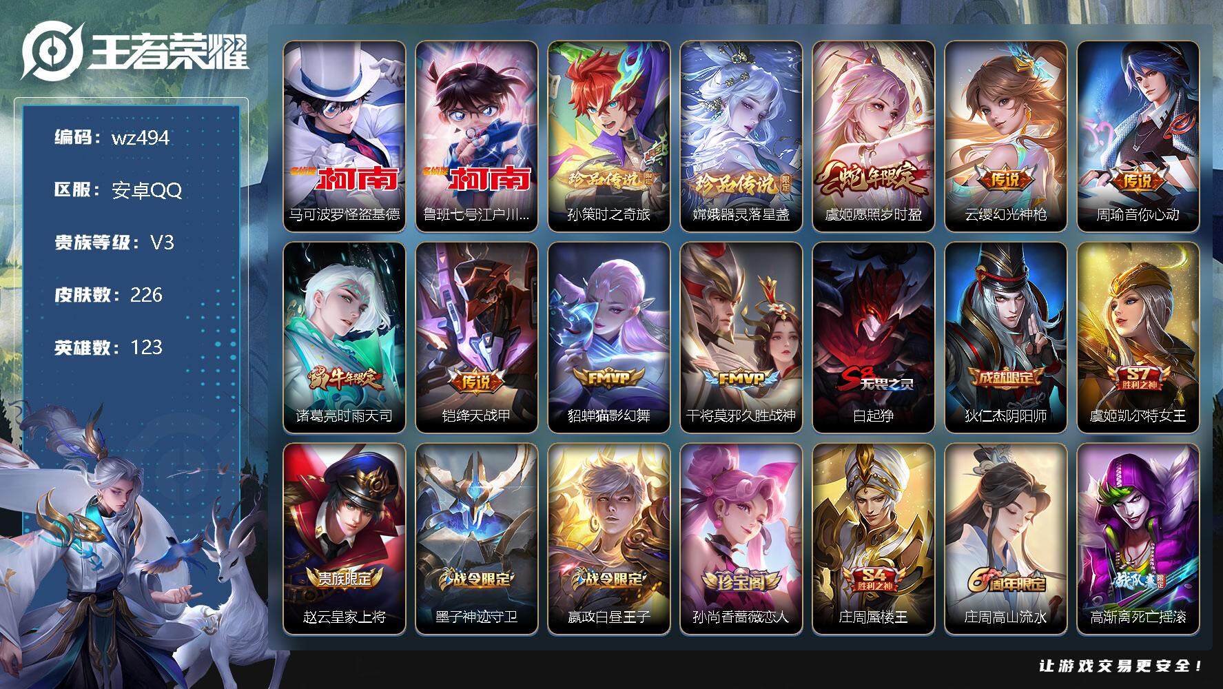 【云游堂】 【可二次实名】【wz494】【商品标题】:安卓Q-V3-至尊星耀III段位-123英雄-226皮肤-0典藏-0珍品无双-0无双-4珍品传说-7传说-65史诗 【珍品传说】:马可波罗怪盗基德,鲁班七号江户川柯南,孙策时之奇旅,嫦娥器灵落星盏 【传说皮肤】:虞姬愿照岁时盈,云缨幻光神枪,周瑜音你心动,诸葛亮时雨天司,铠绛天战甲,貂蝉猫影幻舞,干将莫邪久胜战神 【限定皮肤】:白起狰,狄仁杰阴阳师,虞姬凯尔特女王,赵云皇家上将,墨子神迹守卫,嬴政白昼王子,孙尚香蔷薇恋人,庄周蜃楼王,庄周高山流水,高渐离死亡摇滚,阿轲迷踪丽影,孙膑妖精王,扁鹊炼金王,芈月重明,芈月白晶晶,吕布猎兽之王,周瑜赤莲之焰,元歌云间偶戏,夏侯惇朔风刀,曹操烛龙,典韦穷奇,典韦蓝屏警告,马可波罗暗影游猎,狄仁杰魔术师,狄仁杰万华元夜,达摩星际陆战队,达摩沙漠行僧,项羽海滩派对,老夫子醍醐杖,老夫子航海奇遇记,关羽冰锋战神,程咬金演武夺筹,刘邦夺宝奇兵,韩信逐梦之影,兰陵王驯魔猎人,兰陵王金庭之子,亚瑟狮心王,亚瑟潮玩骑士王,孙悟空孙行者,牛魔御旌,后羿圣弓游侠,李元芳云中旅人,钟馗驱傩正仪,女娲朔望之晖,干将莫邪冰霜恋舞曲,干将莫邪真爱魔法,雅典娜单词大作战,雅典娜黎明之约,太乙真人饕餮,鬼谷子原初探秘者,诸葛亮时雨天司,黄忠烈魂,苏烈千军破阵,百里玄策原初追逐者,百里守约朱雀志,弈星混沌棋,梦奇顽趣,公孙离玉兔公主,沈梦溪大漠名商,明世隐疑决卦,裴擒虎李小龙,裴擒虎擒涛扼浪,狂铁御狮,米莱狄御霄,米莱狄胡桃异想国,云中君纤云弄巧,盾山御銮,猪八戒西部大镖客,猪八戒猪悟能,上官婉儿天狼绘梦者,嫦娥拒霜思,蒙犽狂想玩偶喵,镜匿光追影者,桑启海盐诗旅,张良古海寻踪,鬼谷子天穹祈灯 【年限皮肤】:百里守约朱雀志,诸葛亮时雨天司,黄忠烈魂 【赛季限定】:庄周蜃楼王,孙膑妖精王,扁鹊炼金王,白起狰,芈月重明,夏侯惇朔风刀,曹操烛龙,典韦穷奇,狄仁杰万华元夜,达摩沙漠行僧,老夫子醍醐杖,程咬金演武夺筹,兰陵王金庭之子,张良古海寻踪,亚瑟狮心王,牛魔御旌,李元芳云中旅人,虞姬凯尔特女王,钟馗驱傩正仪,雅典娜黎明之约,太乙真人饕餮,鬼谷子原初探秘者,苏烈千军破阵,百里玄策原初追逐者,弈星混沌棋,梦奇顽趣,沈梦溪大漠名商,明世隐疑决卦,裴擒虎擒涛扼浪,狂铁御狮,米莱狄御霄,盾山御銮,桑启海盐诗旅,鬼谷子天穹祈灯 【战令限定】:墨子神迹守卫,嬴政白昼王子,阿轲迷踪丽影,吕布猎兽之王,周瑜赤莲之焰,元歌云间偶戏,典韦蓝屏警告,马可波罗暗影游猎,达摩星际陆战队,老夫子航海奇遇记,刘邦夺宝奇兵,兰陵王驯魔猎人,亚瑟潮玩骑士王,后羿圣弓游侠,女娲朔望之晖,干将莫邪真爱魔法,雅典娜单词大作战,米莱狄胡桃异想国,猪八戒西部大镖客,蒙犽狂想玩偶喵 【史诗皮肤】:鲁班七号电玩小子,赵云皇家上将,赵云未来纪元,甄姬冰雪圆舞曲,王昭君偶像歌手,狄仁杰魔术师,孙尚香蔷薇恋人,孙尚香水果甜心,妲己魅力维加斯,墨子金属风暴,吕布圣诞狂欢,李白千年之狐,吕布末日机甲,关羽冰锋战神,花木兰水晶猎龙者,刘邦德古拉伯爵,韩信逐梦之影,夏侯惇乘风破浪,兰陵王暗隐猎兽者,诸葛亮黄金分割率,亚瑟心灵战警,雅典娜冰冠公主,百里守约特工魅影,刘禅天才门将,白起星夜王子,嬴政白昼王子,孙策猫狗日记,百里守约朱雀志,干将莫邪冰霜恋舞曲,典韦蓝屏警告,伽罗箭羽风息,狄仁杰鹰眼统帅,兰陵王驯魔猎人,不知火舞魅语,阿轲迷踪丽影,瑶遇见神鹿,黄忠烈魂,上官婉儿天狼绘梦者,马可波罗暗影游猎,蒙犽狂想玩偶喵,百里玄策原初追逐者,裴擒虎李小龙,云中君纤云弄巧,元歌云间偶戏,芈月白晶晶,米莱狄胡桃异想国,老夫子航海奇遇记,干将莫邪真爱魔法,沈梦溪月团寄思,安琪拉时之奇旅,孙悟空孙行者,猪八戒猪悟能,庄周高山流水,嫦娥拒霜思,镜匿光追影者,雅典娜黎明之约,公孙离玉兔公主,澜赏金猎手,梦奇顽趣,百里守约百相守梦,白起苍鳞隐世,阿轲化蝶舞,刘禅鸭鸭历险记,狂铁龙之律动,百里守约雪豹霜爪 【其他皮肤】:项羽海滩派对,韩信教廷特使,韩信街头霸王,露娜哥特玫瑰,阿轲爱心护理,武则天东方不败,扁鹊化身博士,安琪拉玩偶对对碰,孙膑天使之翼,妲己少女阿狸,典韦黄金武士,亚瑟死亡骑士,达摩拳王,花木兰兔女郎,张飞五福同心,刘备万事如意,宫本武藏万象初新,亚瑟狮心王,后羿阿尔法小队,狄仁杰阴阳师,庄周蜃楼王,刘备纽约教父,高渐离死亡摇滚,孙膑妖精王,刘备汉昭烈帝,扁鹊炼金王,关羽龙腾万里,虞姬凯尔特女王,白起狰,钟无艳海滩丽影,太乙真人饕餮,宫本武藏霸王丸,曹操烛龙,王昭君幻想奇妙夜,芈月重明,老夫子功夫老勺,牛魔制霸全明星,孙尚香沉稳之力,典韦穷奇,诸葛亮掌控之力,鬼谷子幻乐之宴,狂铁御狮,苏烈坚韧之力,米莱狄御霄,吕布猎兽之王,明世隐虹云星官,牛魔御旌,女娲朔望之晖,小乔