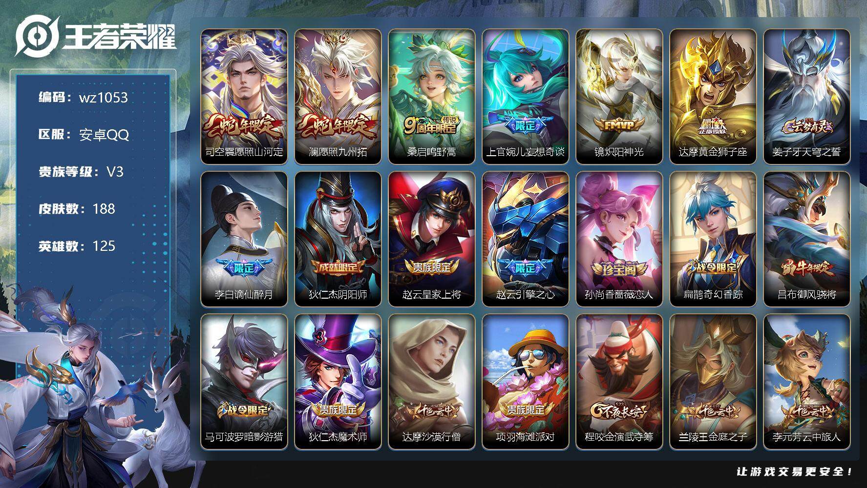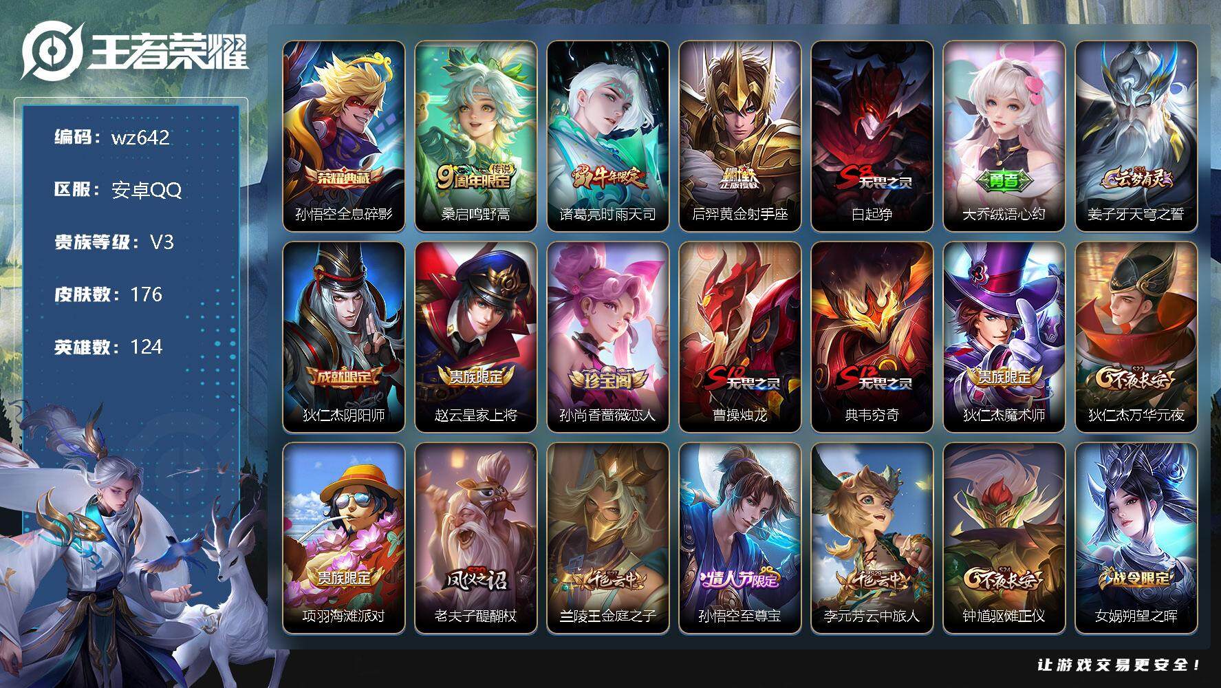【云游堂】 【可二次实名】【wz1053】【商品标题】:安卓Q-V3-至尊星耀IV段位-125英雄-188皮肤-0典藏-0珍品无双-0无双-0珍品传说-6传说-60史诗 【传说皮肤】:司空震愿照山河定,澜愿照九州拓,桑启鸣野蒿,上官婉儿妄想奇谈,镜炽阳神光,达摩黄金狮子座 【限定皮肤】:姜子牙天穹之誓,李白谪仙醉月,狄仁杰阴阳师,赵云皇家上将,赵云引擎之心,孙尚香蔷薇恋人,扁鹊奇幻香踪,吕布御风骁将,马可波罗暗影游猎,狄仁杰魔术师,达摩沙漠行僧,项羽海滩派对,程咬金演武夺筹,兰陵王金庭之子,李元芳云中旅人,钟馗驱傩正仪,杨戬潮玩骑兵,雅典娜黎明之约,苏烈千军破阵,百里玄策原初追逐者,沈梦溪大漠名商,裴擒虎擒涛扼浪,上官婉儿梁祝,上官婉儿妄想奇谈,嫦娥拒霜思,鲁班大师探海日志,桑启海盐诗旅,艾琳流音漫舞,赵怀真鹤归松栖,司空震地狱燃心,阿古朵江河有灵,张良古海寻踪,蒙犽百解令,蒙恬荣光圣徽,鬼谷子天穹祈灯,沈梦溪龙舞盛年,鲁班七号蔬乡物语,李元芳蔬乡物语,刘邦剑破天穹 【年限皮肤】:吕布御风骁将 【赛季限定】:达摩沙漠行僧,程咬金演武夺筹,兰陵王金庭之子,张良古海寻踪,李元芳云中旅人,钟馗驱傩正仪,雅典娜黎明之约,苏烈千军破阵,百里玄策原初追逐者,沈梦溪大漠名商,裴擒虎擒涛扼浪,鲁班大师探海日志,桑启海盐诗旅,鬼谷子天穹祈灯,蒙恬荣光圣徽,刘邦剑破天穹,姜子牙天穹之誓 【战令限定】:扁鹊奇幻香踪,马可波罗暗影游猎,艾琳流音漫舞,杨戬潮玩骑兵,司空震地狱燃心,鲁班七号蔬乡物语,李元芳蔬乡物语 【史诗皮肤】:露娜紫霞仙子,赵云皇家上将,貂蝉圣诞恋歌,甄姬冰雪圆舞曲,狄仁杰魔术师,宫本武藏鬼剑武藏,孙尚香蔷薇恋人,孙尚香水果甜心,嬴政摇滚巨星,妲己魅力维加斯,妲己女仆咖啡,墨子金属风暴,曹操幽灵船长,李白千年之狐,吕布末日机甲,张飞乱世虎臣,赵云引擎之心,花木兰水晶猎龙者,刘邦德古拉伯爵,夏侯惇乘风破浪,兰陵王暗隐猎兽者,诸葛亮黄金分割率,安琪拉心灵骇客,百里守约特工魅影,蔡文姬舞动绿茵,李元芳逐浪之夏,白起星夜王子,阿轲节奏热浪,大乔猫狗日记,伽罗箭羽风息,狄仁杰鹰眼统帅,上官婉儿梁祝,娜可露露晚萤,不知火舞魅语,马可波罗暗影游猎,百里玄策原初追逐者,吕布御风骁将,杨戬天秀启明,嫦娥拒霜思,雅典娜黎明之约,澜赏金猎手,扁鹊奇幻香踪,刘禅电玩爆裂旋风,赵怀真鹤归松栖,司空震地狱燃心,阿古朵江河有灵,蒙犽百解令,蒙恬荣光圣徽,鲁班七号蔬乡物语,亚连破空之剑,李白谪仙醉月,百里守约百相守梦,牛魔星界战将,孙膑茶境仙,弈星万物之道,赵怀真器灵浮梦炉,阿轲化蝶舞,刘禅鸭鸭历险记,狂铁龙之律动,百里守约雪豹霜爪 【其他皮肤】:项羽海滩派对,韩信教廷特使,韩信街头霸王,达摩大发明家,赵云白执事,赵云忍炎影,程咬金星际陆战队,白起白色死神,牛魔西部大镖客,扁鹊救世之瞳,孙膑天使之翼,妲己少女阿狸,典韦黄金武士,亚瑟死亡骑士,张飞五福同心,后羿阿尔法小队,狄仁杰阴阳师,刘备纽约教父,刘备汉昭烈帝,关羽龙腾万里,老夫子功夫老勺,诸葛亮掌控之力,明世隐虹云星官,小乔丁香结,吕布野性能量,姜子牙炽热元素使,哪吒次元突破,狂铁特工战影,程咬金演武夺筹,钟馗驱傩正仪,鲁班大师乓乓大师,苏烈千军破阵,妲己紫罗兰之誓,马可波罗潮玩牛仔,达摩沙漠行僧,程咬金无双福将,兰陵王金庭之子,刘禅唤灵魔甲,沈梦溪大漠名商,蒙恬蔚蓝守将,李元芳云中旅人,戈娅危途狂花,桑启海盐诗旅,猪八戒潮玩探月行,赵怀真太极少年,裴擒虎擒涛扼浪,杨戬潮玩骑兵,太乙真人劲辣红锅,莱西奥西部游侠,鲁班大师探海日志,李元芳妄想特派,艾琳流音漫舞,张良古海寻踪,钟无艳聚星闪耀,海月王牌新星,亚连破局者,曹操决胜大满贯,鬼谷子天穹祈灯,海诺时空谍影,廉颇功夫炙烤,沈梦溪龙舞盛年,钟无艳春野之旅,李元芳蔬乡物语,刘邦剑破天穹,姜子牙天穹之誓,孙悟空神迹守卫,盘古敬我三分,东皇太一噬灭天穹,老夫子百相守梦,干将莫邪雾都夜雨,吕布逐霄战戟,苍苍林狼骑,太乙真人谧流熔炉,典韦铁骨偃魂,马超访茗客,姜子牙星梦巡礼,戈娅玫蓝誓约,刘备浪漫序章,钟馗虚灵犬护,沈梦溪鸭鸭历险记,苏烈春野闲踪,小乔秘证寻踪,张良灵野札记,莱西奥踏浪烽翎,亚瑟荣光之誓,高渐离金属狂潮,露娜绯红之刃,貂蝉异域舞娘,老夫子潮流仙人,小乔万圣前夜,孙悟空西部大镖客,周瑜海军大将,李白范海辛,虞姬加勒比小姐,雅典娜战争女神,马可波罗激情绿茵,苍维京掠夺者,杨戬埃及法老,干将莫邪第七人偶,铠龙域领主,百里守约绝影神枪,梦奇美梦成真,女娲尼罗河女神,明世隐占星师,公孙离花间舞,弈星踏雪寻梅,元歌午夜歌剧院,孙策海之征途,司马懿魇语军师,伽罗花见巫女,李信灼热之刃,上官婉儿修竹墨客,瑶森,曜归虚梦演,马超幸存者,西施归虚梦演,镜冰刃幻境,蒙恬秩序猎龙将,司空震启蛰,云缨赤焰