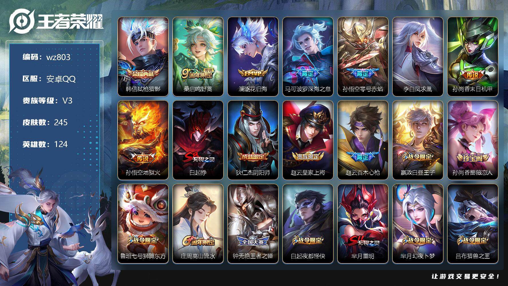 【云游堂】 【可二次实名】【wz803】【商品标题】:安卓Q-V3-尊贵铂金II段位-124英雄-245皮肤-1典藏-0珍品无双-0无双-0珍品传说-7传说-53史诗 【荣耀典藏】:韩信弑枪猎影 【传说皮肤】:桑启鸣野蒿,澜逐花归海,马可波罗深海之息,孙悟空零号赤焰,李白凤求凰,孙尚香末日机甲,孙悟空地狱火 【限定皮肤】:白起狰,狄仁杰阴阳师,赵云皇家上将,赵云百木心枪,嬴政白昼王子,孙尚香蔷薇恋人,鲁班七号狮舞东方,庄周高山流水,钟无艳王者之锤,白起夜都怪侠,芈月重明,芈月幻夜卜梦,吕布猎兽之王,周瑜赤莲之焰,夏侯惇朔风刀,甄姬游园惊梦,曹操烛龙,典韦穷奇,典韦蓝屏警告,马可波罗暗影游猎,马可波罗深海之息,狄仁杰魔术师,狄仁杰万华元夜,达摩沙漠行僧,项羽海滩派对,老夫子醍醐杖,关羽冰锋战神,程咬金演武夺筹,兰陵王驯魔猎人,兰陵王金庭之子,孙悟空美猴王,孙悟空至尊宝,孙悟空大圣娶亲,孙悟空零号赤焰,孙悟空孙行者,牛魔御旌,李元芳银河之约,李元芳云中旅人,钟馗神迹守卫,钟馗驱傩正仪,杨玉环遇见飞天,女娲朔望之晖,蔡文姬繁星吟游,太乙真人饕餮,鬼谷子原初探秘者,黄忠火炮绅士,苏烈千军破阵,弈星混沌棋,沈梦溪星空之诺,沈梦溪大漠名商,明世隐疑决卦,明世隐吟游魔法,裴擒虎李小龙,裴擒虎擒涛扼浪,狂铁御狮,米莱狄御霄,云中君纤云弄巧,盾山御銮,猪八戒西部大镖客,上官婉儿梁祝,鲁班大师探海日志,桑启海盐诗旅,张良古海寻踪,鬼谷子天穹祈灯,姬小满妄想食味,刘邦剑破天穹,程咬金群星魔术团,周瑜熔金海岸 【年限皮肤】:孙悟空美猴王,李白凤求凰 【赛季限定】:白起狰,芈月重明,夏侯惇朔风刀,曹操烛龙,典韦穷奇,狄仁杰万华元夜,达摩沙漠行僧,老夫子醍醐杖,程咬金演武夺筹,兰陵王金庭之子,张良古海寻踪,牛魔御旌,李元芳云中旅人,钟馗驱傩正仪,太乙真人饕餮,鬼谷子原初探秘者,苏烈千军破阵,弈星混沌棋,沈梦溪大漠名商,明世隐疑决卦,裴擒虎擒涛扼浪,狂铁御狮,米莱狄御霄,盾山御銮,鲁班大师探海日志,桑启海盐诗旅,鬼谷子天穹祈灯,刘邦剑破天穹 【战令限定】:嬴政白昼王子,鲁班七号狮舞东方,白起夜都怪侠,芈月幻夜卜梦,吕布猎兽之王,周瑜赤莲之焰,典韦蓝屏警告,马可波罗暗影游猎,兰陵王驯魔猎人,李元芳银河之约,钟馗神迹守卫,女娲朔望之晖,黄忠火炮绅士,沈梦溪星空之诺,明世隐吟游魔法,猪八戒西部大镖客 【史诗皮肤】:钟无艳王者之锤,赵云皇家上将,赵云未来纪元,貂蝉圣诞恋歌,甄姬冰雪圆舞曲,狄仁杰魔术师,宫本武藏鬼剑武藏,孙尚香蔷薇恋人,孙尚香水果甜心,嬴政摇滚巨星,妲己魅力维加斯,墨子金属风暴,吕布圣诞狂欢,曹操幽灵船长,李白千年之狐,张飞乱世虎臣,韩信白龙吟,关羽冰锋战神,孙悟空至尊宝,花木兰水晶猎龙者,刘邦德古拉伯爵,兰陵王暗隐猎兽者,诸葛亮黄金分割率,甄姬游园惊梦,亚瑟心灵战警,安琪拉心灵骇客,百里守约特工魅影,李元芳逐浪之夏,阿轲节奏热浪,杨玉环遇见飞天,嬴政白昼王子,孙策猫狗日记,大乔猫狗日记,孙悟空大圣娶亲,典韦蓝屏警告,鲁班七号狮舞东方,狄仁杰鹰眼统帅,兰陵王驯魔猎人,上官婉儿梁祝,蔡文姬繁星吟游,李元芳银河之约,不知火舞魅语,橘右京修罗,马可波罗暗影游猎,裴擒虎李小龙,云中君纤云弄巧,孙悟空孙行者,庄周高山流水,黄忠火炮绅士,赵云百木心枪,明世隐吟游魔法,刘禅电玩爆裂旋风,姬小满妄想食味 【其他皮肤】:项羽海滩派对,韩信教廷特使,韩信街头霸王,露娜哥特玫瑰,阿轲爱心护理,达摩大发明家,赵云白执事,赵云忍炎影,芈月红桃皇后,白起白色死神,武则天东方不败,扁鹊化身博士,宫本武藏未来纪元,安琪拉玩偶对对碰,孙膑天使之翼,姜子牙时尚教父,妲己少女阿狸,典韦黄金武士,亚瑟死亡骑士,达摩拳王,孙悟空美猴王,花木兰兔女郎,张飞五福同心,甄姬花好人间,刘备万事如意,宫本武藏万象初新,后羿阿尔法小队,狄仁杰阴阳师,刘备纽约教父,刘备汉昭烈帝,关羽龙腾万里,墨子进击墨子号,白起狰,钟无艳海滩丽影,太乙真人饕餮,宫本武藏霸王丸,曹操烛龙,王昭君幻想奇妙夜,芈月重明,老夫子功夫老勺,牛魔制霸全明星,孙尚香沉稳之力,典韦穷奇,李白敏锐之力,鬼谷子幻乐之宴,狂铁御狮,苏烈坚韧之力,大乔守护之力,米莱狄御霄,吕布猎兽之王,明世隐虹云星官,张良幽兰居士,牛魔御旌,女娲朔望之晖,小乔丁香结,吕布野性能量,钟馗神迹守卫,盾山御銮,孙膑归虚梦演,沈梦溪鲨炮海盗猫,姜子牙炽热元素使,夏侯惇朔风刀,周瑜赤莲之焰,沈梦溪星空之诺,弈星混沌棋,哪吒次元突破,明世隐疑决卦,盾山圆桌骑士,老夫子醍醐杖,猪八戒西部大镖客,狂铁特工战影,鬼谷子原初探秘者,狄仁杰万华元夜,刘禅秘密基地,杨戬次元傲视,程咬金演武夺筹,张良缤纷绘卷,钟馗驱傩正仪,鲁班大师乓乓大师,苏烈千军破阵,达摩沙漠行僧,芈月幻夜卜梦,程咬金无双福将,白起夜