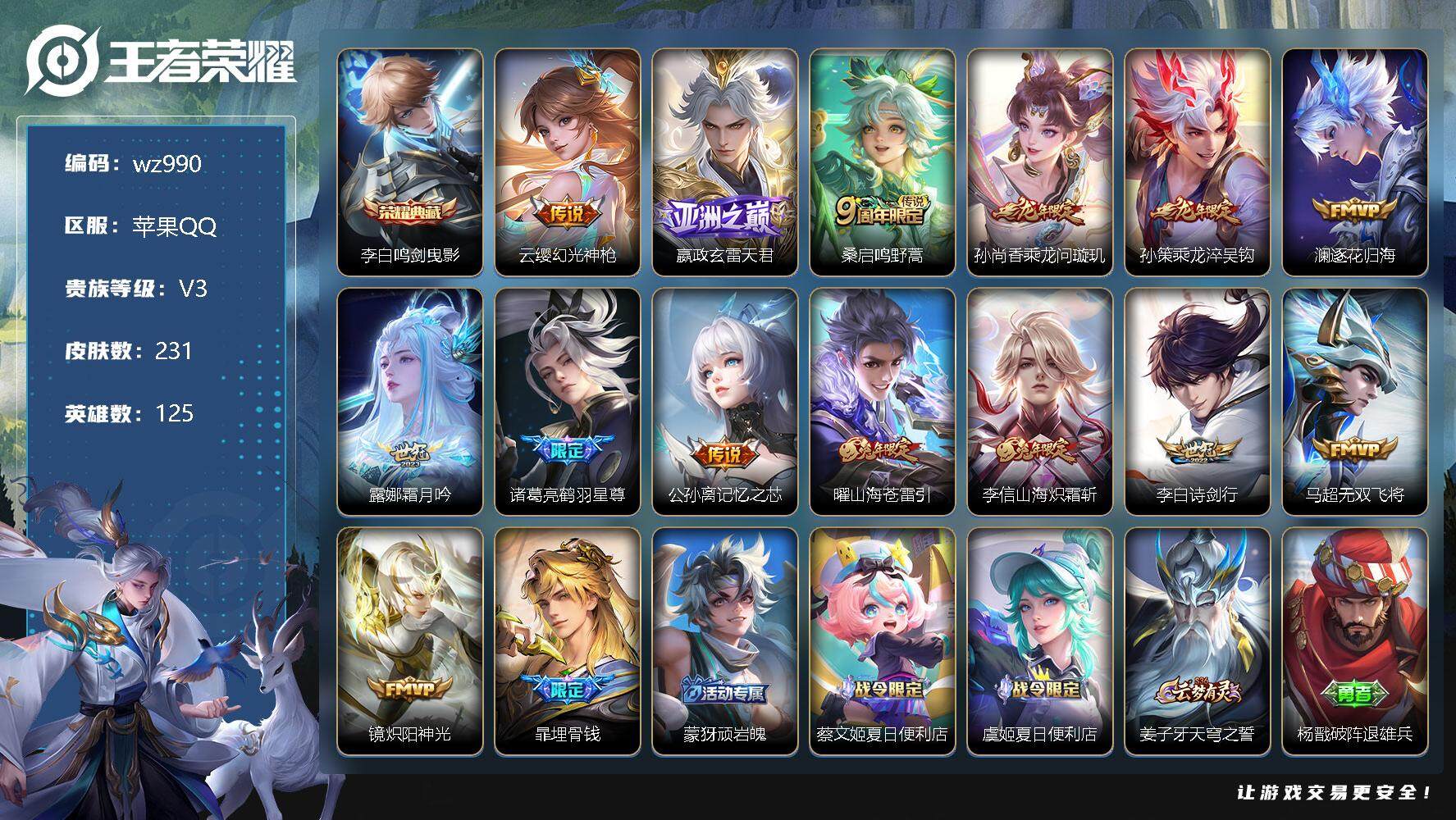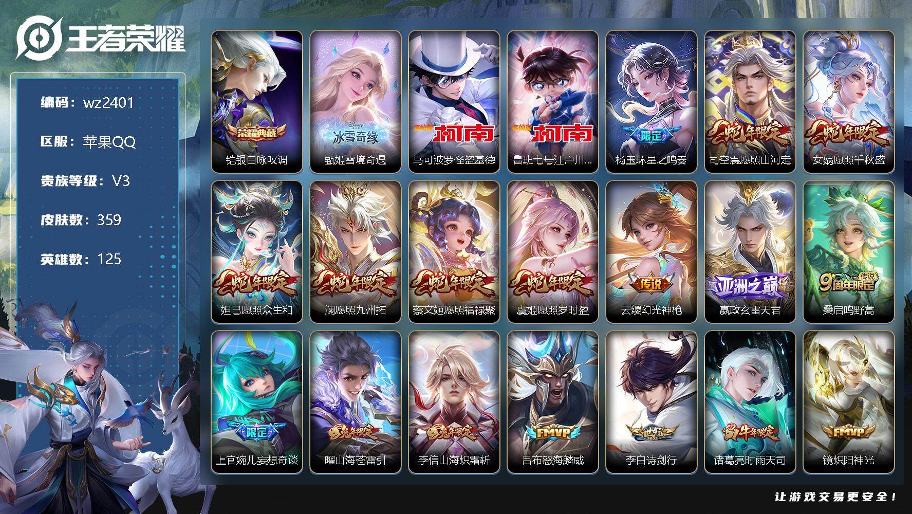 【云游堂】 【可二次实名】【wz2401】苹果Q-V3-至尊星耀I段位-125英雄-359皮肤-1典藏-0珍品无双-1无双-2珍品传说-29传说-96史诗 【英雄全皮】:达摩全皮,太乙真人全皮,蒙恬全皮,影全皮 【荣耀典藏】:铠银白咏叹调 【无双皮肤】:甄姬雪境奇遇 【珍品传说】:马可波罗怪盗基德,鲁班七号江户川柯南 【传说皮肤】:杨玉环星之鸣奏,司空震愿照山河定,女娲愿照千秋盛,妲己愿照众生和,澜愿照九州拓,蔡文姬愿照福禄聚,虞姬愿照岁时盈,云缨幻光神枪,嬴政玄雷天君,桑启鸣野蒿,上官婉儿妄想奇谈,曜山海苍雷引,李信山海炽霜斩,吕布怒海麟威,李白诗剑行,诸葛亮时雨天司,镜炽阳神光,虞姬启明星使,孙悟空零号赤焰,关羽武圣,曜云鹰飞将,刘备时之恋人,干将莫邪久胜战神,达摩黄金狮子座,百里玄策白虎志,后羿黄金射手座,杨戬永曜之星,貂蝉仲夏夜之梦,吕布天魔缭乱 【限定皮肤】:白起狰,姜子牙天穹之誓,狄仁杰阴阳师,虞姬凯尔特女王,赵云皇家上将,墨子神迹守卫,嬴政白昼王子,庄周蜃楼王,高渐离死亡摇滚,高渐离玩趣恶龙,钟无艳王者之锤,钟无艳超时空战士,孙膑妖精王,扁鹊炼金王,扁鹊奇幻香踪,白起夜都怪侠,芈月重明,芈月幻夜卜梦,吕布天魔缭乱,吕布猎兽之王,周瑜真爱至上,元歌云间偶戏,元歌无心,甄姬游园惊梦,甄姬落雪兰心,曹操烛龙,典韦穷奇,典韦蓝屏警告,马可波罗暗影游猎,马可波罗山海玄木吟,狄仁杰魔术师,狄仁杰万华元夜,达摩星际陆战队,达摩沙漠行僧,项羽海滩派对,老夫子醍醐杖,老夫子航海奇遇记,关羽冰锋战神,关羽武圣,貂蝉逐梦之音,程咬金演武夺筹,韩信傲雪梅枪,王昭君午后时光,兰陵王金庭之子,花木兰青春决赛季,花木兰默契交锋,亚瑟狮心王,亚瑟潮玩骑士王,孙悟空至尊宝,孙悟空大圣娶亲,孙悟空零号赤焰,牛魔御旌,后羿辉光之辰,李元芳云中旅人,虞姬启明星使,钟馗驱傩正仪,杨玉环遇见飞天,杨戬永曜之星,杨戬潮玩骑兵,女娲朔望之晖,雅典娜单词大作战,雅典娜黎明之约,蔡文姬繁星吟游,太乙真人饕餮,太乙真人华丽摇滚,鬼谷子原初探秘者,鬼谷子五谷丰年,诸葛亮时雨天司,黄忠火炮绅士,铠青龙志,苏烈千军破阵,百里玄策白虎志,百里玄策原初追逐者,梦奇顽趣,公孙离玉兔公主,沈梦溪大漠名商,明世隐疑决卦,明世隐吟游魔法,裴擒虎李小龙,裴擒虎擒涛扼浪,狂铁御狮,狂铁电玩高手,米莱狄御霄,米莱狄胡桃异想国,云中君纤云弄巧,云中君时之祈愿,李信山海炽霜斩,盾山御銮,猪八戒西部大镖客,上官婉儿梁祝,上官婉儿妄想奇谈,嫦娥暖冬兔眠,曜山海苍雷引,蒙犽狂想玩偶喵,鲁班大师探海日志,桑启海盐诗旅,暃星界游侠,艾琳女武神,张良古海寻踪,蒙犽百解令,蒙恬荣光圣徽,鬼谷子天穹祈灯,沈梦溪龙舞盛年 【年限皮肤】:百里玄策白虎志,铠青龙志,杨戬永曜之星,后羿辉光之辰,诸葛亮时雨天司,马超神威,关羽武圣,马可波罗山海玄木吟,李信山海炽霜斩,曜山海苍雷引 【赛季限定】:庄周蜃楼王,孙膑妖精王,扁鹊炼金王,白起狰,芈月重明,曹操烛龙,典韦穷奇,狄仁杰万华元夜,达摩沙漠行僧,老夫子醍醐杖,程咬金演武夺筹,兰陵王金庭之子,张良古海寻踪,亚瑟狮心王,牛魔御旌,李元芳云中旅人,虞姬凯尔特女王,钟馗驱傩正仪,雅典娜黎明之约,太乙真人饕餮,鬼谷子原初探秘者,苏烈千军破阵,百里玄策原初追逐者,梦奇顽趣,沈梦溪大漠名商,明世隐疑决卦,裴擒虎擒涛扼浪,狂铁御狮,米莱狄御霄,盾山御銮,鲁班大师探海日志,桑启海盐诗旅,鬼谷子天穹祈灯,蒙恬荣光圣徽,姜子牙天穹之誓 【战令限定】:墨子神迹守卫,嬴政白昼王子,钟无艳超时空战士,扁鹊奇幻香踪,白起夜都怪侠,芈月幻夜卜梦,吕布猎兽之王,元歌云间偶戏,甄姬落雪兰心,典韦蓝屏警告,马可波罗暗影游猎,达摩星际陆战队,老夫子航海奇遇记,王昭君午后时光,亚瑟潮玩骑士王,杨戬潮玩骑兵,女娲朔望之晖,雅典娜单词大作战,黄忠火炮绅士,明世隐吟游魔法,狂铁电玩高手,米莱狄胡桃异想国,猪八戒西部大镖客,嫦娥暖冬兔眠,蒙犽狂想玩偶喵,暃星界游侠 【史诗皮肤】:项羽苍穹之光,露娜紫霞仙子,阿轲暗夜猫娘,钟无艳王者之锤,赵云皇家上将,赵云未来纪元,貂蝉圣诞恋歌,甄姬冰雪圆舞曲,王昭君偶像歌手,狄仁杰魔术师,廉颇地狱岩魂,宫本武藏鬼剑武藏,孙尚香水果甜心,嬴政摇滚巨星,妲己魅力维加斯,妲己女仆咖啡,墨子龙骑士,墨子金属风暴,吕布圣诞狂欢,周瑜真爱至上,曹操幽灵船长,李白千年之狐,吕布末日机甲,张飞乱世虎臣,韩信白龙吟,关羽冰锋战神,貂蝉逐梦之音,孙悟空至尊宝,花木兰水晶猎龙者,刘邦德古拉伯爵,夏侯惇乘风破浪,小乔缤纷独角兽,兰陵王暗隐猎兽者,诸葛亮黄金分割率,甄姬游园惊梦,亚瑟心灵战警,安琪拉心灵骇客,后羿辉光之辰,花木兰青春决赛季,百里守约特工魅影,铠曙光守护者,蔡文姬舞动绿茵,刘禅天才门将,李元芳逐浪之夏,程咬金功夫厨神