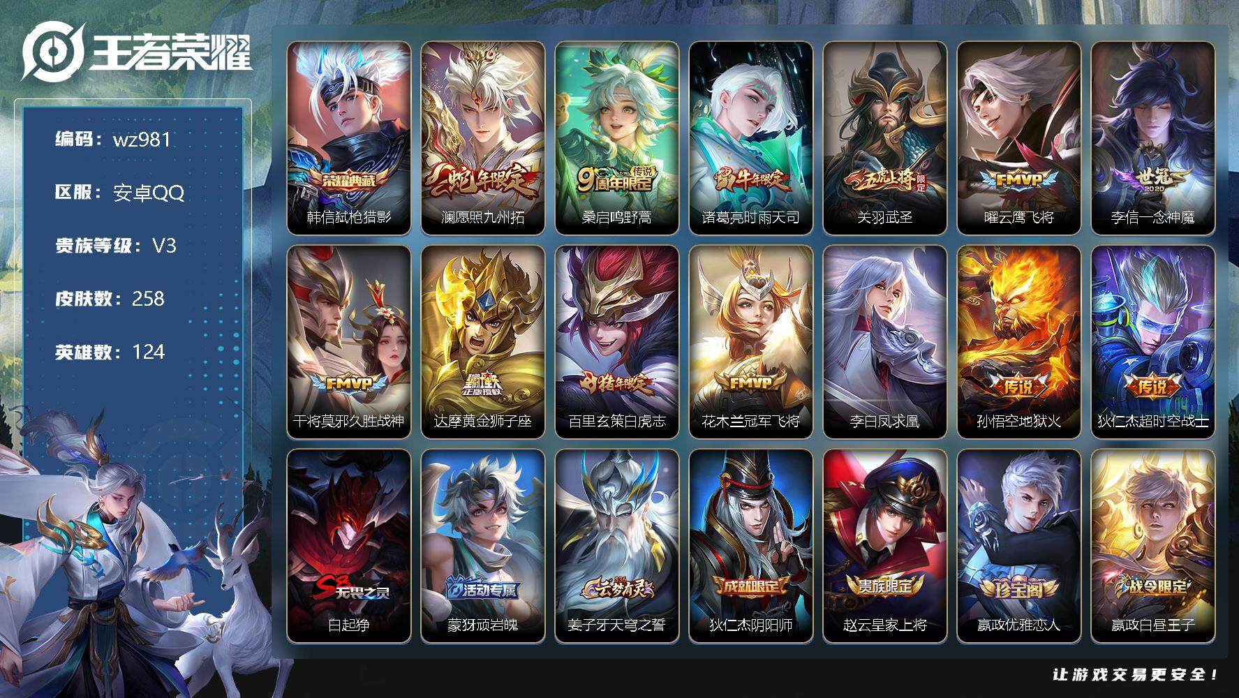 【云游堂】 【可二次实名】【wz981】【商品标题】:安卓Q-V3-最强王者段位-124英雄-258皮肤-1典藏-0珍品无双-0无双-0珍品传说-13传说-62史诗 【荣耀典藏】:韩信弑枪猎影 【传说皮肤】:澜愿照九州拓,桑启鸣野蒿,诸葛亮时雨天司,关羽武圣,曜云鹰飞将,李信一念神魔,干将莫邪久胜战神,达摩黄金狮子座,百里玄策白虎志,花木兰冠军飞将,李白凤求凰,孙悟空地狱火,狄仁杰超时空战士 【限定皮肤】:白起狰,蒙犽顽岩魄,姜子牙天穹之誓,狄仁杰阴阳师,赵云皇家上将,嬴政优雅恋人,嬴政白昼王子,鲁班七号狮舞东方,高渐离死亡摇滚,芈月重明,吕布猎兽之王,周瑜赤莲之焰,元歌云间偶戏,元歌无心,夏侯惇朔风刀,曹操烛龙,典韦穷奇,典韦蓝屏警告,马可波罗暗影游猎,狄仁杰魔术师,狄仁杰万华元夜,达摩沙漠行僧,项羽海滩派对,老夫子醍醐杖,关羽武圣,程咬金演武夺筹,兰陵王驯魔猎人,兰陵王金庭之子,亚瑟潮玩骑士王,孙悟空至尊宝,牛魔御旌,李元芳银河之约,李元芳云中旅人,钟馗神迹守卫,钟馗驱傩正仪,女娲朔望之晖,雅典娜黎明之约,太乙真人饕餮,太乙真人华丽摇滚,鬼谷子原初探秘者,鬼谷子五谷丰年,诸葛亮时雨天司,苏烈千军破阵,百里玄策白虎志,百里玄策原初追逐者,百里守约朱雀志,弈星混沌棋,梦奇顽趣,沈梦溪星空之诺,沈梦溪大漠名商,明世隐疑决卦,裴擒虎李小龙,裴擒虎擒涛扼浪,狂铁御狮,米莱狄御霄,云中君纤云弄巧,盾山御銮,猪八戒西部大镖客,上官婉儿梁祝,上官婉儿天狼绘梦者,鲁班大师探海日志,桑启海盐诗旅,张良古海寻踪,蒙恬荣光圣徽,鬼谷子天穹祈灯,姬小满妄想食味,沈梦溪龙舞盛年,刘邦剑破天穹,程咬金群星魔术团,周瑜熔金海岸 【年限皮肤】:百里玄策白虎志,百里守约朱雀志,李白凤求凰,诸葛亮时雨天司,马超神威,关羽武圣 【赛季限定】:白起狰,芈月重明,夏侯惇朔风刀,曹操烛龙,典韦穷奇,狄仁杰万华元夜,达摩沙漠行僧,老夫子醍醐杖,程咬金演武夺筹,兰陵王金庭之子,张良古海寻踪,牛魔御旌,李元芳云中旅人,钟馗驱傩正仪,雅典娜黎明之约,太乙真人饕餮,鬼谷子原初探秘者,苏烈千军破阵,百里玄策原初追逐者,弈星混沌棋,梦奇顽趣,沈梦溪大漠名商,明世隐疑决卦,裴擒虎擒涛扼浪,狂铁御狮,米莱狄御霄,盾山御銮,鲁班大师探海日志,桑启海盐诗旅,鬼谷子天穹祈灯,蒙恬荣光圣徽,刘邦剑破天穹,姜子牙天穹之誓 【战令限定】:嬴政白昼王子,鲁班七号狮舞东方,吕布猎兽之王,周瑜赤莲之焰,元歌云间偶戏,典韦蓝屏警告,马可波罗暗影游猎,兰陵王驯魔猎人,亚瑟潮玩骑士王,李元芳银河之约,钟馗神迹守卫,女娲朔望之晖,沈梦溪星空之诺,猪八戒西部大镖客 【史诗皮肤】:项羽苍穹之光,赵云皇家上将,赵云未来纪元,貂蝉圣诞恋歌,甄姬冰雪圆舞曲,狄仁杰魔术师,廉颇地狱岩魂,宫本武藏鬼剑武藏,孙尚香水果甜心,嬴政优雅恋人,妲己女仆咖啡,墨子龙骑士,吕布圣诞狂欢,曹操幽灵船长,李白千年之狐,张飞乱世虎臣,孙悟空至尊宝,花木兰水晶猎龙者,刘邦德古拉伯爵,夏侯惇乘风破浪,小乔缤纷独角兽,兰陵王暗隐猎兽者,诸葛亮黄金分割率,雅典娜冰冠公主,百里守约特工魅影,铠曙光守护者,李元芳逐浪之夏,程咬金功夫厨神,白起星夜王子,阿轲节奏热浪,嬴政白昼王子,孙策猫狗日记,百里守约朱雀志,典韦蓝屏警告,伽罗箭羽风息,鲁班七号狮舞东方,狄仁杰鹰眼统帅,兰陵王驯魔猎人,上官婉儿梁祝,李元芳银河之约,娜可露露晚萤,橘右京修罗,瑶遇见神鹿,马超神威,上官婉儿天狼绘梦者,马可波罗暗影游猎,百里玄策原初追逐者,裴擒虎李小龙,云中君纤云弄巧,元歌云间偶戏,雅典娜黎明之约,鬼谷子五谷丰年,元歌无心,梦奇顽趣,蒙恬荣光圣徽,姬小满妄想食味,蒙犽顽岩魄,亚连破空之剑,牛魔星界战将,弈星万物之道,阿轲化蝶舞,黄忠百相守梦 【其他皮肤】:项羽海滩派对,韩信教廷特使,韩信街头霸王,露娜哥特玫瑰,阿轲爱心护理,达摩大发明家,赵云白执事,赵云忍炎影,芈月红桃皇后,白起白色死神,牛魔西部大镖客,武则天东方不败,扁鹊化身博士,扁鹊救世之瞳,宫本武藏未来纪元,安琪拉玩偶对对碰,孙膑天使之翼,妲己少女阿狸,典韦黄金武士,达摩拳王,花木兰兔女郎,张飞五福同心,甄姬花好人间,宫本武藏万象初新,后羿阿尔法小队,狄仁杰阴阳师,高渐离死亡摇滚,刘备汉昭烈帝,关羽龙腾万里,墨子进击墨子号,白起狰,钟无艳海滩丽影,太乙真人饕餮,宫本武藏霸王丸,曹操烛龙,王昭君幻想奇妙夜,芈月重明,狂铁命运角斗场,老夫子功夫老勺,孙尚香沉稳之力,典韦穷奇,诸葛亮掌控之力,李白敏锐之力,鬼谷子幻乐之宴,狂铁御狮,太乙真人华丽摇滚,苏烈坚韧之力,大乔守护之力,米莱狄御霄,吕布猎兽之王,明世隐虹云星官,张良幽兰居士,牛魔御旌,女娲朔望之晖,小乔丁香结,吕布野性能量,钟馗神迹守卫,盾山御銮,沈梦溪鲨炮海盗猫,姜子牙炽热元素使,夏侯惇