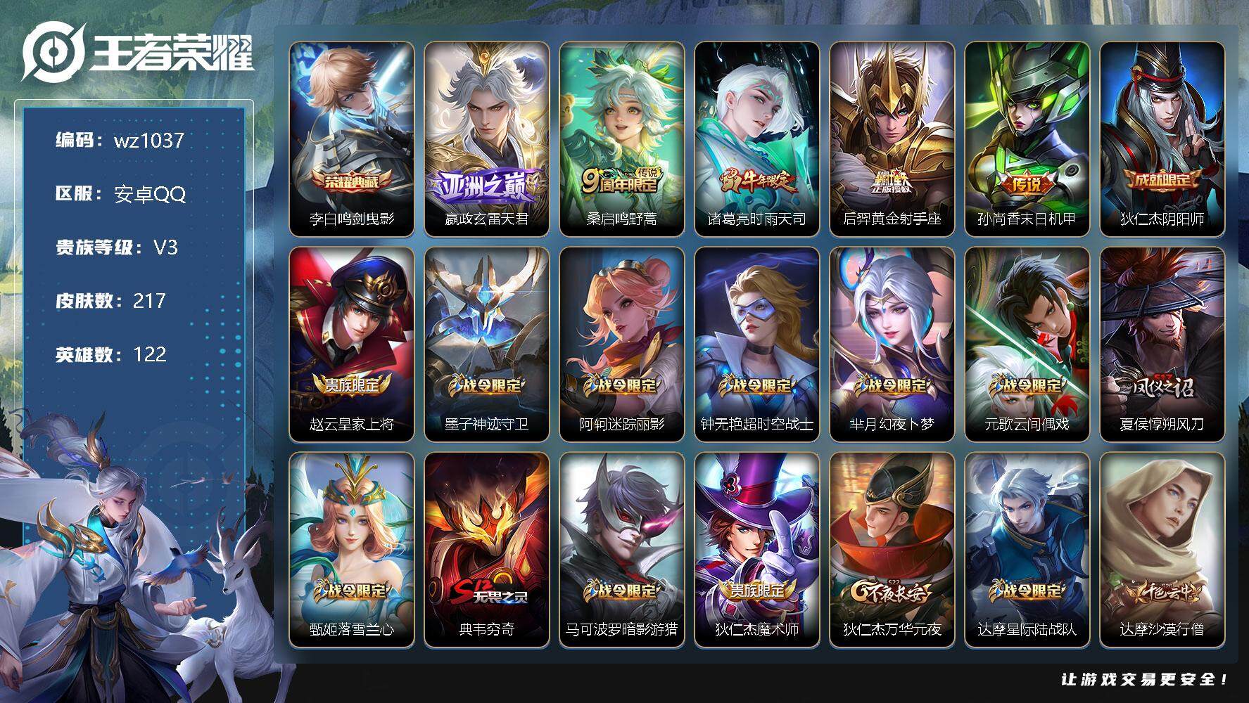 【云游堂】 【可二次实名】【wz1037】【商品标题】:安卓Q-V3-尊贵铂金III段位-122英雄-217皮肤-1典藏-0珍品无双-0无双-0珍品传说-5传说-45史诗 【荣耀典藏】:李白鸣剑曳影 【传说皮肤】:嬴政玄雷天君,桑启鸣野蒿,诸葛亮时雨天司,后羿黄金射手座,孙尚香末日机甲 【限定皮肤】:狄仁杰阴阳师,赵云皇家上将,墨子神迹守卫,阿轲迷踪丽影,钟无艳超时空战士,芈月幻夜卜梦,元歌云间偶戏,夏侯惇朔风刀,甄姬落雪兰心,典韦穷奇,马可波罗暗影游猎,狄仁杰魔术师,狄仁杰万华元夜,达摩星际陆战队,达摩沙漠行僧,项羽海滩派对,老夫子醍醐杖,老夫子航海奇遇记,程咬金演武夺筹,刘邦夺宝奇兵,兰陵王金庭之子,亚瑟潮玩骑士王,孙悟空至尊宝,李元芳云中旅人,钟馗驱傩正仪,干将莫邪胡桃夹子,鬼谷子原初探秘者,鬼谷子五谷丰年,诸葛亮时雨天司,黄忠火炮绅士,苏烈千军破阵,弈星混沌棋,沈梦溪星空之诺,沈梦溪大漠名商,明世隐疑决卦,裴擒虎擒涛扼浪,狂铁御狮,米莱狄御霄,米莱狄胡桃异想国,云中君纤云弄巧,猪八戒西部大镖客,鲁班大师探海日志,桑启海盐诗旅,张良古海寻踪,鬼谷子天穹祈灯,刘邦剑破天穹 【年限皮肤】:诸葛亮时雨天司 【赛季限定】:夏侯惇朔风刀,典韦穷奇,狄仁杰万华元夜,达摩沙漠行僧,老夫子醍醐杖,程咬金演武夺筹,兰陵王金庭之子,张良古海寻踪,李元芳云中旅人,钟馗驱傩正仪,鬼谷子原初探秘者,苏烈千军破阵,弈星混沌棋,沈梦溪大漠名商,明世隐疑决卦,裴擒虎擒涛扼浪,狂铁御狮,米莱狄御霄,鲁班大师探海日志,桑启海盐诗旅,鬼谷子天穹祈灯,刘邦剑破天穹 【战令限定】:墨子神迹守卫,阿轲迷踪丽影,钟无艳超时空战士,芈月幻夜卜梦,元歌云间偶戏,甄姬落雪兰心,马可波罗暗影游猎,达摩星际陆战队,老夫子航海奇遇记,刘邦夺宝奇兵,亚瑟潮玩骑士王,黄忠火炮绅士,沈梦溪星空之诺,米莱狄胡桃异想国,猪八戒西部大镖客 【史诗皮肤】:露娜紫霞仙子,赵云皇家上将,赵云未来纪元,甄姬冰雪圆舞曲,王昭君偶像歌手,狄仁杰魔术师,廉颇地狱岩魂,宫本武藏鬼剑武藏,孙尚香水果甜心,嬴政摇滚巨星,妲己魅力维加斯,墨子龙骑士,墨子金属风暴,吕布圣诞狂欢,吕布末日机甲,韩信白龙吟,孙悟空至尊宝,花木兰水晶猎龙者,刘邦德古拉伯爵,小乔缤纷独角兽,兰陵王暗隐猎兽者,雅典娜冰冠公主,安琪拉心灵骇客,百里守约特工魅影,铠曙光守护者,蔡文姬舞动绿茵,程咬金功夫厨神,阿轲节奏热浪,孙策猫狗日记,狄仁杰鹰眼统帅,公孙离无限星赏官,娜可露露晚萤,阿轲迷踪丽影,橘右京修罗,马可波罗暗影游猎,云中君纤云弄巧,元歌云间偶戏,米莱狄胡桃异想国,老夫子航海奇遇记,杨戬天秀启明,黄忠火炮绅士,钟无艳超时空战士,鬼谷子五谷丰年,百里守约百相守梦,阿轲化蝶舞 【其他皮肤】:项羽海滩派对,韩信教廷特使,韩信街头霸王,露娜哥特玫瑰,阿轲爱心护理,达摩大发明家,赵云忍炎影,芈月红桃皇后,程咬金爱与正义,白起白色死神,牛魔西部大镖客,扁鹊化身博士,宫本武藏未来纪元,安琪拉玩偶对对碰,孙膑天使之翼,姜子牙时尚教父,妲己少女阿狸,典韦黄金武士,亚瑟死亡骑士,达摩拳王,花木兰兔女郎,张飞五福同心,甄姬花好人间,刘备万事如意,宫本武藏万象初新,后羿阿尔法小队,狄仁杰阴阳师,刘备纽约教父,刘备汉昭烈帝,关羽龙腾万里,墨子进击墨子号,钟无艳海滩丽影,宫本武藏霸王丸,王昭君幻想奇妙夜,狂铁命运角斗场,老夫子功夫老勺,孙尚香沉稳之力,典韦穷奇,诸葛亮掌控之力,李白敏锐之力,鬼谷子幻乐之宴,狂铁御狮,安琪拉如懿,苏烈坚韧之力,大乔守护之力,米莱狄御霄,明世隐虹云星官,庄周奇妙博物学,小乔丁香结,吕布野性能量,沈梦溪鲨炮海盗猫,夏侯惇朔风刀,沈梦溪星空之诺,弈星混沌棋,哪吒次元突破,明世隐疑决卦,刘邦夺宝奇兵,老夫子醍醐杖,猪八戒西部大镖客,鬼谷子原初探秘者,狄仁杰万华元夜,亚瑟潮玩骑士王,刘禅秘密基地,杨戬次元傲视,达摩星际陆战队,程咬金演武夺筹,张良缤纷绘卷,钟馗驱傩正仪,墨子神迹守卫,鲁班大师乓乓大师,苏烈千军破阵,干将莫邪胡桃夹子,达摩沙漠行僧,芈月幻夜卜梦,程咬金无双福将,兰陵王金庭之子,刘禅唤灵魔甲,沈梦溪大漠名商,蒙恬蔚蓝守将,甄姬落雪兰心,李元芳云中旅人,桑启海盐诗旅,猪八戒潮玩探月行,裴擒虎擒涛扼浪,太乙真人劲辣红锅,鲁班大师探海日志,张良古海寻踪,鬼谷子天穹祈灯,廉颇功夫炙烤,刘邦剑破天穹,东皇太一噬灭天穹,老夫子百相守梦,苍苍林狼骑,太乙真人谧流熔炉,典韦铁骨偃魂,西施雪境奇遇,姜子牙星梦巡礼,戈娅玫蓝誓约,刘备浪漫序章,鲁班七号福禄兄弟,鲁班七号木偶奇遇记,高渐离金属狂潮,项羽帝国元帅,露娜绯红之刃,钟无艳生化警戒,貂蝉异域舞娘,花木兰剑舞者,老夫子潮流仙人,王昭君精灵公主,狄仁杰锦衣卫,曹操死神来了,曹操超能战警,张良一千零一夜,小乔万圣前夜,