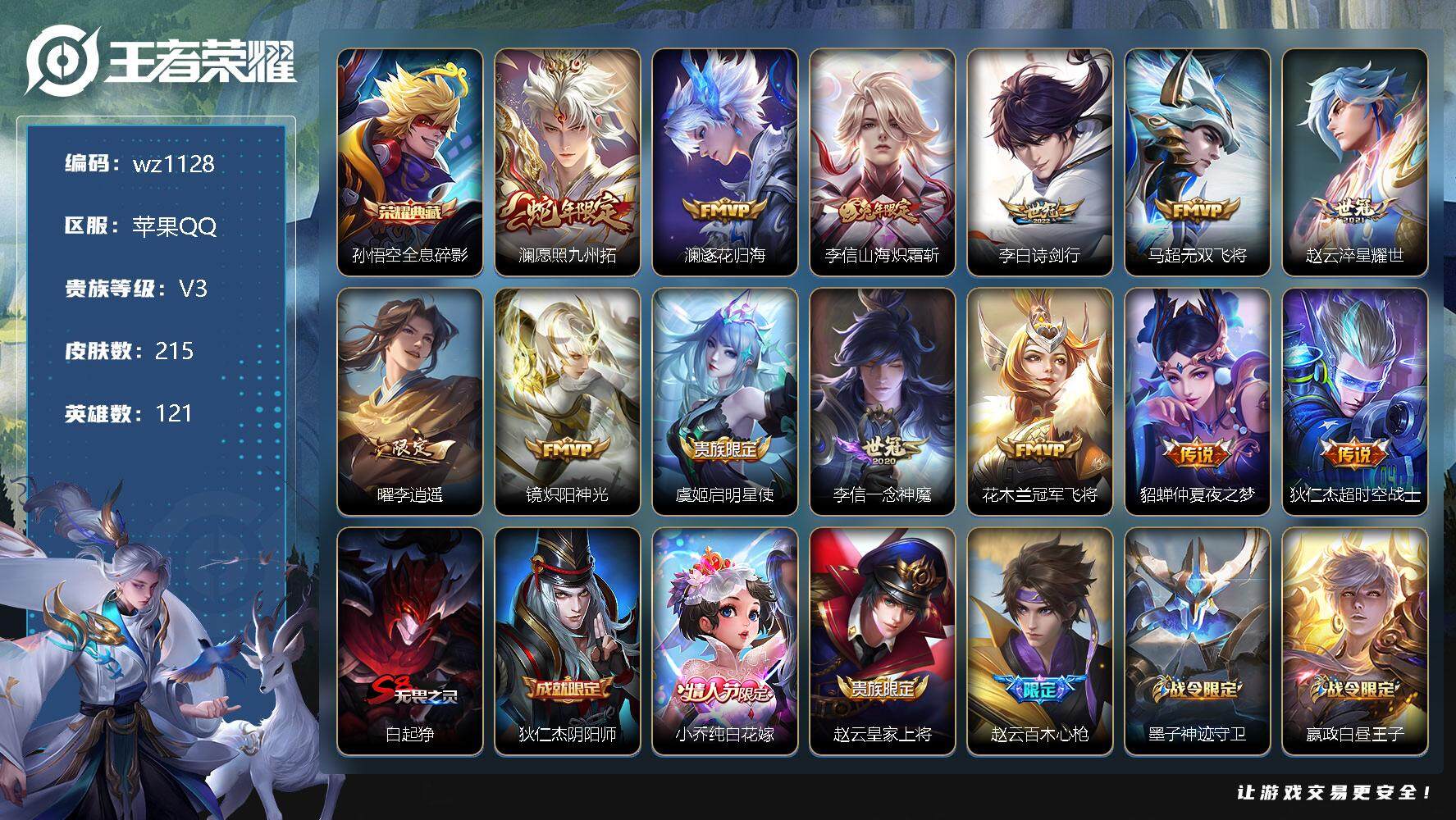 【云游堂】 【可二次实名】【wz1128】【商品标题】:苹果Q-V3-荣耀黄金I段位-121英雄-215皮肤-1典藏-0珍品无双-0无双-0珍品传说-13传说-68史诗 【荣耀典藏】:孙悟空全息碎影 【传说皮肤】:澜愿照九州拓,澜逐花归海,李信山海炽霜斩,李白诗剑行,马超无双飞将,赵云淬星耀世,曜李逍遥 ,镜炽阳神光,虞姬启明星使,李信一念神魔,花木兰冠军飞将,貂蝉仲夏夜之梦,狄仁杰超时空战士 【限定皮肤】:白起狰,狄仁杰阴阳师,小乔纯白花嫁,赵云皇家上将,赵云百木心枪,墨子神迹守卫,嬴政白昼王子,孙尚香蔷薇恋人,鲁班七号狮舞东方,高渐离玩趣恶龙,芈月幻夜卜梦,吕布猎兽之王,周瑜真爱至上,周瑜赤莲之焰,元歌云间偶戏,元歌无心,夏侯惇朔风刀,曹操烛龙,曹操天狼征服者,典韦穷奇,典韦蓝屏警告,狄仁杰魔术师,狄仁杰万华元夜,达摩星际陆战队,达摩沙漠行僧,项羽海滩派对,老夫子醍醐杖,老夫子航海奇遇记,关羽冰锋战神,程咬金演武夺筹,韩信飞衡,韩信傲雪梅枪,王昭君午后时光,兰陵王驯魔猎人,兰陵王金庭之子,花木兰青春决赛季,牛魔御旌,李元芳云中旅人,虞姬启明星使,钟馗神迹守卫,钟馗驱傩正仪,杨玉环遇见飞天,女娲朔望之晖,雅典娜单词大作战,雅典娜黎明之约,鬼谷子原初探秘者,黄忠火炮绅士,苏烈千军破阵,百里玄策原初追逐者,弈星混沌棋,公孙离玉兔公主,沈梦溪大漠名商,明世隐疑决卦,裴擒虎天狼狩猎者,裴擒虎李小龙,狂铁御狮,狂铁电玩高手,米莱狄御霄,米莱狄胡桃异想国,云中君纤云弄巧,李信山海炽霜斩,盾山御銮,上官婉儿梁祝,嫦娥暖冬兔眠,曜李逍遥 ,蒙犽狂想玩偶喵,桑启海盐诗旅 【年限皮肤】:韩信飞衡,马超神威,李信山海炽霜斩 【赛季限定】:白起狰,夏侯惇朔风刀,曹操烛龙,典韦穷奇,狄仁杰万华元夜,达摩沙漠行僧,老夫子醍醐杖,程咬金演武夺筹,兰陵王金庭之子,牛魔御旌,李元芳云中旅人,钟馗驱傩正仪,雅典娜黎明之约,鬼谷子原初探秘者,苏烈千军破阵,百里玄策原初追逐者,弈星混沌棋,沈梦溪大漠名商,明世隐疑决卦,狂铁御狮,米莱狄御霄,盾山御銮,桑启海盐诗旅 【战令限定】:墨子神迹守卫,嬴政白昼王子,鲁班七号狮舞东方,芈月幻夜卜梦,吕布猎兽之王,周瑜赤莲之焰,元歌云间偶戏,典韦蓝屏警告,达摩星际陆战队,老夫子航海奇遇记,王昭君午后时光,兰陵王驯魔猎人,钟馗神迹守卫,女娲朔望之晖,雅典娜单词大作战,黄忠火炮绅士,狂铁电玩高手,米莱狄胡桃异想国,嫦娥暖冬兔眠,蒙犽狂想玩偶喵 【史诗皮肤】:项羽苍穹之光,露娜紫霞仙子,赵云皇家上将,貂蝉圣诞恋歌,王昭君偶像歌手,狄仁杰魔术师,宫本武藏鬼剑武藏,孙尚香蔷薇恋人,孙尚香水果甜心,妲己魅力维加斯,妲己女仆咖啡,墨子龙骑士,吕布圣诞狂欢,小乔纯白花嫁,周瑜真爱至上,曹操幽灵船长,李白千年之狐,关羽冰锋战神,夏侯惇乘风破浪,小乔缤纷独角兽,兰陵王暗隐猎兽者,诸葛亮黄金分割率,亚瑟心灵战警,雅典娜冰冠公主,花木兰青春决赛季,铠曙光守护者,李元芳逐浪之夏,白起星夜王子,阿轲节奏热浪,杨玉环遇见飞天,嬴政白昼王子,孙策猫狗日记,典韦蓝屏警告,裴擒虎天狼狩猎者,鲁班七号狮舞东方,狄仁杰鹰眼统帅,公孙离无限星赏官,兰陵王驯魔猎人,上官婉儿梁祝,曹操天狼征服者,娜可露露晚萤,韩信飞衡,不知火舞魅语,橘右京修罗,马超神威,蒙犽狂想玩偶喵,百里玄策原初追逐者,裴擒虎李小龙,云中君纤云弄巧,元歌云间偶戏,米莱狄胡桃异想国,老夫子航海奇遇记,司马懿暗渊魔法,黄忠火炮绅士,雅典娜黎明之约,韩信傲雪梅枪,夏洛特永昼,赵云百木心枪,公孙离玉兔公主,澜赏金猎手,狂铁电玩高手,元歌无心,马可波罗星界特工,孙膑茶境仙,苍狼魂孤将,狄仁杰绮世丹青,芈月瑰影绮梦,阿轲化蝶舞 【其他皮肤】:项羽海滩派对,韩信教廷特使,韩信街头霸王,露娜哥特玫瑰,阿轲爱心护理,达摩大发明家,赵云忍炎影,芈月红桃皇后,白起白色死神,扁鹊化身博士,安琪拉玩偶对对碰,妲己少女阿狸,典韦黄金武士,亚瑟死亡骑士,达摩拳王,花木兰兔女郎,张飞五福同心,甄姬花好人间,宫本武藏万象初新,狄仁杰阴阳师,刘备纽约教父,关羽龙腾万里,白起狰,钟无艳海滩丽影,宫本武藏霸王丸,曹操烛龙,老夫子功夫老勺,典韦穷奇,诸葛亮掌控之力,鬼谷子幻乐之宴,狂铁御狮,苏烈坚韧之力,大乔守护之力,项羽科学大爆炸,米莱狄御霄,吕布猎兽之王,明世隐虹云星官,牛魔御旌,女娲朔望之晖,小乔丁香结,吕布野性能量,钟馗神迹守卫,盾山御銮,孙膑归虚梦演,高渐离玩趣恶龙,沈梦溪鲨炮海盗猫,姜子牙炽热元素使,夏侯惇朔风刀,周瑜赤莲之焰,弈星混沌棋,哪吒次元突破,鲁班七号黑桃队长,明世隐疑决卦,盾山圆桌骑士,老夫子醍醐杖,鬼谷子原初探秘者,雅典娜单词大作战,狄仁杰万华元夜,刘禅秘密基地,露娜瓷语鉴心,达摩星际陆战队,程咬金演武夺筹,张良缤纷绘卷,盘古重装意志,钟馗