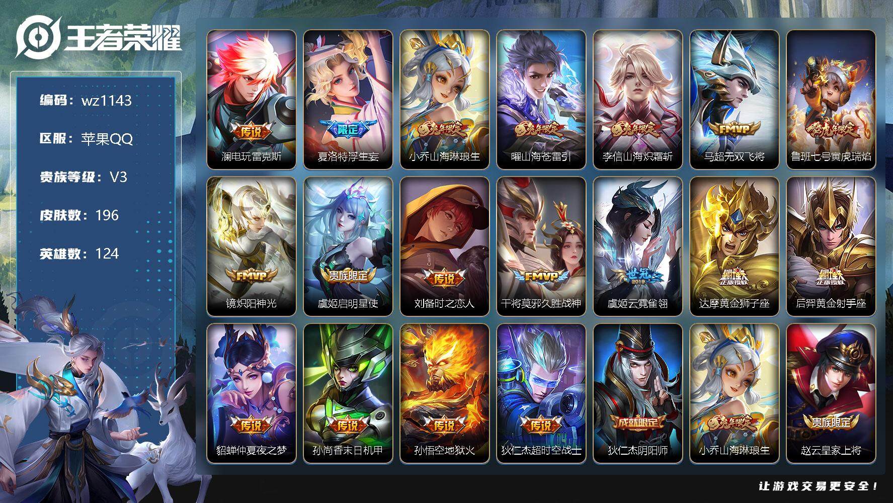 【云游堂】 【可二次实名】【wz1143】【商品标题】:苹果Q-V3-至尊星耀V段位-124英雄-196皮肤-0典藏-0珍品无双-0无双-0珍品传说-18传说-48史诗 【传说皮肤】:澜电玩雷克斯,夏洛特浮生妄,小乔山海琳琅生,曜山海苍雷引,李信山海炽霜斩,马超无双飞将,鲁班七号寅虎瑞焰,镜炽阳神光,虞姬启明星使,刘备时之恋人,干将莫邪久胜战神,虞姬云霓雀翎,达摩黄金狮子座,后羿黄金射手座,貂蝉仲夏夜之梦,孙尚香末日机甲,孙悟空地狱火,狄仁杰超时空战士 【限定皮肤】:狄仁杰阴阳师,小乔山海琳琅生,赵云皇家上将,嬴政优雅恋人,鲁班七号狮舞东方,鲁班七号寅虎瑞焰,阿轲迷踪丽影,周瑜赤莲之焰,元歌云间偶戏,元歌无心,夏侯惇朔风刀,马可波罗暗影游猎,马可波罗山海玄木吟,狄仁杰魔术师,狄仁杰万华元夜,达摩沙漠行僧,项羽海滩派对,老夫子醍醐杖,程咬金演武夺筹,刘邦夺宝奇兵,兰陵王驯魔猎人,兰陵王金庭之子,亚瑟潮玩骑士王,牛魔御旌,李元芳云中旅人,虞姬启明星使,钟馗神迹守卫,钟馗驱傩正仪,干将莫邪冰霜恋舞曲,干将莫邪胡桃夹子,雅典娜单词大作战,鬼谷子原初探秘者,鬼谷子五谷丰年,苏烈千军破阵,百里玄策原初追逐者,弈星混沌棋,梦奇顽趣,沈梦溪大漠名商,沈梦溪匿光破解者,明世隐疑决卦,裴擒虎李小龙,裴擒虎擒涛扼浪,瑶山海碧波行,李信山海炽霜斩,盾山御銮,猪八戒西部大镖客,上官婉儿梁祝,嫦娥暖冬兔眠,曜山海苍雷引,蒙犽狂想玩偶喵,鲁班大师探海日志,桑启海盐诗旅,夏洛特浮生妄,暃星界游侠,张良古海寻踪,蒙恬荣光圣徽,鬼谷子天穹祈灯,沈梦溪龙舞盛年,周瑜熔金海岸 【年限皮肤】:鲁班七号寅虎瑞焰,瑶山海碧波行,马可波罗山海玄木吟,李信山海炽霜斩,小乔山海琳琅生,曜山海苍雷引 【赛季限定】:夏侯惇朔风刀,狄仁杰万华元夜,达摩沙漠行僧,老夫子醍醐杖,程咬金演武夺筹,兰陵王金庭之子,张良古海寻踪,牛魔御旌,李元芳云中旅人,钟馗驱傩正仪,鬼谷子原初探秘者,苏烈千军破阵,百里玄策原初追逐者,弈星混沌棋,梦奇顽趣,沈梦溪大漠名商,明世隐疑决卦,裴擒虎擒涛扼浪,盾山御銮,鲁班大师探海日志,桑启海盐诗旅,鬼谷子天穹祈灯,蒙恬荣光圣徽 【战令限定】:鲁班七号狮舞东方,阿轲迷踪丽影,周瑜赤莲之焰,元歌云间偶戏,马可波罗暗影游猎,刘邦夺宝奇兵,兰陵王驯魔猎人,亚瑟潮玩骑士王,钟馗神迹守卫,雅典娜单词大作战,猪八戒西部大镖客,嫦娥暖冬兔眠,蒙犽狂想玩偶喵,暃星界游侠 【史诗皮肤】:鲁班七号电玩小子,赵云皇家上将,甄姬冰雪圆舞曲,王昭君偶像歌手,狄仁杰魔术师,宫本武藏鬼剑武藏,孙尚香水果甜心,嬴政优雅恋人,嬴政暗夜贵公子,嬴政摇滚巨星,妲己魅力维加斯,墨子金属风暴,吕布圣诞狂欢,李白千年之狐,张飞乱世虎臣,花木兰水晶猎龙者,兰陵王暗隐猎兽者,雅典娜冰冠公主,安琪拉心灵骇客,百里守约特工魅影,程咬金功夫厨神,阿轲节奏热浪,干将莫邪冰霜恋舞曲,鲁班七号狮舞东方,狄仁杰鹰眼统帅,公孙离无限星赏官,兰陵王驯魔猎人,上官婉儿梁祝,不知火舞魅语,阿轲迷踪丽影,橘右京修罗,马可波罗暗影游猎,蒙犽狂想玩偶喵,百里玄策原初追逐者,裴擒虎李小龙,元歌云间偶戏,澜赏金猎手,鬼谷子五谷丰年,元歌无心,梦奇顽趣,暃星界游侠,马可波罗山海玄木吟,瑶山海碧波行,镜玫瑰异探,沈梦溪匿光破解者,蒙恬荣光圣徽,后羿石田雨龙,黄忠百相守梦 【其他皮肤】:项羽海滩派对,韩信教廷特使,韩信街头霸王,达摩大发明家,赵云忍炎影,白起白色死神,牛魔西部大镖客,扁鹊化身博士,扁鹊救世之瞳,安琪拉玩偶对对碰,孙膑天使之翼,妲己少女阿狸,典韦黄金武士,亚瑟死亡骑士,达摩拳王,花木兰兔女郎,甄姬花好人间,刘备万事如意,宫本武藏万象初新,后羿阿尔法小队,狄仁杰阴阳师,刘备汉昭烈帝,关羽龙腾万里,王昭君幻想奇妙夜,狂铁命运角斗场,老夫子功夫老勺,孙尚香沉稳之力,诸葛亮掌控之力,李白敏锐之力,鬼谷子幻乐之宴,苏烈坚韧之力,大乔守护之力,牛魔御旌,小乔丁香结,吕布野性能量,钟馗神迹守卫,盾山御銮,孙膑归虚梦演,沈梦溪鲨炮海盗猫,姜子牙炽热元素使,夏侯惇朔风刀,周瑜赤莲之焰,弈星混沌棋,哪吒次元突破,明世隐疑决卦,刘邦夺宝奇兵,盾山圆桌骑士,老夫子醍醐杖,猪八戒西部大镖客,廉颇无尽征程,鬼谷子原初探秘者,雅典娜单词大作战,狄仁杰万华元夜,亚瑟潮玩骑士王,刘禅秘密基地,程咬金演武夺筹,张良缤纷绘卷,钟馗驱傩正仪,鲁班大师乓乓大师,苏烈千军破阵,干将莫邪胡桃夹子,达摩沙漠行僧,程咬金无双福将,兰陵王金庭之子,刘禅唤灵魔甲,沈梦溪大漠名商,蒙恬蔚蓝守将,李元芳云中旅人,戈娅危途狂花,桑启海盐诗旅,嫦娥暖冬兔眠,猪八戒潮玩探月行,牛魔牛运亨通,裴擒虎擒涛扼浪,太乙真人劲辣红锅,鲁班大师探海日志,张良古海寻踪,后羿完美运算,鬼谷子天穹祈灯,沈梦溪龙舞盛年,周瑜熔金海岸,东皇太