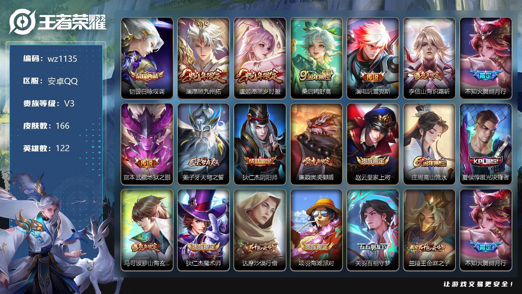 【云游堂】 【可二次实名】【wz1135】【商品标题】:安卓Q-V3-永恒钻石III段位-122英雄-166皮肤-1典藏-0珍品无双-0无双-0珍品传说-7传说-49史诗 【荣耀典藏】:铠银白咏叹调 【传说皮肤】:澜愿照九州拓,虞姬愿照岁时盈,桑启鸣野蒿,澜电玩雷克斯,李信山海炽霜斩,不知火舞绯月行,宫本武藏地狱之眼 【限定皮肤】:姜子牙天穹之誓,狄仁杰阴阳师,廉颇寅虎御盾,赵云皇家上将,庄周高山流水,夏侯惇匿光决锋者,马可波罗山海玄木吟,狄仁杰魔术师,达摩沙漠行僧,项羽海滩派对,关羽百相守梦,兰陵王金庭之子,不知火舞绯月行,李元芳云中旅人,杨玉环寅虎心曲,干将莫邪胡桃夹子,鬼谷子五谷丰年,苏烈千军破阵,梦奇顽趣,沈梦溪大漠名商,裴擒虎擒涛扼浪,李信山海炽霜斩,猪八戒猪悟能,上官婉儿梁祝,嫦娥暖冬兔眠,西施玲珑珍味,鲁班大师探海日志,桑启海盐诗旅,暃星界游侠,戈娅驭风魔法,赵怀真鹤归松栖,阿古朵江河有灵,张良古海寻踪,蒙犽百解令,蒙恬荣光圣徽,鬼谷子天穹祈灯,沈梦溪龙舞盛年,刘邦剑破天穹,程咬金群星魔术团,周瑜熔金海岸 【年限皮肤】:杨玉环寅虎心曲,廉颇寅虎御盾,马超神威,马可波罗山海玄木吟,李信山海炽霜斩 【赛季限定】:达摩沙漠行僧,兰陵王金庭之子,张良古海寻踪,李元芳云中旅人,苏烈千军破阵,梦奇顽趣,沈梦溪大漠名商,裴擒虎擒涛扼浪,鲁班大师探海日志,桑启海盐诗旅,鬼谷子天穹祈灯,蒙恬荣光圣徽,刘邦剑破天穹,姜子牙天穹之誓 【战令限定】:嫦娥暖冬兔眠,西施玲珑珍味,暃星界游侠,戈娅驭风魔法 【史诗皮肤】:露娜紫霞仙子,赵云皇家上将,甄姬冰雪圆舞曲,狄仁杰魔术师,宫本武藏鬼剑武藏,孙尚香水果甜心,嬴政摇滚巨星,妲己魅力维加斯,墨子金属风暴,曹操幽灵船长,吕布末日机甲,花木兰水晶猎龙者,刘邦德古拉伯爵,夏侯惇乘风破浪,雅典娜冰冠公主,百里守约特工魅影,铠曙光守护者,李元芳逐浪之夏,程咬金功夫厨神,白起星夜王子,伽罗箭羽风息,狄仁杰鹰眼统帅,上官婉儿梁祝,娜可露露晚萤,不知火舞魅语,马超神威,猪八戒猪悟能,庄周高山流水,杨玉环寅虎心曲,廉颇寅虎御盾,夏侯惇匿光决锋者,弈星滕王阁序,鬼谷子五谷丰年,梦奇顽趣,暃星界游侠,马可波罗山海玄木吟,关羽百相守梦,刘禅电玩爆裂旋风,戈娅驭风魔法,赵怀真鹤归松栖,阿古朵江河有灵,蒙犽百解令,蒙恬荣光圣徽,黄忠怒海争锋,弈星炽弈燎原,牛魔星界战将,弈星万物之道,赵怀真器灵浮梦炉,狂铁龙之律动 【其他皮肤】:项羽海滩派对,韩信街头霸王,达摩大发明家,赵云白执事,赵云忍炎影,白起白色死神,武则天东方不败,扁鹊化身博士,扁鹊救世之瞳,安琪拉玩偶对对碰,姜子牙时尚教父,典韦黄金武士,亚瑟死亡骑士,达摩拳王,张飞五福同心,刘备万事如意,狄仁杰阴阳师,刘备汉昭烈帝,老夫子功夫老勺,孙尚香沉稳之力,李白敏锐之力,明世隐虹云星官,小乔丁香结,孙膑归虚梦演,沈梦溪鲨炮海盗猫,姜子牙炽热元素使,哪吒次元突破,盾山圆桌骑士,狂铁特工战影,鲁班大师乓乓大师,苏烈千军破阵,干将莫邪胡桃夹子,达摩沙漠行僧,刘邦虎啸剑宗,兰陵王金庭之子,刘禅唤灵魔甲,沈梦溪大漠名商,蒙恬蔚蓝守将,李元芳云中旅人,桑启海盐诗旅,嫦娥暖冬兔眠,白起乐园追猎者,赵怀真太极少年,裴擒虎擒涛扼浪,太乙真人劲辣红锅,莱西奥西部游侠,鲁班大师探海日志,西施玲珑珍味,姬小满零食大作战,李元芳妄想特派,张良古海寻踪,钟无艳聚星闪耀,海月王牌新星,亚连破局者,后羿完美运算,鬼谷子天穹祈灯,海诺时空谍影,朵莉亚金色潮汐,沈梦溪龙舞盛年,钟无艳春野之旅,刘邦剑破天穹,程咬金群星魔术团,大司命暗都幽影,姜子牙天穹之誓,周瑜熔金海岸,盘古敬我三分,东皇太一噬灭天穹,苍苍林狼骑,太乙真人谧流熔炉,典韦铁骨偃魂,影魅影绮裳,西施雪境奇遇,姜子牙星梦巡礼,少司缘灵卦秘语,明世隐景韶洛都,钟馗虚灵犬护,张良灵野札记,阿古朵布丁狗之约,露娜命运加冕,白起死霸装,鲁班七号木偶奇遇记,貂蝉异域舞娘,老夫子潮流仙人,王昭君精灵公主,张良一千零一夜,小乔万圣前夜,孙悟空西部大镖客,周瑜海军大将,钟馗地府判官,关羽天启骑士,夏侯惇战争骑士,马可波罗激情绿茵,苍维京掠夺者,大乔伊势巫女,东皇太一东海龙王,铠龙域领主,百里守约绝影神枪,百里玄策威尼斯狂欢,梦奇美梦成真,女娲尼罗河女神,公孙离花间舞,弈星踏雪寻梅,上官婉儿修竹墨客,西施归虚梦演,蒙恬秩序猎龙将,澜孤猎,司空震启蛰,云缨赤焰之缨,金蝉前尘 【内测皮肤】:狂铁特工战影,干将莫邪胡桃夹子 【营地ID】:1841065054