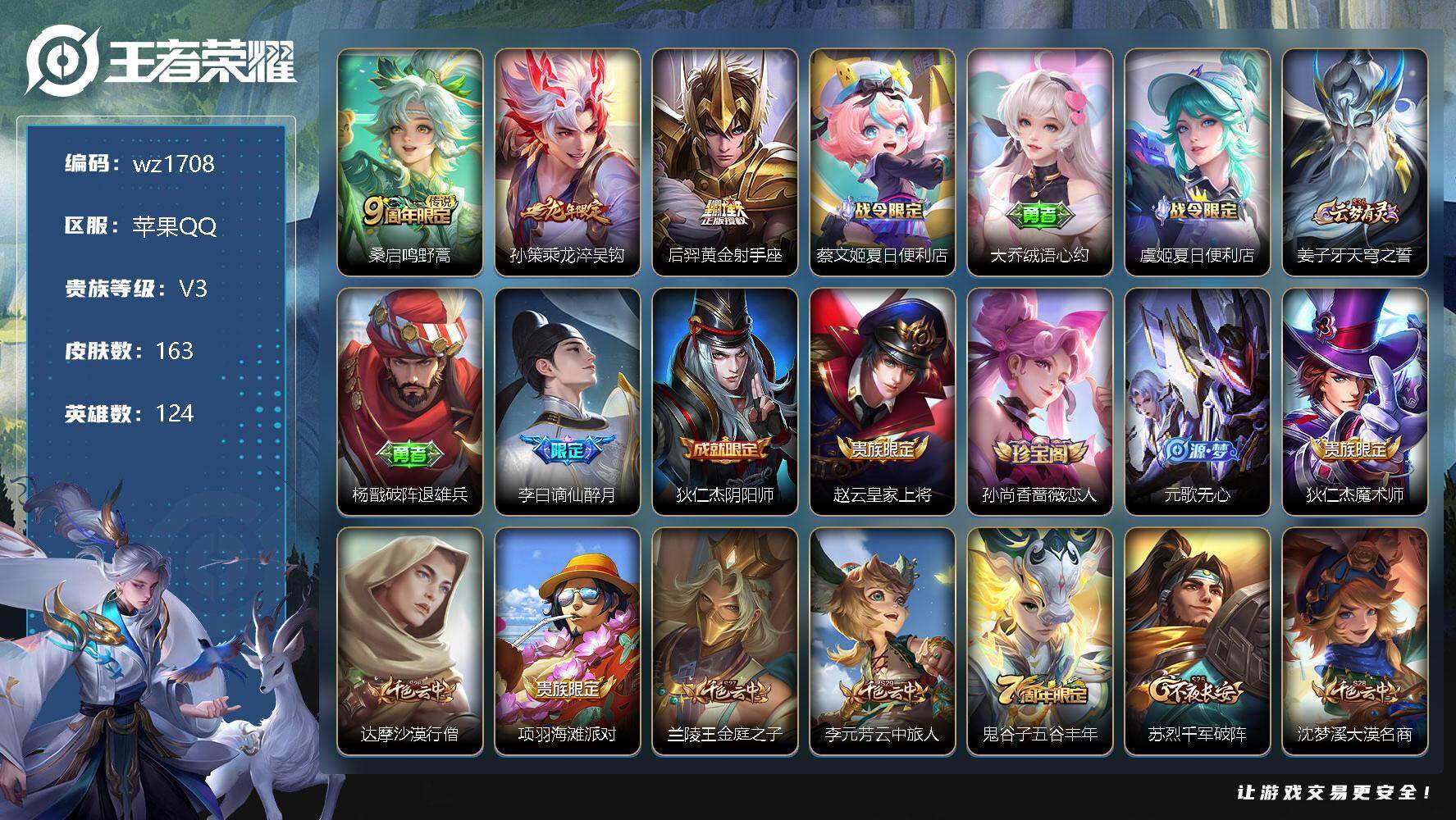 【云游堂】 【可二次实名】【wz1708】【商品标题】:苹果Q-V3-永恒钻石III段位-124英雄-163皮肤-0典藏-0珍品无双-0无双-0珍品传说-3传说-41史诗 【传说皮肤】:桑启鸣野蒿,孙策乘龙淬吴钩,后羿黄金射手座 【限定皮肤】:蔡文姬夏日便利店,大乔绒语心约,虞姬夏日便利店,姜子牙天穹之誓,杨戬破阵退雄兵,李白谪仙醉月,狄仁杰阴阳师,赵云皇家上将,孙尚香蔷薇恋人,元歌无心,狄仁杰魔术师,达摩沙漠行僧,项羽海滩派对,兰陵王金庭之子,李元芳云中旅人,鬼谷子五谷丰年,苏烈千军破阵,沈梦溪大漠名商,裴擒虎李小龙,裴擒虎擒涛扼浪,云中君纤云弄巧,上官婉儿梁祝,鲁班大师探海日志,桑启海盐诗旅,阿古朵江河有灵,张良古海寻踪,高渐离燃音魔法,妲己灵卜魔法,鬼谷子天穹祈灯,孙策乘龙淬吴钩,沈梦溪龙舞盛年,鲁班七号蔬乡物语,李元芳蔬乡物语,刘邦剑破天穹,程咬金群星魔术团,镜青焰无极,项羽苍威无极,刘备异域游侠,周瑜熔金海岸 【年限皮肤】:孙策乘龙淬吴钩 【赛季限定】:达摩沙漠行僧,兰陵王金庭之子,张良古海寻踪,李元芳云中旅人,苏烈千军破阵,沈梦溪大漠名商,裴擒虎擒涛扼浪,鲁班大师探海日志,桑启海盐诗旅,鬼谷子天穹祈灯,刘邦剑破天穹,姜子牙天穹之誓 【战令限定】:蔡文姬夏日便利店,虞姬夏日便利店,高渐离燃音魔法,妲己灵卜魔法,鲁班七号蔬乡物语,李元芳蔬乡物语,镜青焰无极,项羽苍威无极 【史诗皮肤】:阿轲暗夜猫娘,赵云皇家上将,赵云未来纪元,甄姬冰雪圆舞曲,王昭君偶像歌手,狄仁杰魔术师,宫本武藏鬼剑武藏,孙尚香蔷薇恋人,孙尚香水果甜心,妲己魅力维加斯,妲己女仆咖啡,吕布圣诞狂欢,曹操幽灵船长,张飞乱世虎臣,花木兰水晶猎龙者,刘邦德古拉伯爵,夏侯惇乘风破浪,亚瑟心灵战警,安琪拉心灵骇客,刘禅天才门将,李元芳逐浪之夏,阿轲节奏热浪,狄仁杰鹰眼统帅,上官婉儿梁祝,裴擒虎李小龙,云中君纤云弄巧,杨戬天秀启明,澜赏金猎手,鬼谷子五谷丰年,元歌无心,刘禅电玩爆裂旋风,阿古朵江河有灵,妲己灵卜魔法,高渐离燃音魔法,鲁班七号蔬乡物语,镜青焰无极,蔡文姬夏日便利店,马可波罗星界特工,李白谪仙醉月,狂铁龙之律动,后羿石田雨龙,黄忠百相守梦 【其他皮肤】:项羽海滩派对,韩信教廷特使,韩信街头霸王,赵云白执事,赵云忍炎影,芈月红桃皇后,白起白色死神,牛魔西部大镖客,扁鹊化身博士,宫本武藏未来纪元,妲己少女阿狸,典韦黄金武士,亚瑟死亡骑士,花木兰兔女郎,甄姬花好人间,狄仁杰阴阳师,刘备纽约教父,关羽龙腾万里,钟无艳海滩丽影,王昭君幻想奇妙夜,孙尚香沉稳之力,鬼谷子幻乐之宴,大乔守护之力,小乔丁香结,吕布野性能量,沈梦溪鲨炮海盗猫,哪吒次元突破,鲁班七号黑桃队长,狂铁特工战影,露娜瓷语鉴心,鲁班大师乓乓大师,苏烈千军破阵,达摩沙漠行僧,兰陵王金庭之子,沈梦溪大漠名商,蒙恬蔚蓝守将,李元芳云中旅人,刘备潮玩造梦师,桑启海盐诗旅,猪八戒潮玩探月行,裴擒虎擒涛扼浪,太乙真人劲辣红锅,鲁班大师探海日志,李元芳妄想特派,哪吒热血海滩,张良古海寻踪,钟无艳聚星闪耀,曹操决胜大满贯,鬼谷子天穹祈灯,妲己灵卜魔法,海诺时空谍影,嫦娥漠中幻影,朵莉亚金色潮汐,廉颇功夫炙烤,亚瑟鸿运当头,沈梦溪龙舞盛年,钟无艳春野之旅,李元芳蔬乡物语,刘邦剑破天穹,程咬金群星魔术团,项羽苍威无极,大司命暗都幽影,刘备异域游侠,杨戬破阵退雄兵,貂蝉长夏之忆,姜子牙天穹之誓,周瑜熔金海岸,虞姬夏日便利店,大乔绒语心约,东皇太一噬灭天穹,米莱狄怪诞之夜,吕布逐霄战戟,苍苍林狼骑,太乙真人谧流熔炉,姜子牙星梦巡礼,钟馗虚灵犬护,阿古朵布丁狗之约,甄姬逆浪荇歌,莱西奥踏浪烽翎,鲁班七号福禄兄弟,貂蝉异域舞娘,老夫子潮流仙人,王昭君精灵公主,狄仁杰锦衣卫,曹操超能战警,小乔万圣前夜,孙膑未来旅行,孙悟空西部大镖客,李白范海辛,李元芳特种部队,虞姬加勒比小姐,雅典娜战争女神,马可波罗激情绿茵,苍维京掠夺者,杨戬埃及法老,诸葛亮星航指挥官,黄忠芝加哥教父,干将莫邪第七人偶,百里守约绝影神枪,百里玄策威尼斯狂欢,苏烈爱与和平,梦奇美梦成真,公孙离花间舞,杨玉环霓裳曲,弈星踏雪寻梅,米莱狄精准探案法,李信灼热之刃,盘古创世神祝,瑶森,云中君荷鲁斯之眼,曜归虚梦演,蒙犽归虚梦演,镜冰刃幻境,蒙恬秩序猎龙将,澜孤猎,司空震启蛰,云缨赤焰之缨,金蝉前尘,暃碧珀绯影 【内测皮肤】:孙尚香蔷薇恋人,狂铁特工战影 【营地ID】:1769845159