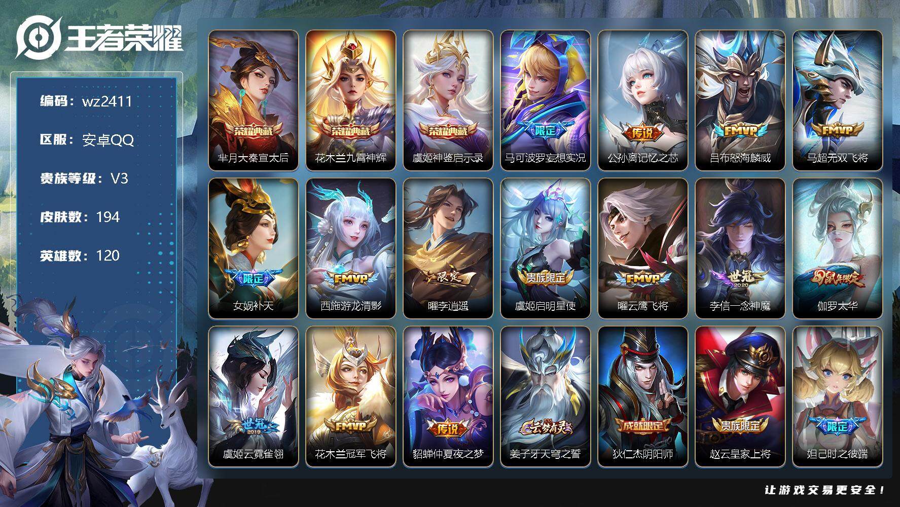 【云游堂】 【可二次实名】【wz2411】安卓Q-V3-尊贵铂金I段位-120英雄-194皮肤-3典藏-0珍品无双-0无双-0珍品传说-14传说-60史诗 【英雄全皮】:鲁班大师全皮 【荣耀典藏】:芈月大秦宣太后,花木兰九霄神辉,虞姬神鉴启示录 【传说皮肤】:马可波罗妄想实况,公孙离记忆之芯,吕布怒海麟威,马超无双飞将,女娲补天,西施游龙清影,曜李逍遥 ,虞姬启明星使,曜云鹰飞将,李信一念神魔,伽罗太华,虞姬云霓雀翎,花木兰冠军飞将,貂蝉仲夏夜之梦 【限定皮肤】:姜子牙天穹之誓,狄仁杰阴阳师,赵云皇家上将,妲己时之彼端,孙尚香蔷薇恋人,庄周玄嵩,庄周高山流水,钟无艳超时空战士,白起夜都怪侠,芈月重明,芈月幻夜卜梦,元歌无心,夏侯惇朔风刀,甄姬落雪兰心,典韦穷奇,马可波罗妄想实况,狄仁杰魔术师,狄仁杰万华元夜,达摩沙漠行僧,项羽海滩派对,老夫子醍醐杖,程咬金演武夺筹,刘邦夺宝奇兵,王昭君凤凰于飞,王昭君午后时光,兰陵王金庭之子,花木兰青春决赛季,花木兰瑞麟志,花木兰默契交锋,牛魔御旌,李元芳云中旅人,虞姬启明星使,钟馗驱傩正仪,杨玉环寅虎心曲,女娲补天,雅典娜黎明之约,蔡文姬繁星吟游,鬼谷子原初探秘者,鬼谷子五谷丰年,黄忠火炮绅士,苏烈千军破阵,弈星混沌棋,梦奇顽趣,沈梦溪大漠名商,沈梦溪匿光破解者,明世隐疑决卦,明世隐吟游魔法,裴擒虎李小龙,裴擒虎擒涛扼浪,狂铁御狮,狂铁电玩高手,云中君纤云弄巧,伽罗太华,盾山御銮,猪八戒猪悟能,上官婉儿梁祝,上官婉儿神器万象笔,嫦娥拒霜思,嫦娥暖冬兔眠,曜李逍遥 ,鲁班大师匿光启智者,鲁班大师探海日志,桑启海盐诗旅,暃星界游侠,张良古海寻踪,鬼谷子天穹祈灯,周瑜熔金海岸 【年限皮肤】:花木兰瑞麟志,杨玉环寅虎心曲,王昭君凤凰于飞,伽罗太华,庄周玄嵩 【赛季限定】:芈月重明,夏侯惇朔风刀,典韦穷奇,狄仁杰万华元夜,达摩沙漠行僧,老夫子醍醐杖,程咬金演武夺筹,兰陵王金庭之子,张良古海寻踪,牛魔御旌,李元芳云中旅人,钟馗驱傩正仪,雅典娜黎明之约,鬼谷子原初探秘者,苏烈千军破阵,弈星混沌棋,梦奇顽趣,沈梦溪大漠名商,明世隐疑决卦,裴擒虎擒涛扼浪,狂铁御狮,盾山御銮,鲁班大师探海日志,桑启海盐诗旅,鬼谷子天穹祈灯,姜子牙天穹之誓 【战令限定】:钟无艳超时空战士,白起夜都怪侠,芈月幻夜卜梦,甄姬落雪兰心,刘邦夺宝奇兵,王昭君午后时光,黄忠火炮绅士,明世隐吟游魔法,狂铁电玩高手,嫦娥暖冬兔眠,暃星界游侠 【史诗皮肤】:露娜紫霞仙子,阿轲暗夜猫娘,赵云皇家上将,甄姬冰雪圆舞曲,王昭君偶像歌手,狄仁杰魔术师,宫本武藏鬼剑武藏,孙尚香蔷薇恋人,孙尚香水果甜心,嬴政摇滚巨星,妲己魅力维加斯,妲己女仆咖啡,墨子金属风暴,吕布圣诞狂欢,张飞乱世虎臣,韩信白龙吟,王昭君凤凰于飞,花木兰水晶猎龙者,刘邦德古拉伯爵,夏侯惇乘风破浪,小乔缤纷独角兽,兰陵王暗隐猎兽者,雅典娜冰冠公主,花木兰青春决赛季,铠曙光守护者,蔡文姬舞动绿茵,李元芳逐浪之夏,程咬金功夫厨神,白起星夜王子,孙策猫狗日记,花木兰瑞麟志,狄仁杰鹰眼统帅,公孙离无限星赏官,上官婉儿梁祝,蔡文姬繁星吟游,妲己时之彼端,庄周玄嵩,瑶遇见神鹿,裴擒虎李小龙,云中君纤云弄巧,花木兰默契交锋,西施诗语江南,猪八戒猪悟能,庄周高山流水,嫦娥拒霜思,黄忠火炮绅士,雅典娜黎明之约,杨玉环寅虎心曲,夏洛特永昼,明世隐吟游魔法,狂铁电玩高手,鲁班大师匿光启智者,钟无艳超时空战士,鬼谷子五谷丰年,上官婉儿神器万象笔,元歌无心,梦奇顽趣,暃星界游侠,沈梦溪匿光破解者,莱西奥末日机甲 【其他皮肤】:项羽海滩派对,韩信教廷特使,露娜哥特玫瑰,达摩大发明家,赵云白执事,赵云忍炎影,芈月红桃皇后,扁鹊化身博士,妲己少女阿狸,亚瑟死亡骑士,达摩拳王,花木兰兔女郎,张飞五福同心,狄仁杰阴阳师,刘备汉昭烈帝,关羽龙腾万里,墨子进击墨子号,钟无艳海滩丽影,王昭君幻想奇妙夜,芈月重明,狂铁命运角斗场,老夫子功夫老勺,孙尚香沉稳之力,典韦穷奇,李白敏锐之力,鬼谷子幻乐之宴,狂铁御狮,明世隐虹云星官,牛魔御旌,小乔丁香结,盾山御銮,沈梦溪鲨炮海盗猫,姜子牙炽热元素使,夏侯惇朔风刀,弈星混沌棋,哪吒次元突破,鲁班七号黑桃队长,明世隐疑决卦,刘邦夺宝奇兵,盾山圆桌骑士,老夫子醍醐杖,狂铁特工战影,鬼谷子原初探秘者,狄仁杰万华元夜,程咬金演武夺筹,张良缤纷绘卷,钟馗驱傩正仪,鲁班大师乓乓大师,苏烈千军破阵,达摩沙漠行僧,芈月幻夜卜梦,刘邦虎啸剑宗,白起夜都怪侠,兰陵王金庭之子,刘禅唤灵魔甲,米莱狄契约魔法,王昭君午后时光,沈梦溪大漠名商,蒙恬蔚蓝守将,甄姬落雪兰心,李元芳云中旅人,戈娅危途狂花,刘备潮玩造梦师,桑启海盐诗旅,嫦娥暖冬兔眠,海月幻泉雾影,牛魔牛运亨通,赵怀真太极少年,裴擒虎擒涛扼浪,莱西奥西部游侠,鲁班大师探海日志,李元