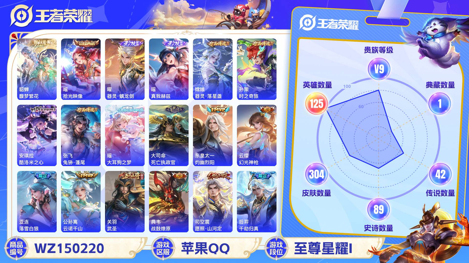 【云游堂】 苹果qq/最强王者/302皮肤/125英雄/2典藏/1珍品无双/3无双/4珍品传说/28传说/73史诗/9稀有英雄