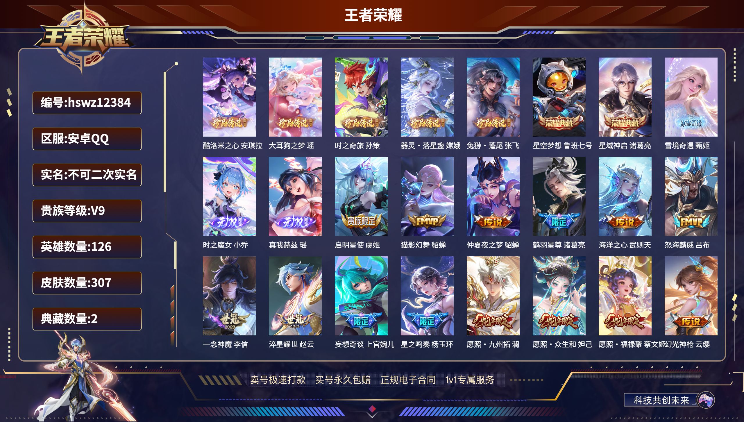 【云游堂】 安卓qq/永恒钻石/307皮肤/126英雄/2典藏/1珍品无双/3无双/5珍品传说/20传说/87史诗/10稀有英雄