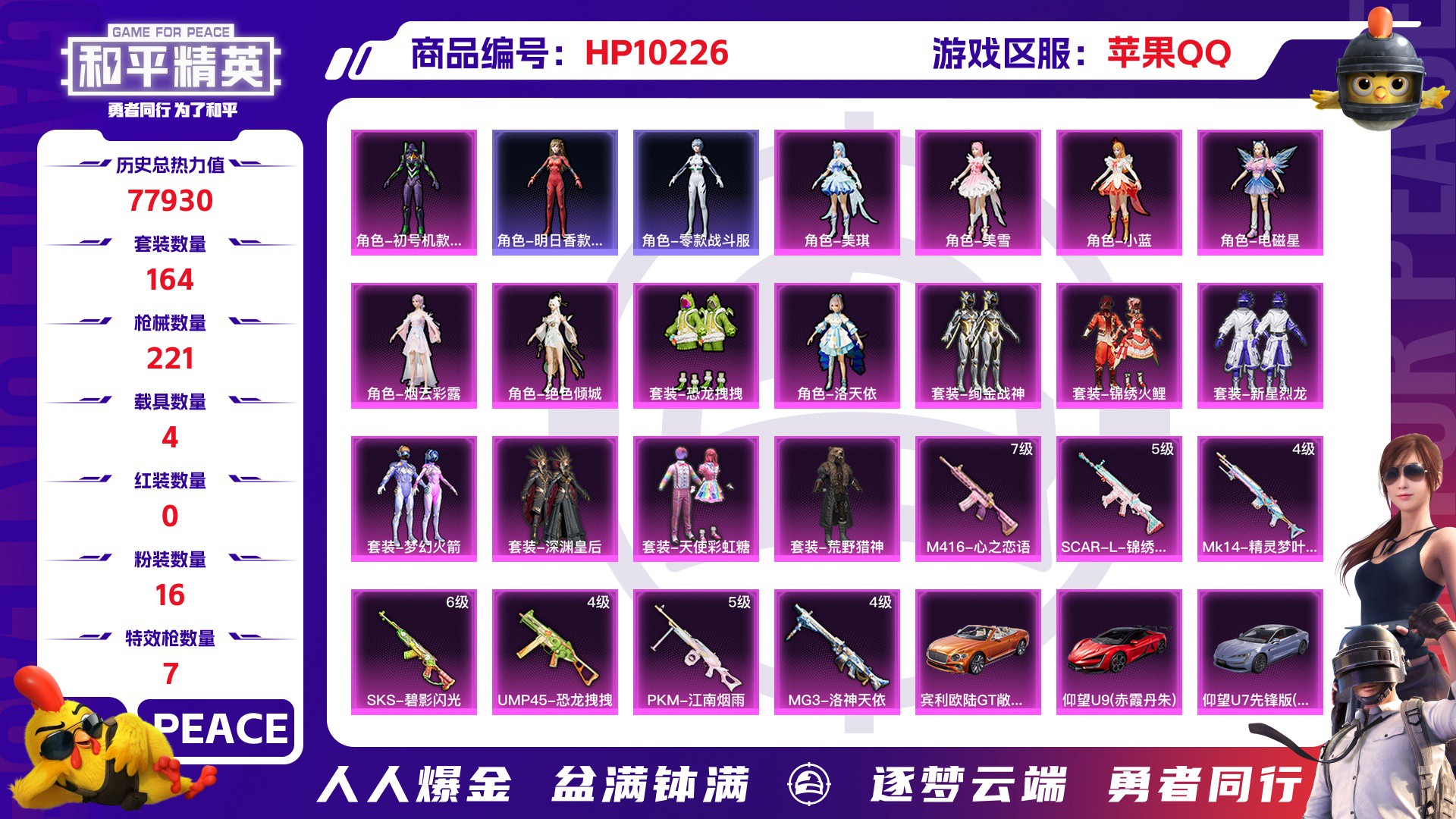 【云游堂】 2178634-苹果q-8载具9粉装6特效呛【8载具】路特斯el灰色宾利欧陆gt火焰橘玛莎拉蒂粉色特斯拉r沁心粉幻影随行焰龙咆哮赤兔空客蔚蓝之翼僚机【9粉装】千金淑猫未来领航者放客神游莲影清波数码大师绚金战神星之彼岸相思残雪炙焰赤龙【6特效呛】m416-心之恋语(7级)kar98k-巳巳如意(5级)dp-28-豹影疾电(4级)m762-激战未来(5级)akm-梦之光华(5级)scar-l-机甲封神(6级)【12热门】2b战斗服款金羽特工梨园星光团圆交子瑞龙福将粉红小猪忍者信条破蛋小黄鸡弄潮海豚m416-梨园星光m762-瑞龙福将awm-激战未来【2飞行器】机甲封神飞行器深渊漩涡飞行器【2头盔】百万伏特头盔幻影战神头盔【3背包】百万伏特背包深海小丑鱼背包深海曼妙背包营地id:762318461