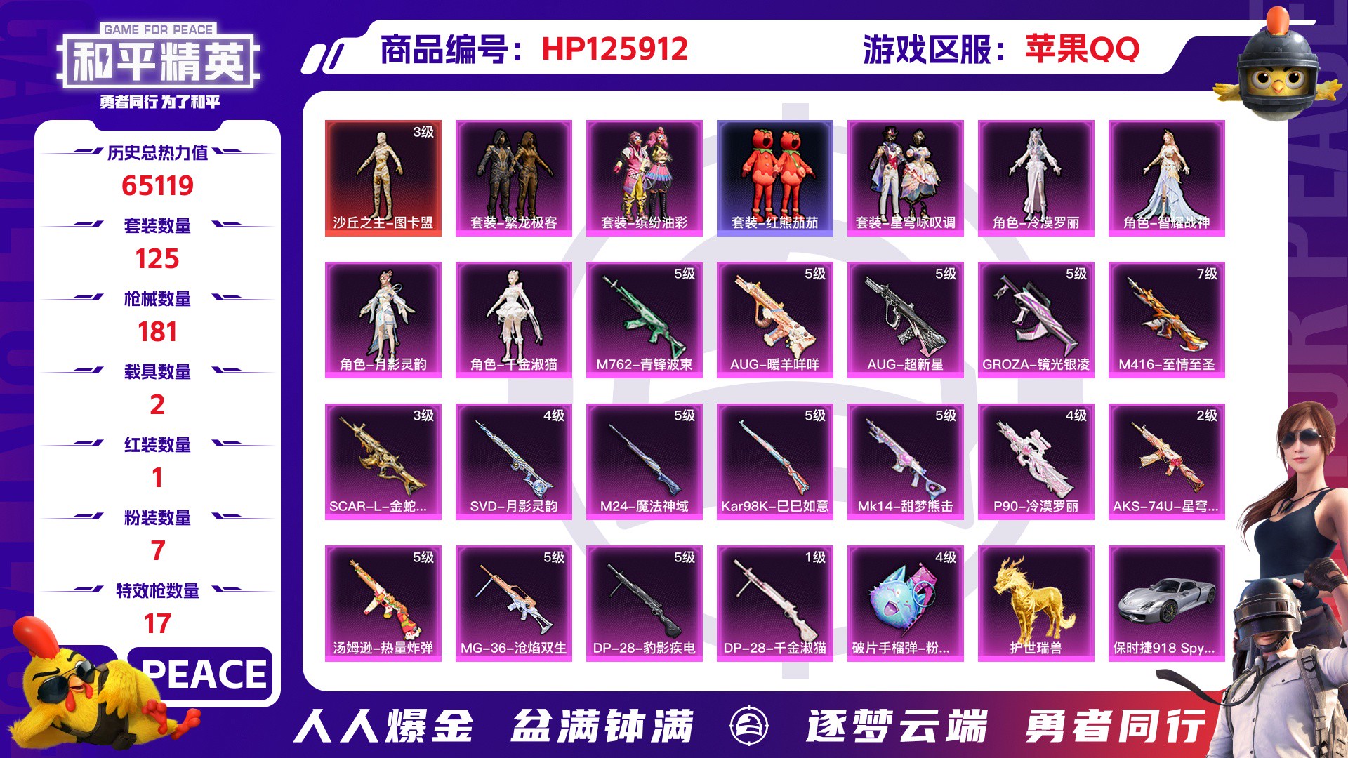 【云游堂】 2180628-无二次-苹果q-2红装8稀有4载具23粉装23特效呛32热门296套装400呛皮148261热力值16印记5卓越2传奇1绝世历史无敌战神ss31赛季战神框精品身法女素材号3级图卡盟1级初翊寒蝎都市金鞋梦幻火箭三姐妹6级女娲哈利女小丑蜜语绒猫未来歌姬小可发光眼罩第五大道兔兔白日梦身法鲨鱼裤胖达nv战队服rw战队服红眼罩粉熊包【2红装】辉羽雀灵-初翊(1级)沙丘之主-图卡盟(3级)【8稀有】奇异狩猎者寒蝎幽灵m416-星际漫游akm-缤纷海域都市猎人浪漫天命派对舞王派对舞王(金靴子)【4载具】虚妄之影(炫耀紫)冰绡玉鳞黑曜夜骑辉羽雀灵自行车【23粉装】狂魅哈莉梦幻火箭蜜语绒猫宝贝奶油派天使彩虹糖甜心巧克力千金淑猫深海曼妙未来歌姬星穹咏叹调冷漠罗丽呆萌星弥小可学妹幻影战神放客神游仲夏莫吉托挚爱序曲纯珍童话第五大道繁龙极客暗夜鎏金炙焰牛王星之彼岸【23特效呛】scar-l-锦绣绵绵(5级)m416-心之恋语(1级)m416-灵猫魔法师(1级)m416-女娲灵识(6级)p90-冷漠罗丽(4级)akm-甜心宝贝(6级)akm-炫紫旋律(1级)aks-74u-星穹咏叹调(3级)kar98k-巳巳如意(5级)mg3-酷泡奶龙(5级)mg3-辉羽雀灵(2级)mg-36-沧焰双生(3级)dp-28-千金淑猫(1级)dp-28-豹影疾电(5级)aug-超新星(5级)mk14-甜梦熊击(5级)m24-镜域双华(3级)m762-激战未来(5级)汤姆逊-热量炸弹(5级)m417-第五大道(5级)scar-l-青春物语(5级)破片手留单-热量炸弹(5级)盐雾蛋-甜梦果泡(2级)【32热门】龟仙人浪漫假日雪山精英东方飞龙动感兔斯基呆萌铁蟹鹰眼刺客兔兔白日梦银碳小老虎激萌罗小黑迅捷狂鲨深海小丑鱼胖达圆圆nv战队服rw战队服暗影哥特团圆交子瑞龙福将粉红小猪忍者信条水银刺客狂沙舞者漫步者机械英豪破蛋小黄鸡极速红龙军刀雅典娜弄潮海豚m762-奇异狩猎者m762-瑞龙福将m24-奇异狩猎者s686-奇异狩猎者【3飞行器】龙翔九天飞行器齐天大圣飞行器繁龙极客飞行器【3头盔】甜心宝贝头盔幻影战神头盔深海小丑鱼头盔【6背包】梦幻火箭背包甜心宝贝背包幻影战神背包萌熊伴侣背包深海小丑鱼背包夏日绵绵冰背包营地id:735051556