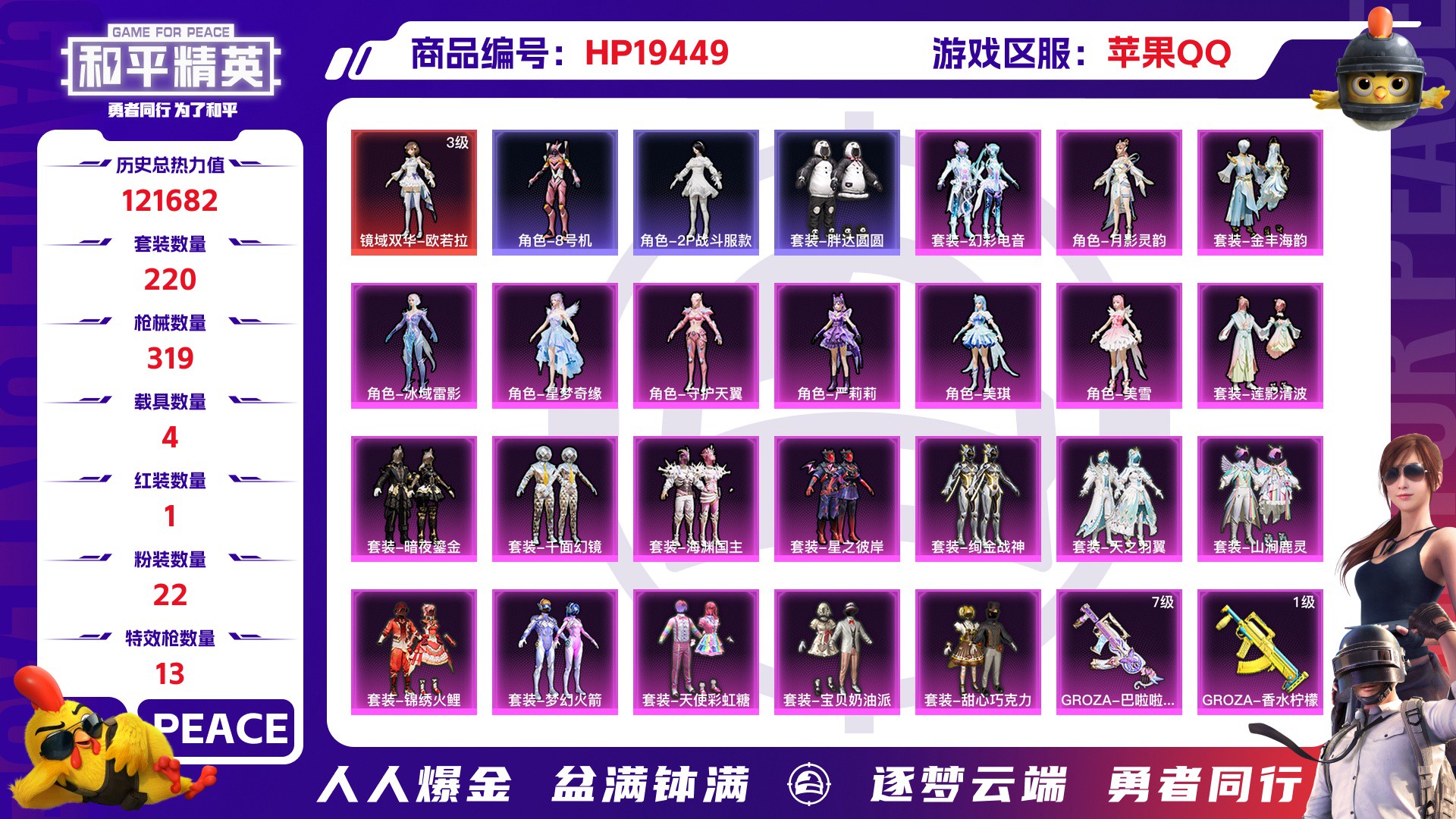 【云游堂】 【可二次实名】2190218-可二次苹果q-2红装1稀有2载具13粉装7特效呛21热门113套装175呛皮59785热力值7印记历史超级王牌14星素材号2级欧若拉2级敖渊金迪迦梦幻火箭金赛罗浪漫波比金羽【2红装】墨龙九天-敖渊(2级)镜域双华-欧若拉(2级)【1稀有】akm-百万伏特【2载具】玛莎拉蒂q蓝色特斯拉r水滴蓝【13粉装】梦幻火箭光极星羊梦糖心闲梦青缨冰霜白皇炙焰红王星之彼岸烈焰拳霸炙焰赤龙飓风飞鹰赛罗闪耀型闪耀迪迦型蜜桃特工【7特效呛】scar-l-锦绣绵绵(5级)m416-心之恋语(5级)dp-28-豹影疾电(4级)m24-镜域双华(3级)aug-星之彼岸(7级)vss-烈焰拳霸(3级)dp-28-呛炮玫瑰(4级)【21热门】龟仙人雪山精英好奇恐龙浪漫波比金羽特工迪迦奥特曼赛罗奥特曼团圆交子瑞龙福将星河浪客漫步者白虎圣者朱雀圣者玄武圣者青龙圣者破蛋小黄鸡m416-仓鼠灰灰m762-潮萌小黄鸭m762-瑞龙福将kar98k-深海曼妙m762-风花雪月【4飞行器】龙翔九天飞行器梦幻火箭飞行器春暖花开飞行器呛炮玫瑰飞行器【3头盔】梦幻火箭头盔百万伏特头盔夏日绵绵冰头盔【3背包】梦幻火箭背包百万伏特背包深海曼妙背包营地id:771618551