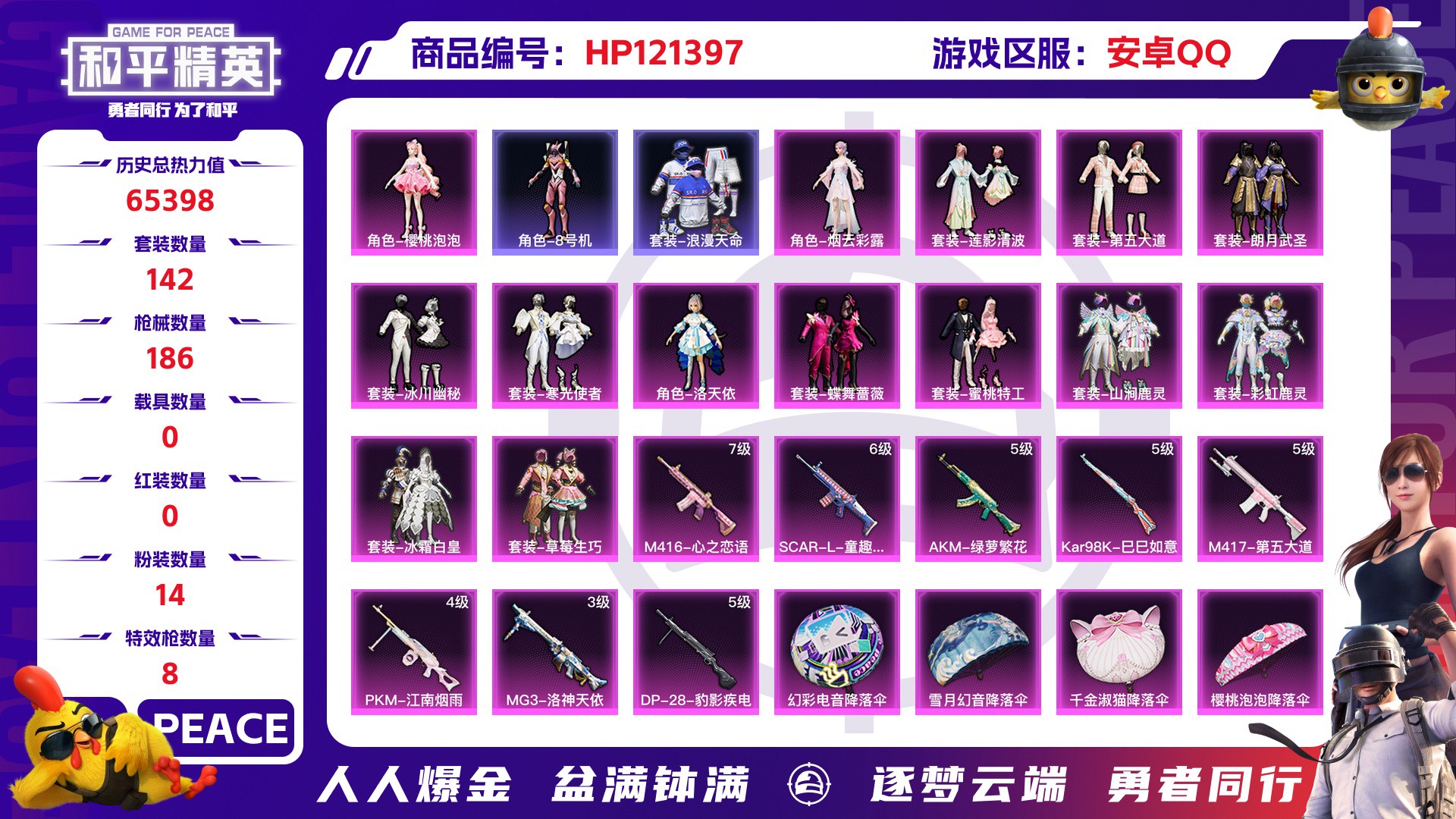 【云游堂】 【可包人脸】黄紫螳螂 !都市猎人!星际漫游!玛莎拉蒂Ghibli(粉)!粉熊背包!D10651.安卓QQ.7粉5枪3车 .营地id:780320601. 【热力值】36533【稀有资产数量】8 【套装数量】70 【枪械数量】104 【粉枪械数量】5 【粉套装数量】7 【载具数量】3 【飞行器数量】1 【稀有资产】角色-初号机款机体服/角色-零号机款机体服/角色-明日香款战斗服/角色-真理款战斗服/角色-薰款战斗服/角色-真嗣款战斗服/套装-都市猎人/M416-星际漫游 【粉色套装】套装-宝贝奶油派/套装-梦幻火箭/套装-暗夜鎏金/套装-纯珍童话/套装-挚爱序曲 【粉色枪皮】M416-五爪金龙[5级]/AKM-炫紫旋律[4级]/SCAR-L-童趣迷兔[4级]/GROZA-旋转彩虹[5级]/Kar98K-巳巳如意[3级] 【载具】玛莎拉蒂Ghibli(粉)/极速兔兔车/迈伦570S(天际蓝) 【飞行器】暖熊萌萌飞行器 【珍稀背包】百万伏特背包(1级)/萌熊伴侣背包(3级)