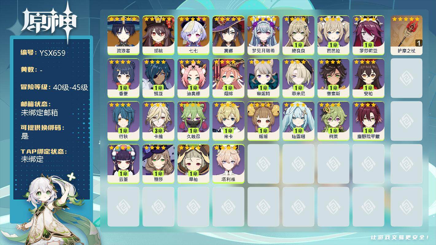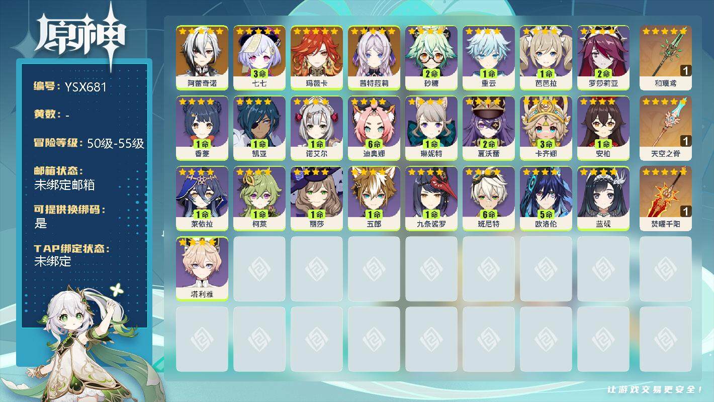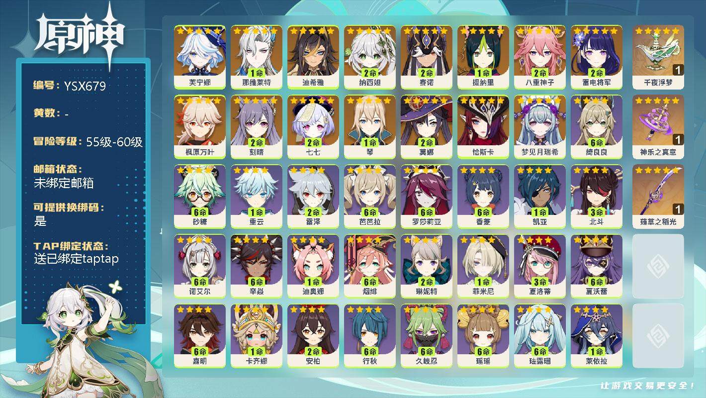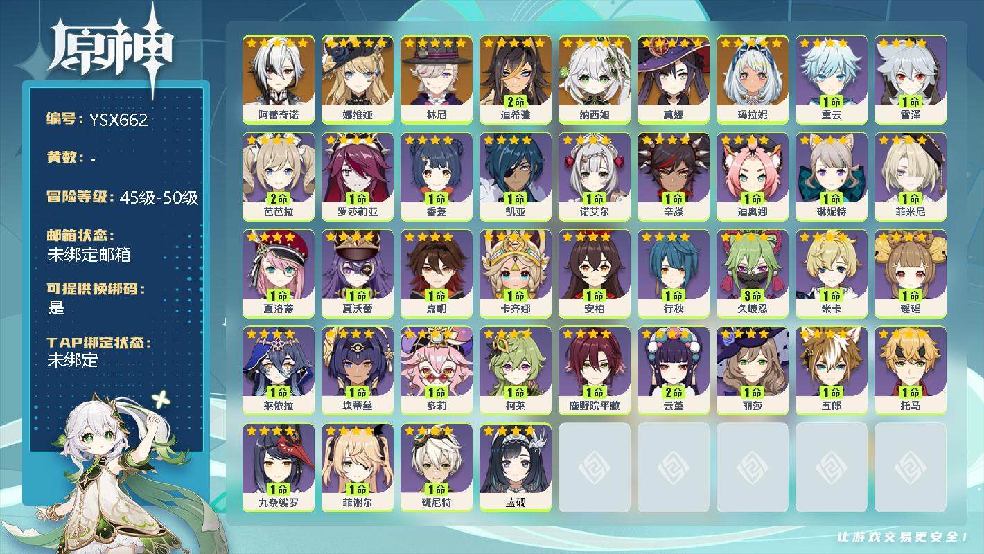 【云游堂】 【ysx662】50级/女主/8个五星角色/0命玛拉妮/0命阿蕾奇诺/0命娜维娅/0命林尼/2命迪希雅/0命纳西妲/0命莫娜/0命蓝砚/0命卡齐娜/1命嘉明/0命夏沃蕾/0命夏洛蒂/1命菲米尼/0命琳妮特/0命米卡/1命瑶瑶/0命莱依拉/0命坎蒂丝/1命多莉/0命柯莱/1命鹿野院平藏/3命久岐忍/2命云堇/1命五郎/0命托马/0命九条裟罗/0命罗莎莉亚/0命辛焱/1命迪奥娜/1命雷泽/1命菲谢尔/0命丽莎/0命香菱/1命安柏/1命班尼特/0命行秋/2命芭芭拉/1命诺艾尔/0命凯亚/0命重云