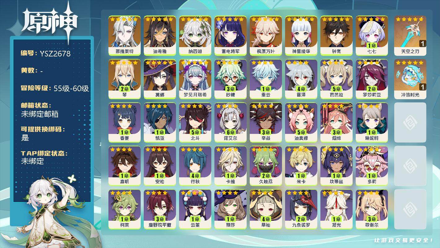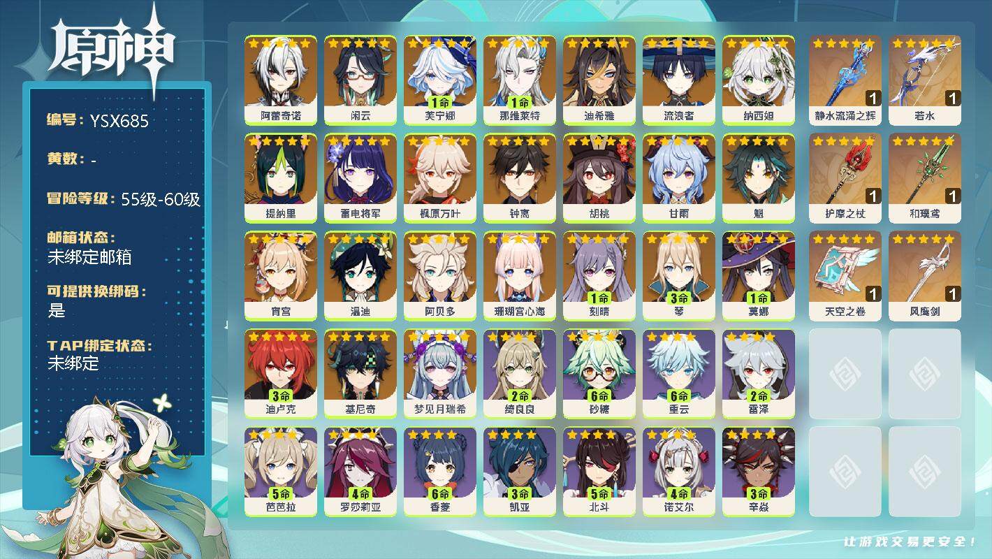 【云游堂】 【ysa594】60级/50黄/女主/39个五星角色/11个五星武器/0命丝柯克/0命希诺宁/0命玛拉妮/0命阿蕾奇诺/0命千织/0命娜维娅/0命芙宁娜/0命那维莱特/1命迪希雅/2命纳西妲/0命夜兰/1命珊瑚宫心海/0命雷电将军/0命神里绫华/0命枫原万叶/0命胡桃/0命魈/0命甘雨/0命钟离/0命可莉/2命琴/4命刻晴/0命迪卢克/5命莫娜/精1岩峰巡歌/精1柔灯挽歌/精1静水流涌之辉/精1苇海信标/精1护摩之杖/精1和璞鸢/精2四风原典/精1狼的末路/精1天空之脊/2命塔利雅/0命伊法/0命伊安珊/1命欧洛伦/1命卡齐娜/0命赛索斯/满命嘉明/1命夏沃蕾/0命夏洛蒂/2命菲米尼/3命琳妮特/1命绮良良/1命卡维/3命米卡/满命瑶瑶/满命珐露珊/满命莱依拉/满命坎蒂丝/5命多莉/4命柯莱/满命鹿野院平藏/4命久岐忍/5命云堇/4命五郎/满命托马/5命九条裟罗/满命早柚/满命烟绯/3命罗莎莉亚/满命辛焱/满命迪奥娜/4命砂糖/5命雷泽/满命菲谢尔/1命丽莎/4命北斗/满命香菱/1命安柏/满命班尼特/满命行秋/满命芭芭拉/满命凝光/满命诺艾尔/0命凯亚/4命重云